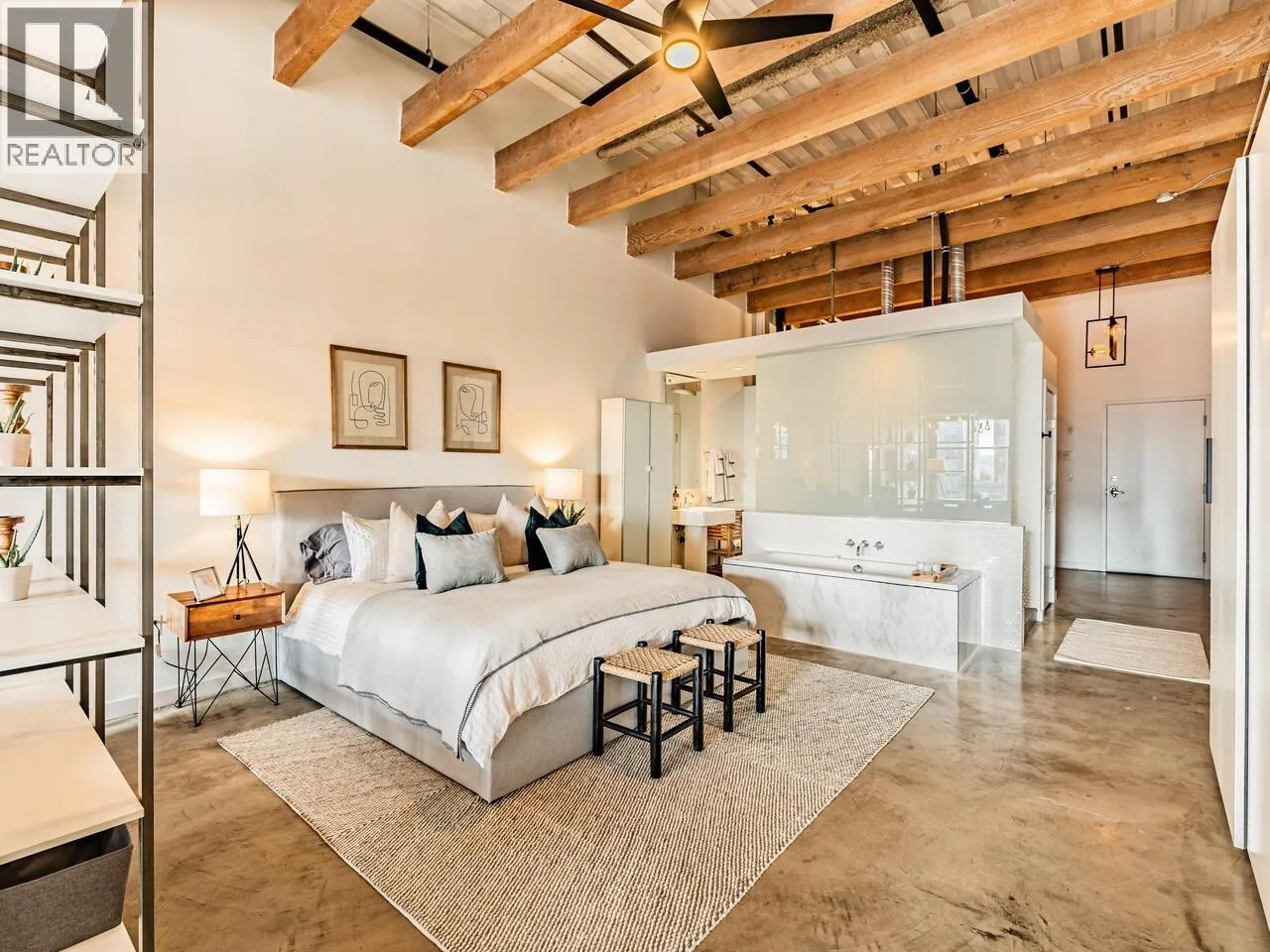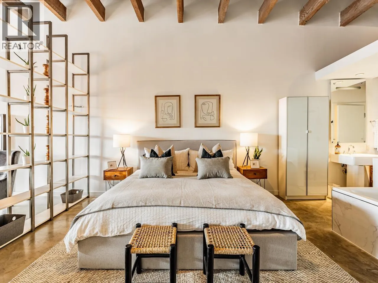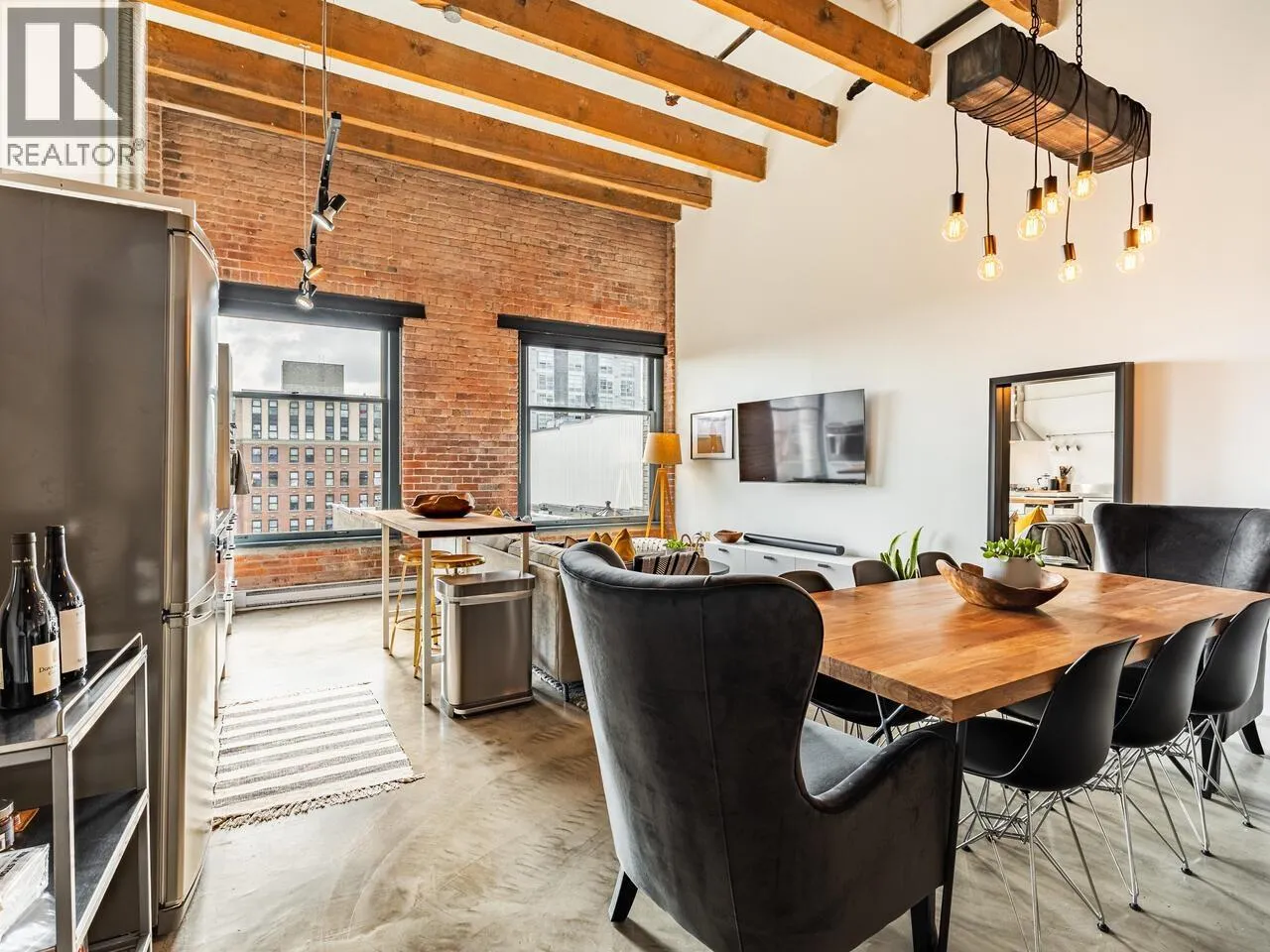 Located in historic Gastown, Koret Lofts offers open plan for New York style loft living. Rarely available 5th floor unit with ultra high ceiling soaring over 15 ft featuring original fir beam and exposed brick wall. This heritage building was converted by Alda Pereira design in 2006, where urban heritage meets modern living with concrete floors, euro kitchen, walk through shower and spa soaker tub. Commercial and residential zoning allows for office/studio/airbnb uses, ideal for home office with live/work space. Gated complex with a beautiful garden courtyard equipped with BBQ..Open House Sun, Oct 19,2025, 2-4pm (id:27476)