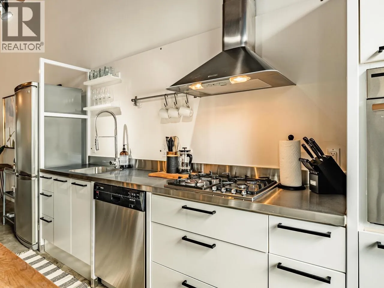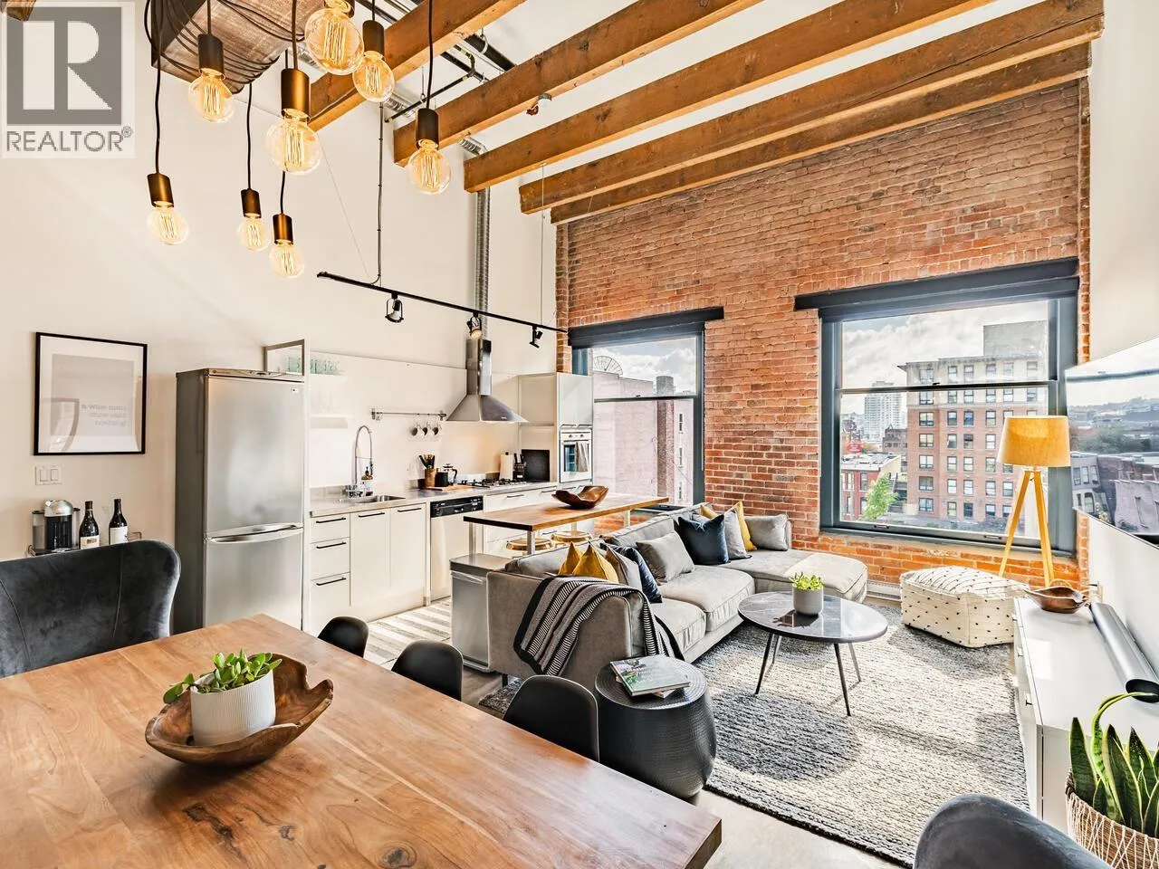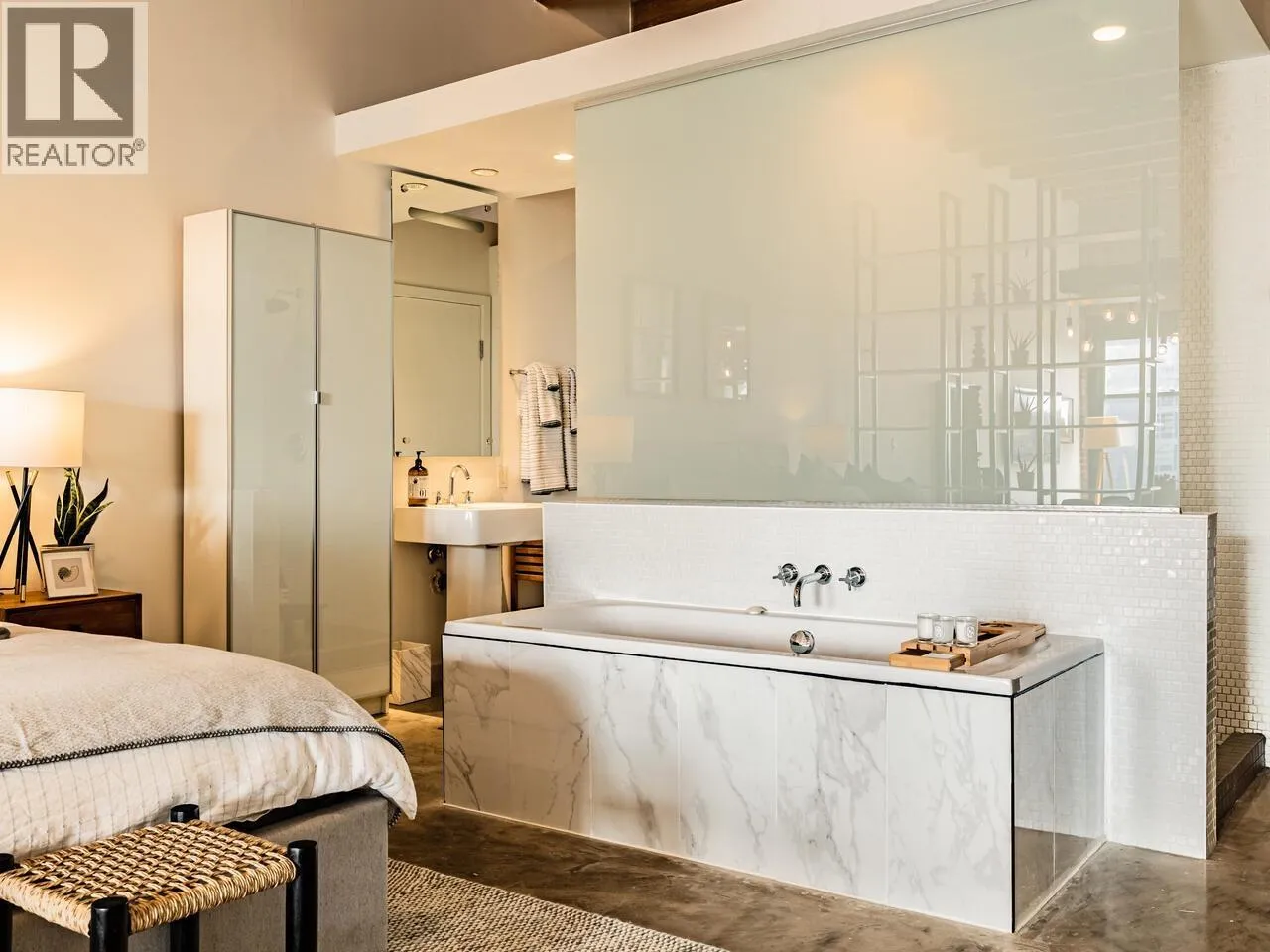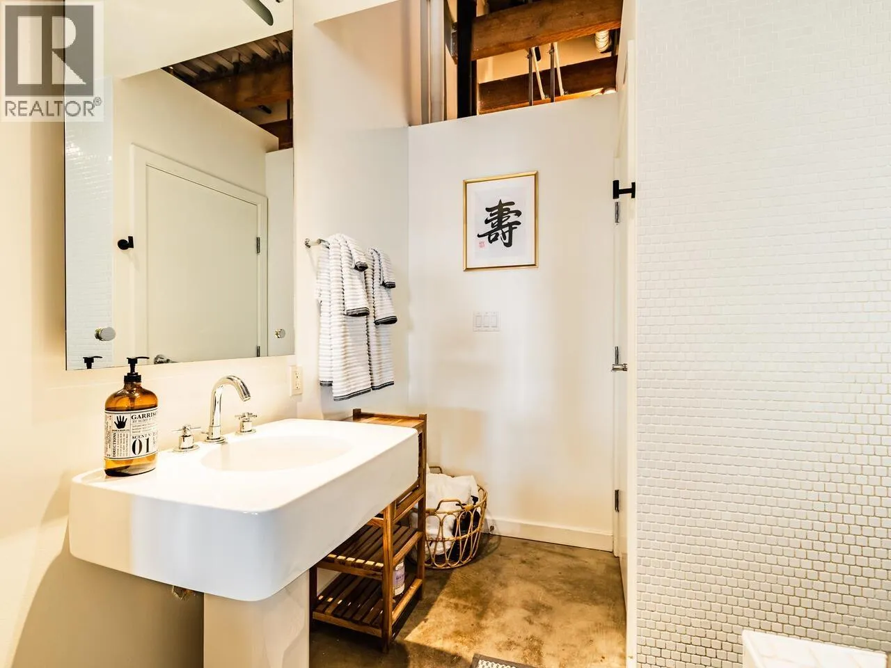 Located in historic Gastown, Koret Lofts offers open plan for New York style loft living. Rarely available 5th floor unit with ultra high ceiling soaring over 15 ft featuring original fir beam and exposed brick wall. This heritage building was converted by Alda Pereira design in 2006, where urban heritage meets modern living with concrete floors, euro kitchen, walk through shower and spa soaker tub. Commercial and residential zoning allows for office/studio/airbnb uses, ideal for home office with live/work space. Gated complex with a beautiful garden courtyard equipped with BBQ..Open House Sun, Oct 19,2025, 2-4pm (id:27476)