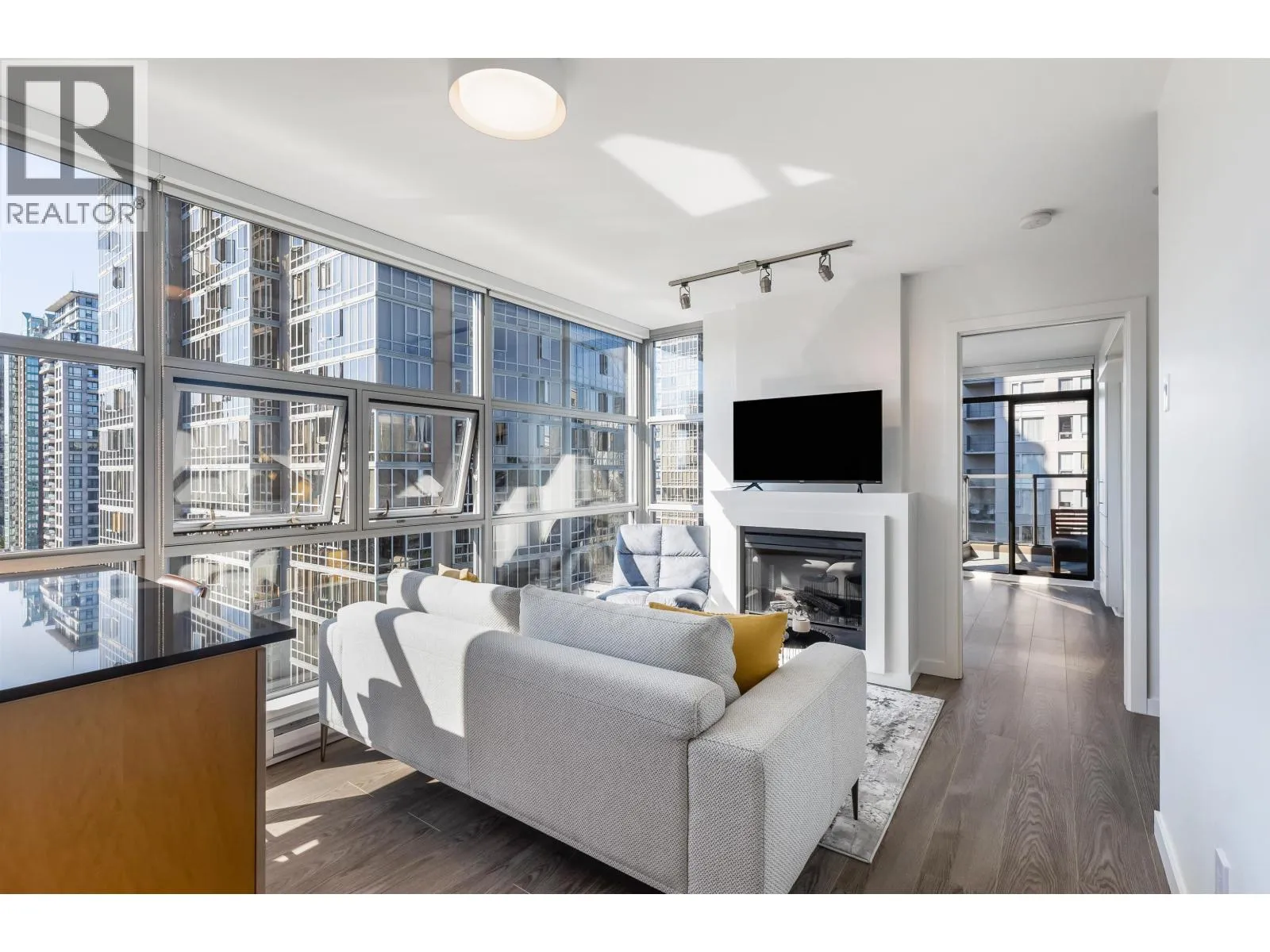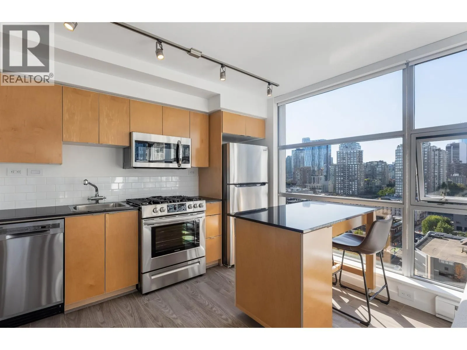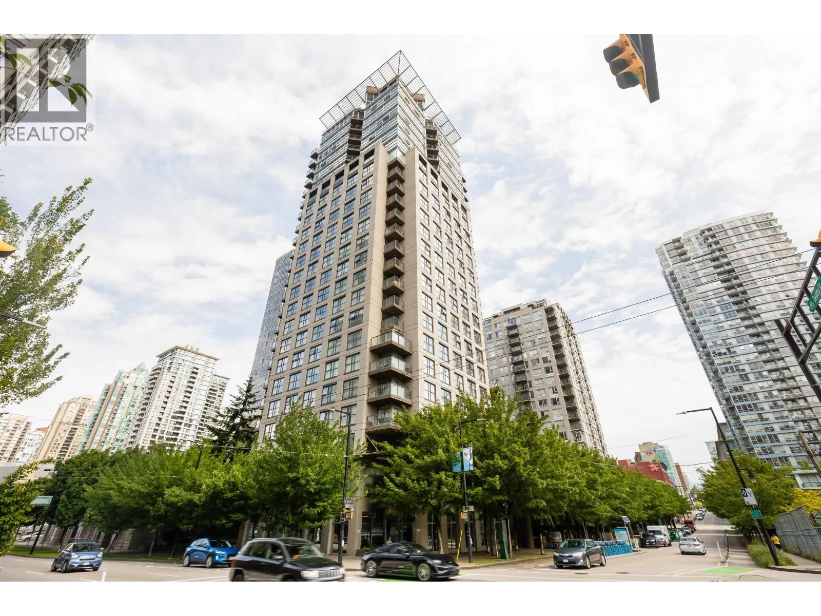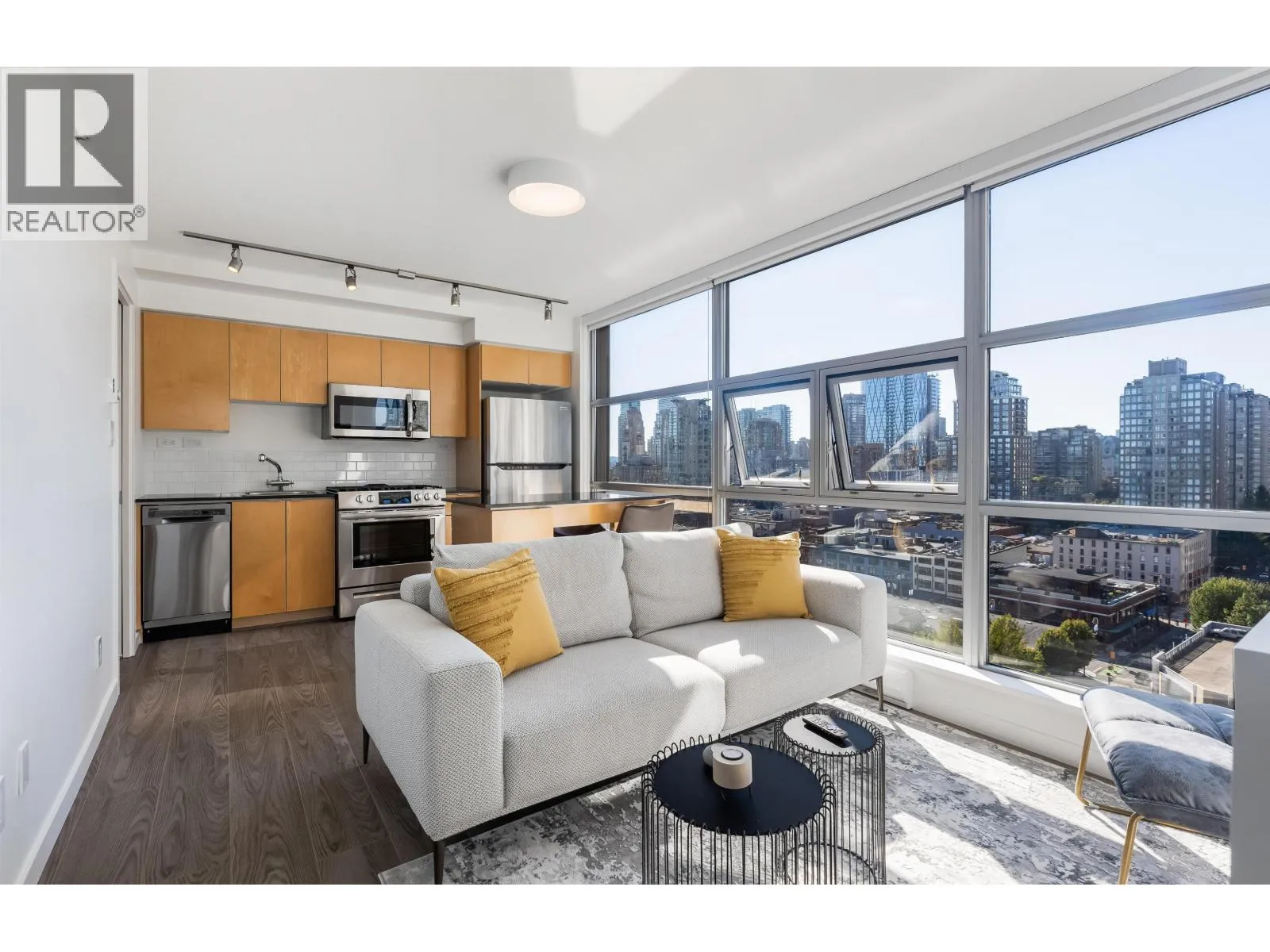 Welcome to Nova by Bosa Developments - An exceptional corner unit in the heart of Yaletown - This one bed + den unit offers a perfect blend of modern comfort & city convenience, just steps away from False Creek & the vibrant Yaletown Hub. Enjoy abundant natural light through floor-to-ceiling windows, highlighting the spacious plan. The kitchen features sleek quartz countertops + updated stainless steel appliances. The generously sized bedroom & versatile den provide the perfect space for both restful nights & a productive home office. Take in stunning city views from your living room or the covered balcony while sipping your morning coffee. Nova offers amenities, including a bike room, hot tub, steam room, fitness center, guest suite, & party room. One Parking (EV Ready) + One Locker. (id:27476)