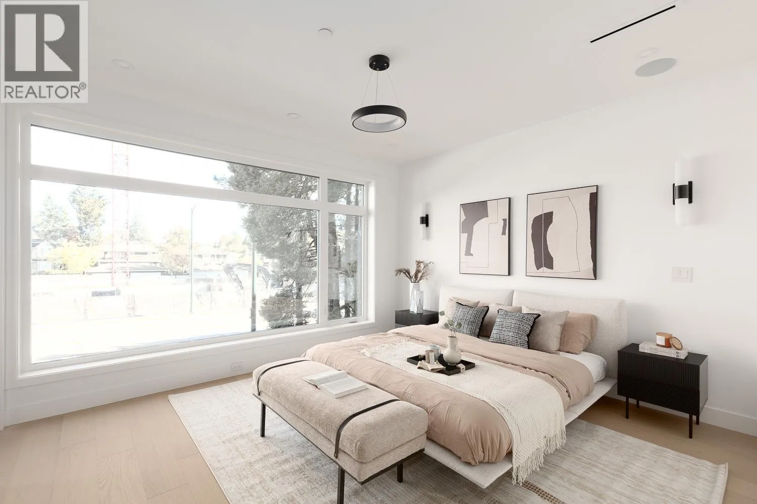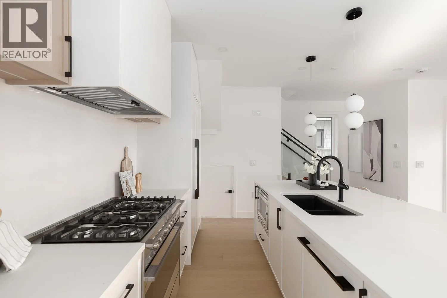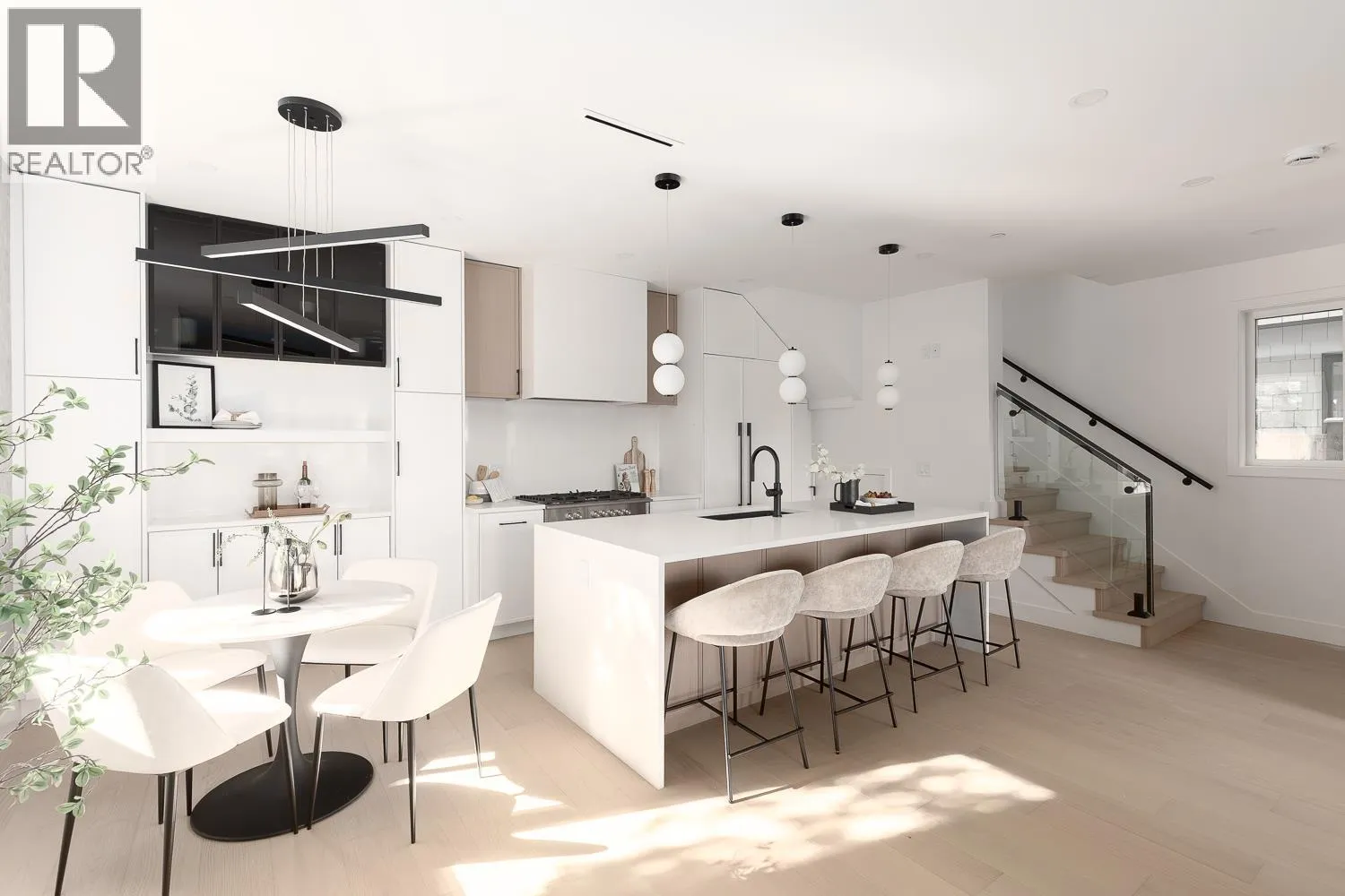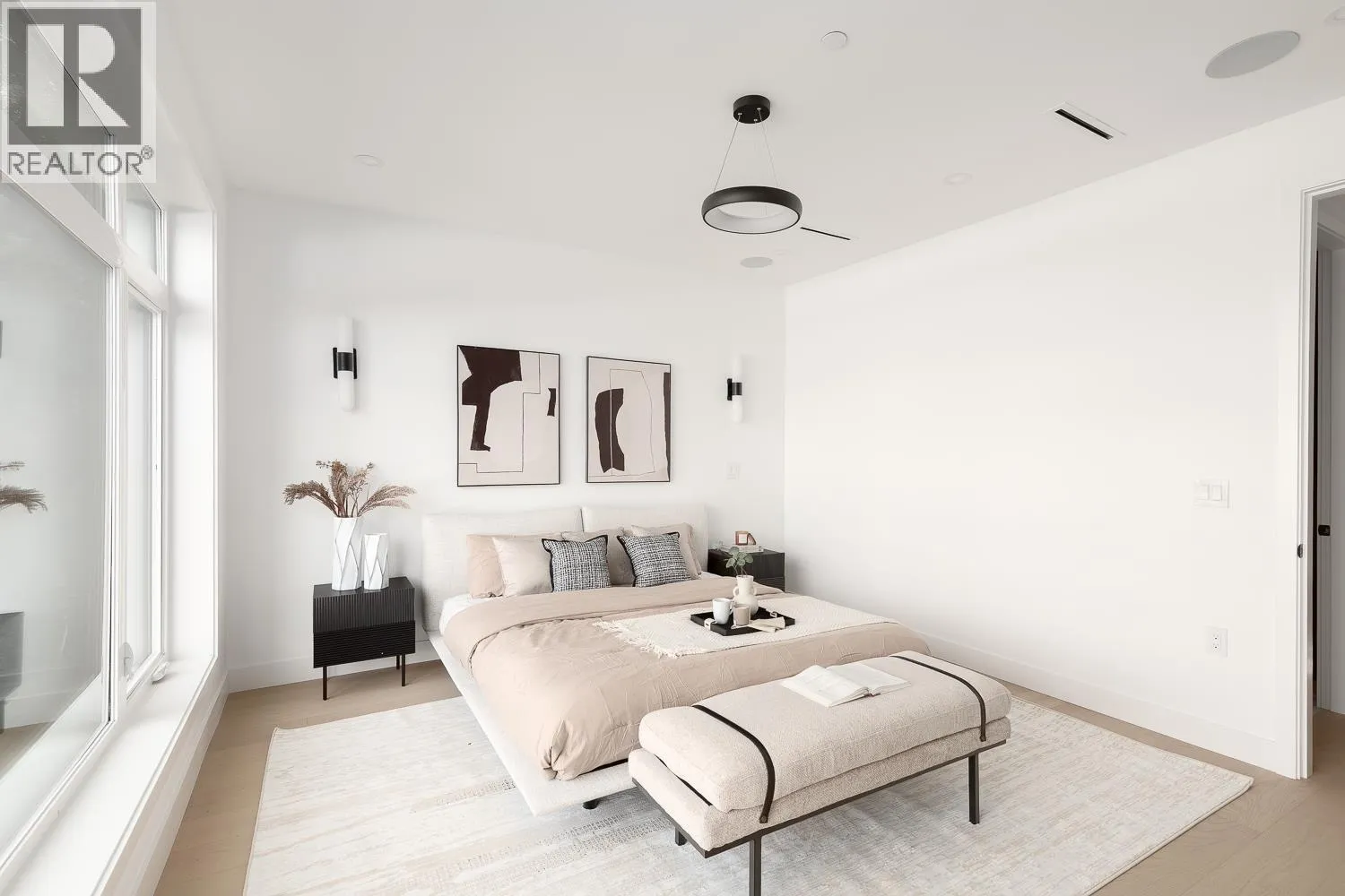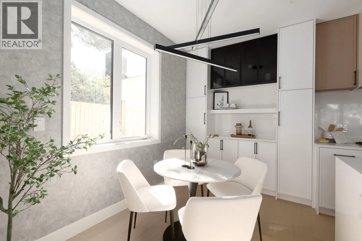 Front 1/2 duplex in desirable South Granville offering over 2,000sf, 4 bedrooms & 3.5 baths across expansive 3 levels. Designed to live like a detached home with a spacious island kitchen, full dining area & expansive living space. Eclipse doors open to a large private patio & yard for seamless indoor-outdoor entertaining. Upstairs features 3 generous bedrooms including a house-sized primary with walk-in closet & spa-like ensuite. The massive top floor offers over-height ceilings, a private balcony & flexibility to use as a 4th bedroom, office, gym or media room. Radiant heat, A/C, Google Nest, built-in speakers & secured parking provide modern convenience. Exceptional location near parks, shops, cafés & transit, with easy access to Kerrisdale, Oakridge & downtown. (id:27476)