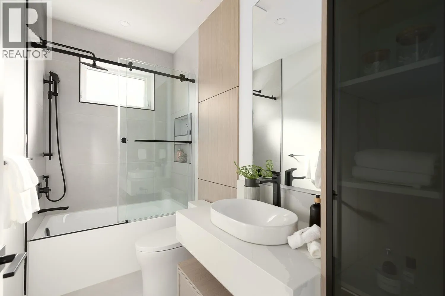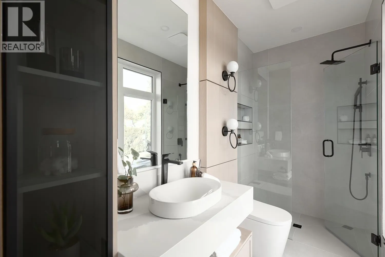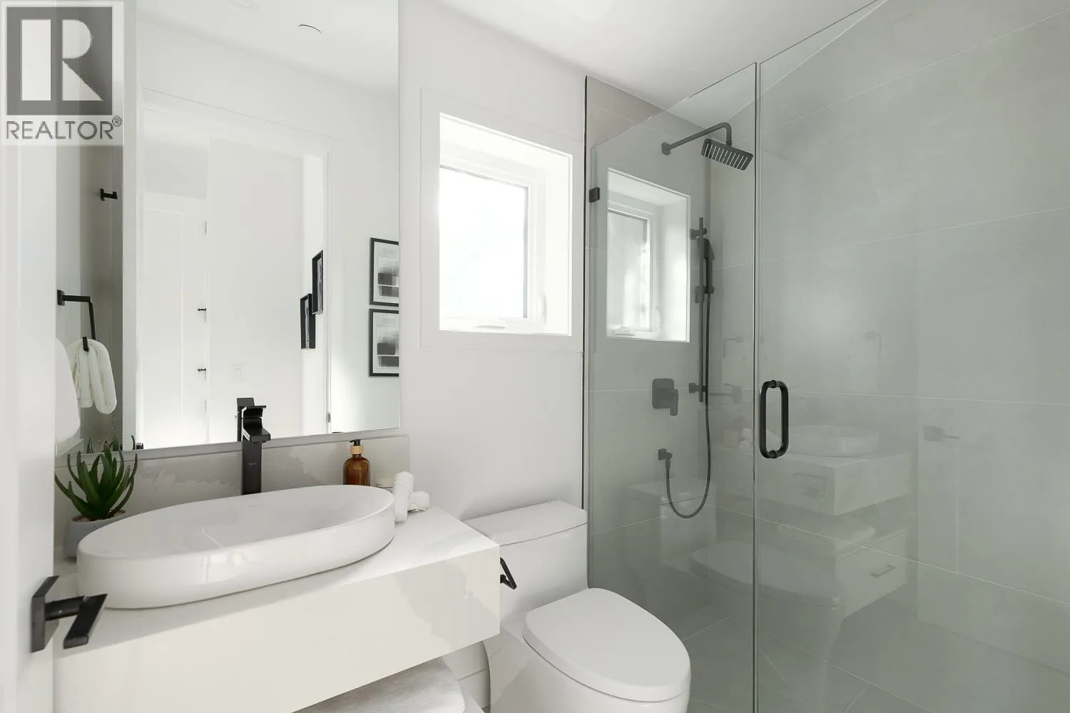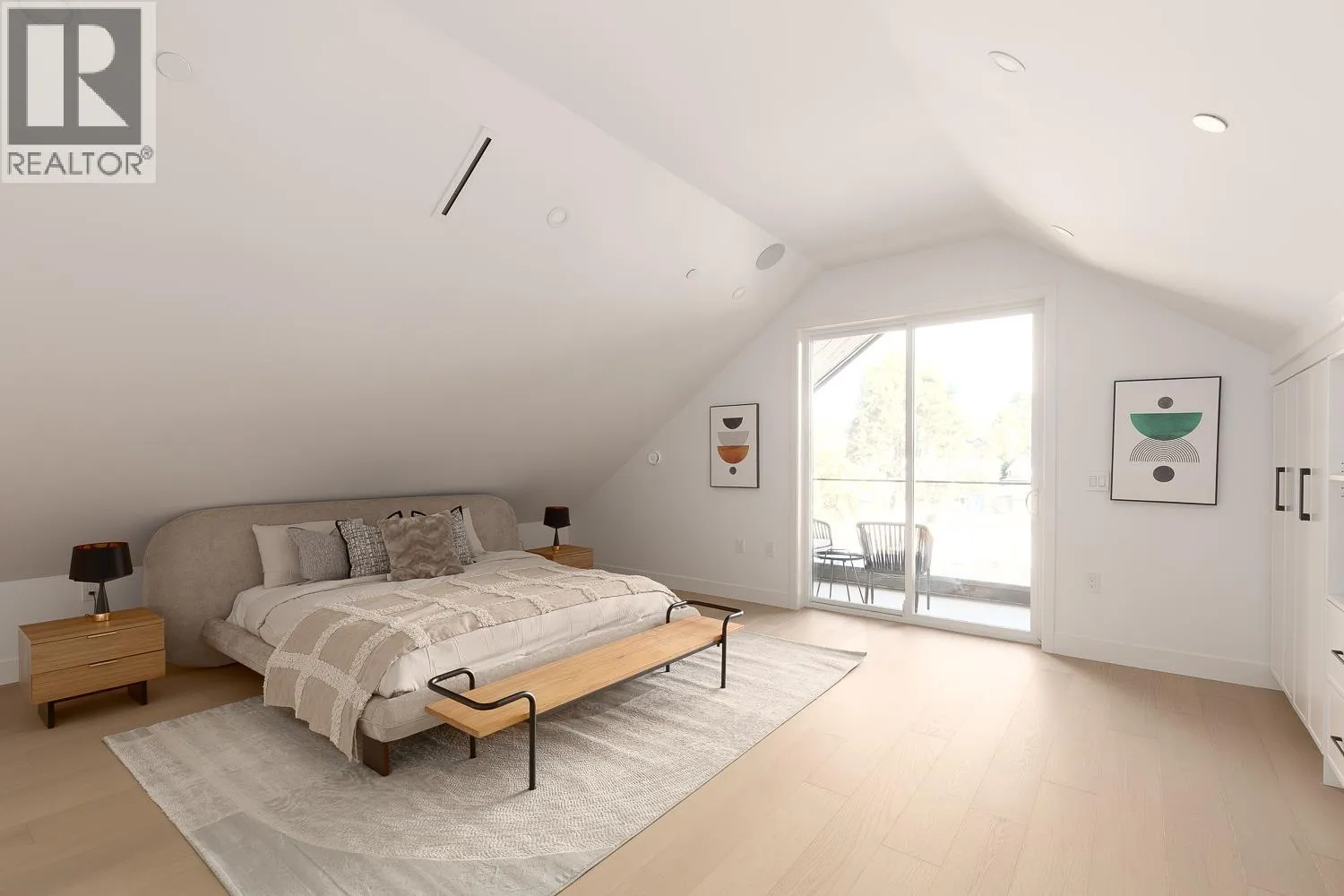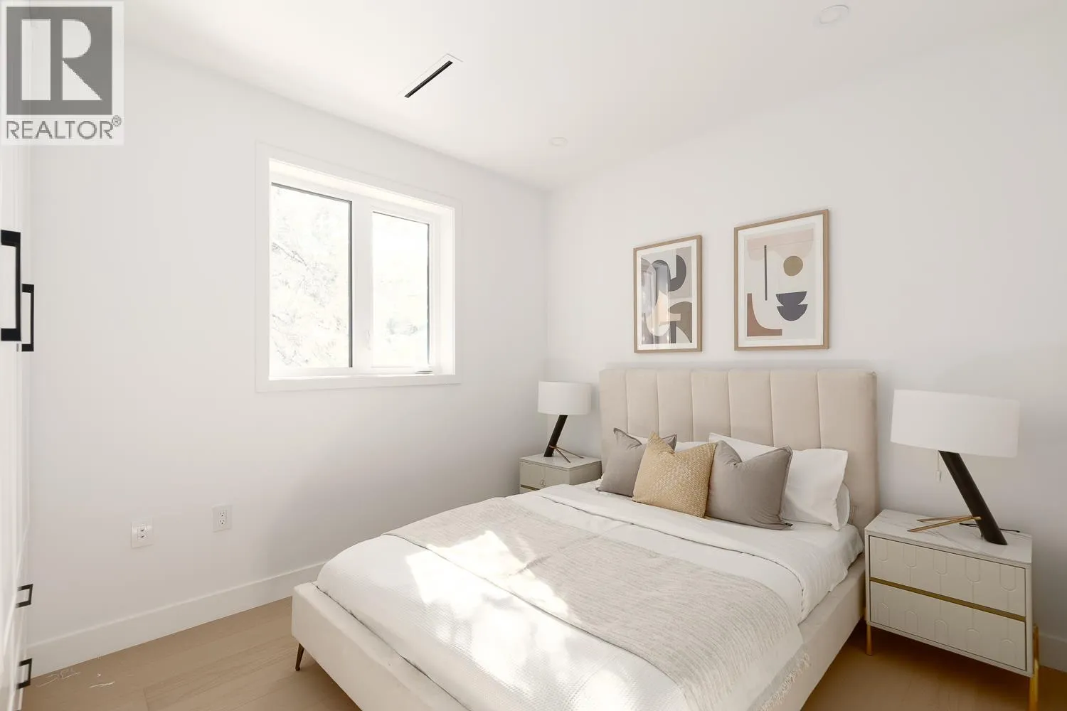 Front 1/2 duplex in desirable South Granville offering over 2,000sf, 4 bedrooms & 3.5 baths across expansive 3 levels. Designed to live like a detached home with a spacious island kitchen, full dining area & expansive living space. Eclipse doors open to a large private patio & yard for seamless indoor-outdoor entertaining. Upstairs features 3 generous bedrooms including a house-sized primary with walk-in closet & spa-like ensuite. The massive top floor offers over-height ceilings, a private balcony & flexibility to use as a 4th bedroom, office, gym or media room. Radiant heat, A/C, Google Nest, built-in speakers & secured parking provide modern convenience. Exceptional location near parks, shops, cafés & transit, with easy access to Kerrisdale, Oakridge & downtown. (id:27476)