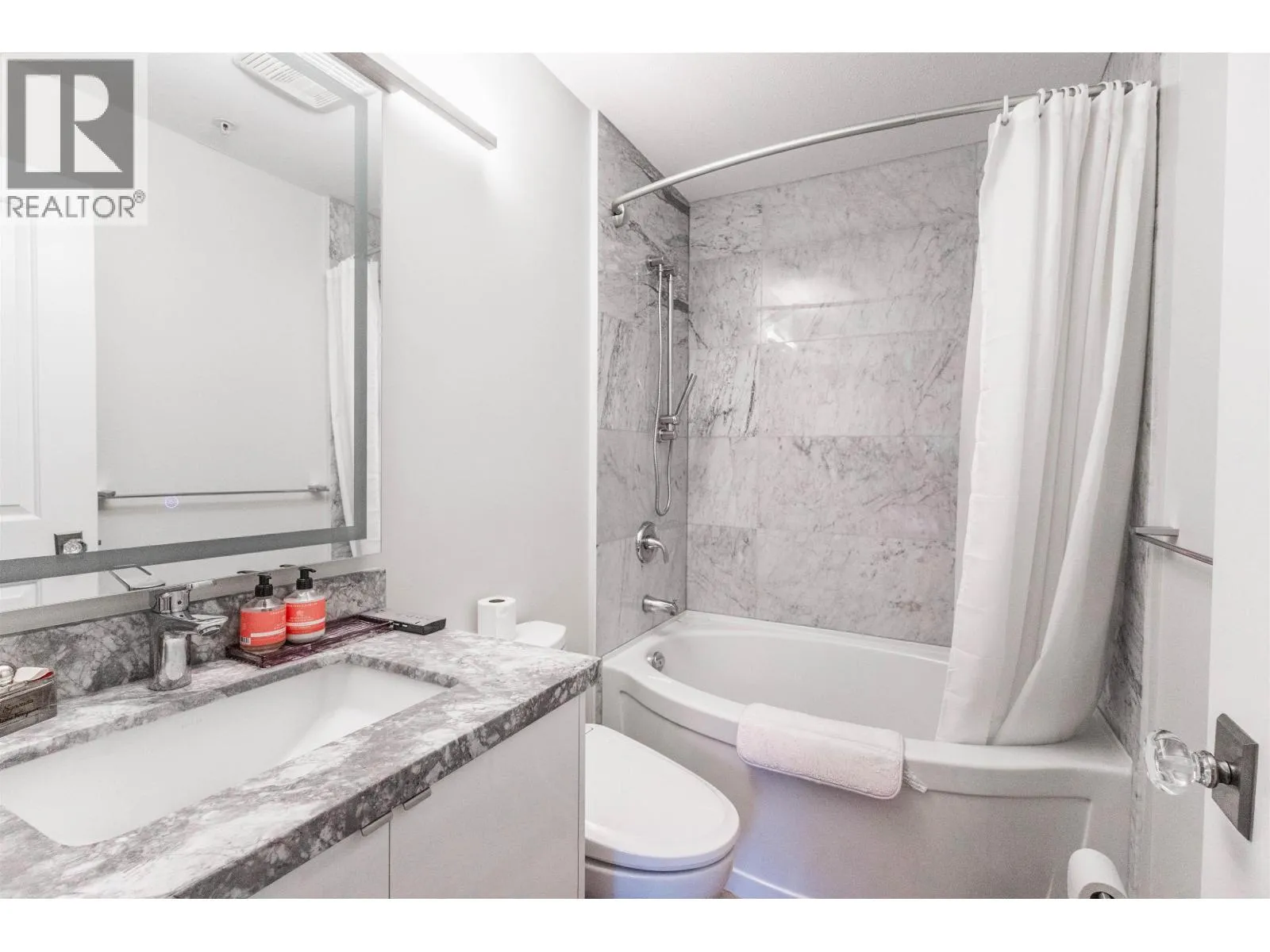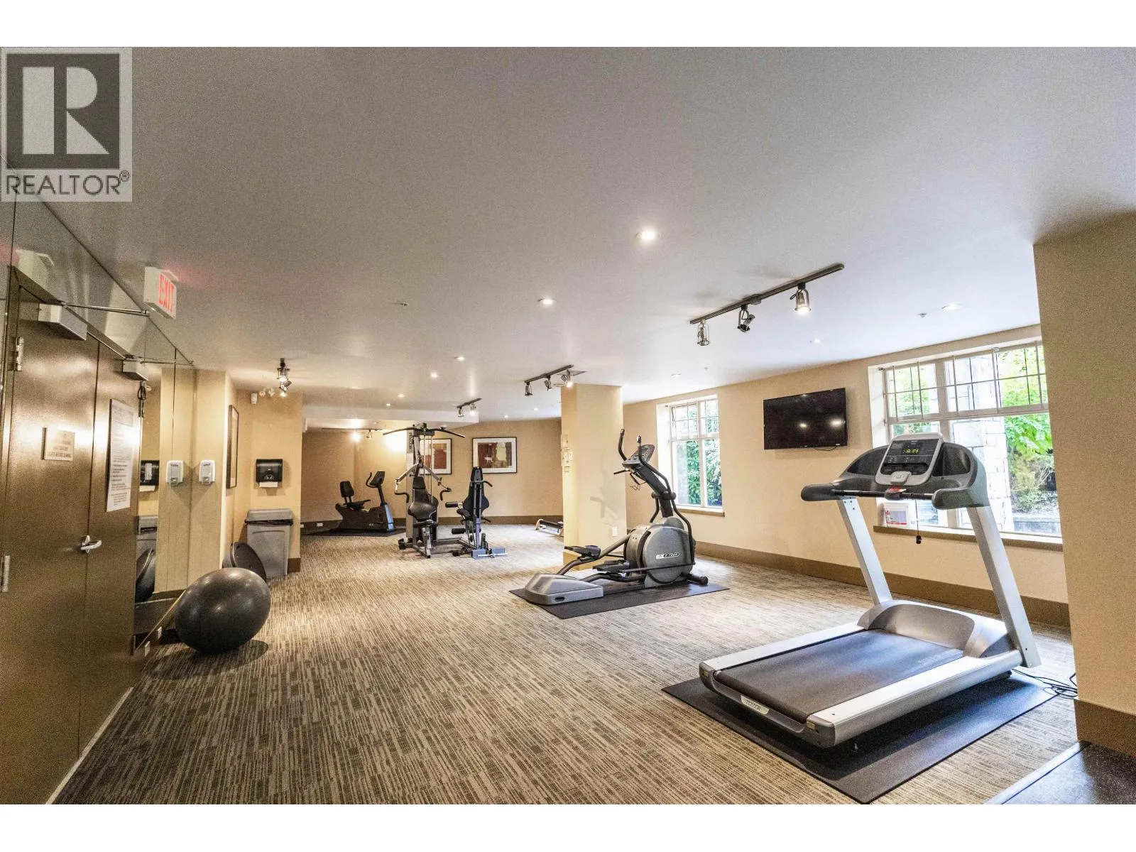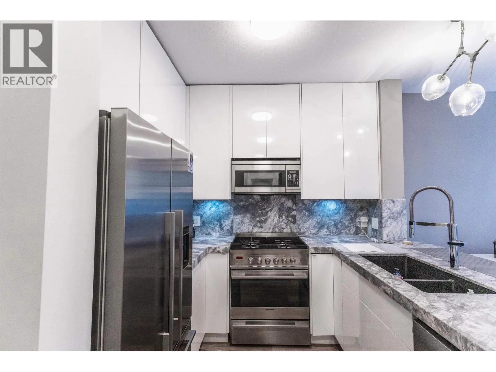 "Matthews House" by Polygon. This newly renovated and well-kept 2-bedroom plus den unit offers 801 sqft of spacious and functional living, featuring high ceilings, a kitchen with a gas stove and stainless steel appliances, a gas fireplace, California shutters in the living room, and a large outdoor patio. Enjoy easy access to the outdoor pool and fitness facility. Includes 1 parking stall (#108) conveniently located beside the elevator and 1 storage locker (#23). Just a few minutes' walk to Quilchena Park, Prince of Wales Secondary School, and public transportation. (id:27476)