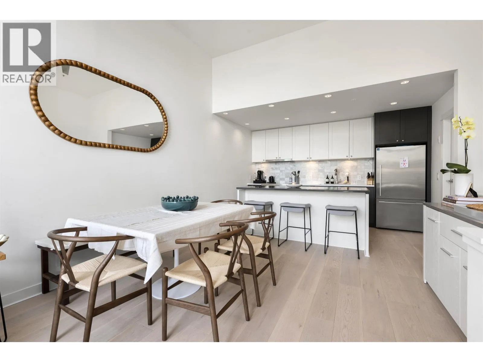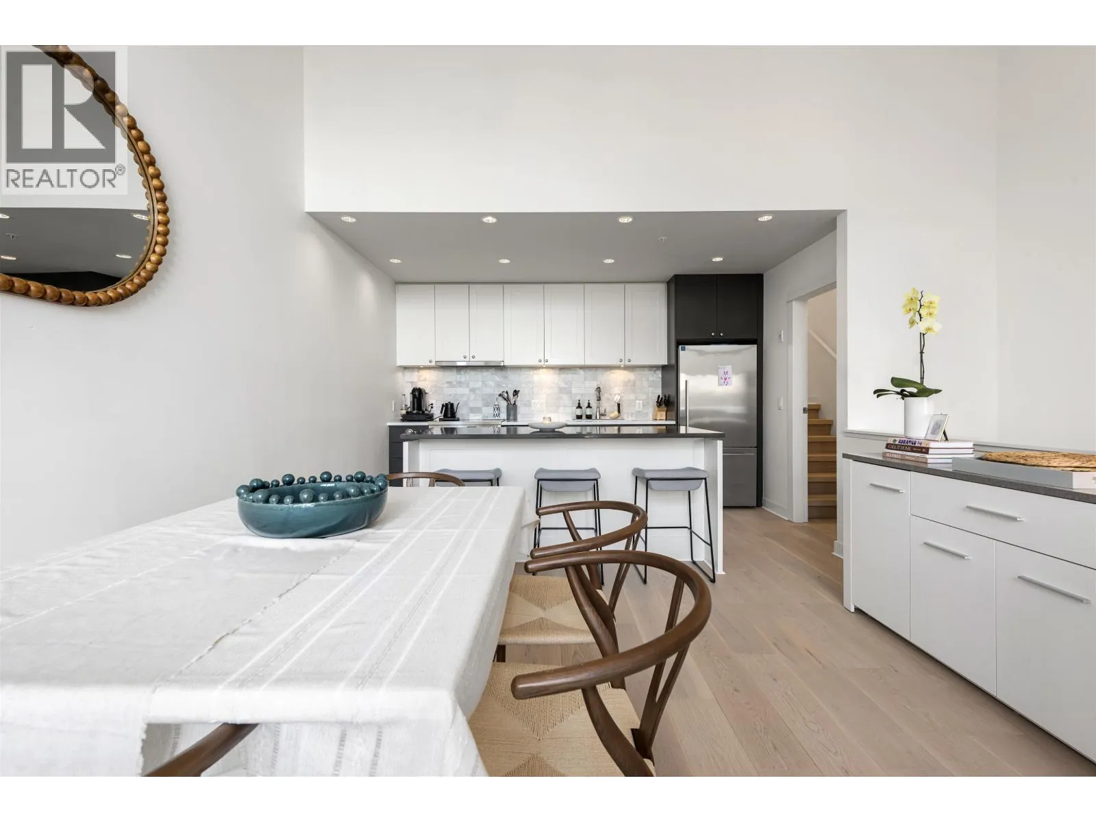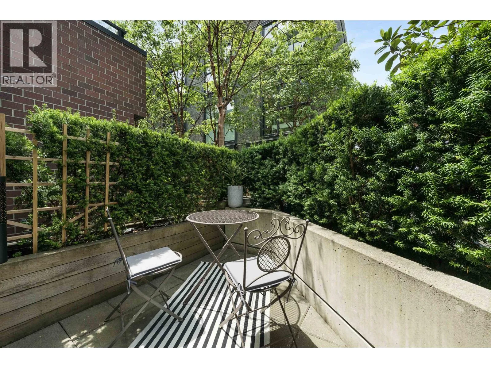 Welcome to Mason by Boffo, a boutique collection of modern townhomes located across from Trout Lake Park. This bright, stylish home features private street entry, soaring 12-foot ceilings, oversized windows, and open-concept living. The sleek kitchen includes quartz counters, marble tile backsplash, matte lacquer cabinets, and premium appliances. Enjoy a sun-soaked west-facing patio off the primary suite and a second bedroom with space for a home office. Updates include new hardwood floors throughout, custom built-in closets, and a new hot water tank. Includes one secure parking stall, storage locker, and bike storage. Steps to Trout Lake, trails, Commercial Drive, and SkyTrain. A must-see! (id:27476)