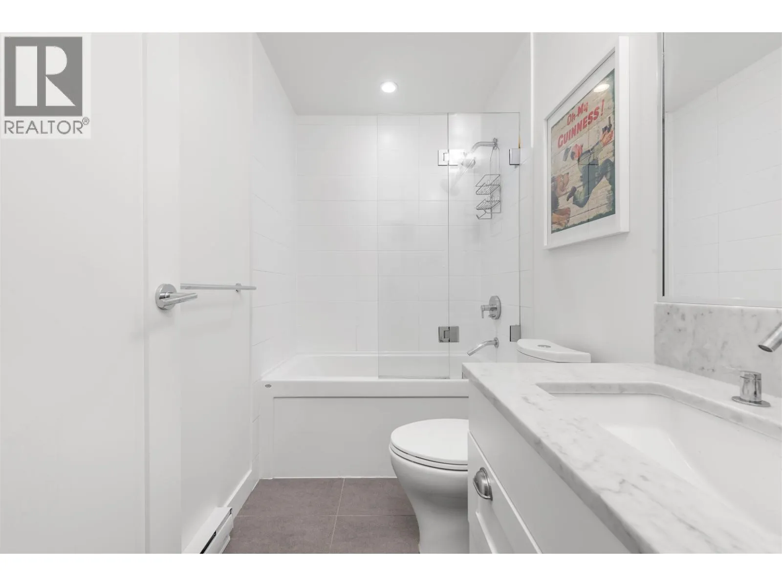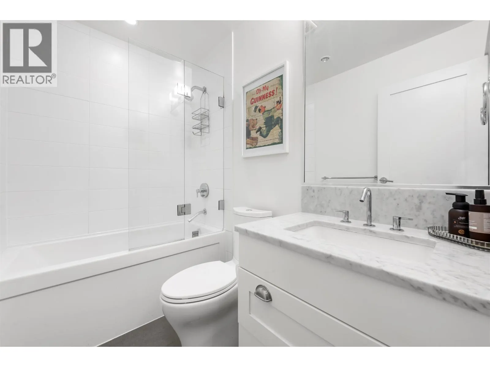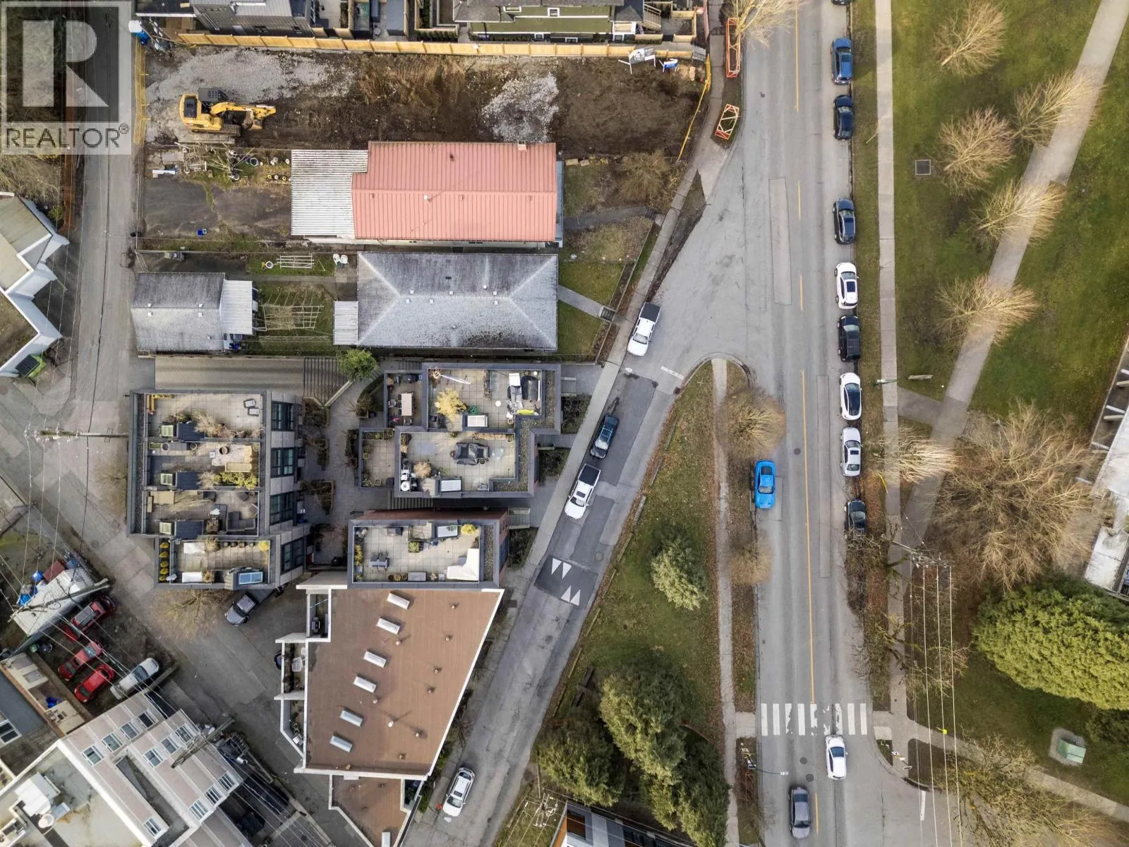 Welcome to Mason by Boffo, a boutique collection of modern townhomes located across from Trout Lake Park. This bright, stylish home features private street entry, soaring 12-foot ceilings, oversized windows, and open-concept living. The sleek kitchen includes quartz counters, marble tile backsplash, matte lacquer cabinets, and premium appliances. Enjoy a sun-soaked west-facing patio off the primary suite and a second bedroom with space for a home office. Updates include new hardwood floors throughout, custom built-in closets, and a new hot water tank. Includes one secure parking stall, storage locker, and bike storage. Steps to Trout Lake, trails, Commercial Drive, and SkyTrain. A must-see! (id:27476)