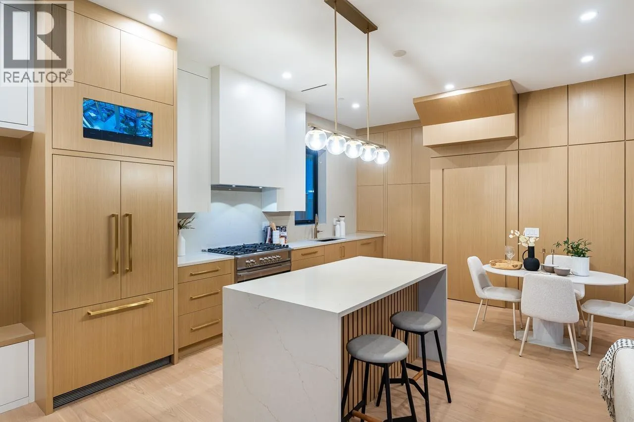 A rare offering directly facing Balaclava Park, this architecturally crafted West Coast modern residence blends natural elegance w/exceptional functionality. Nearly 3,850 sqft across 3 lvls, showcasing rich wood accents, coffered ceilings w/exposed beams, & refined detailing throughout. The