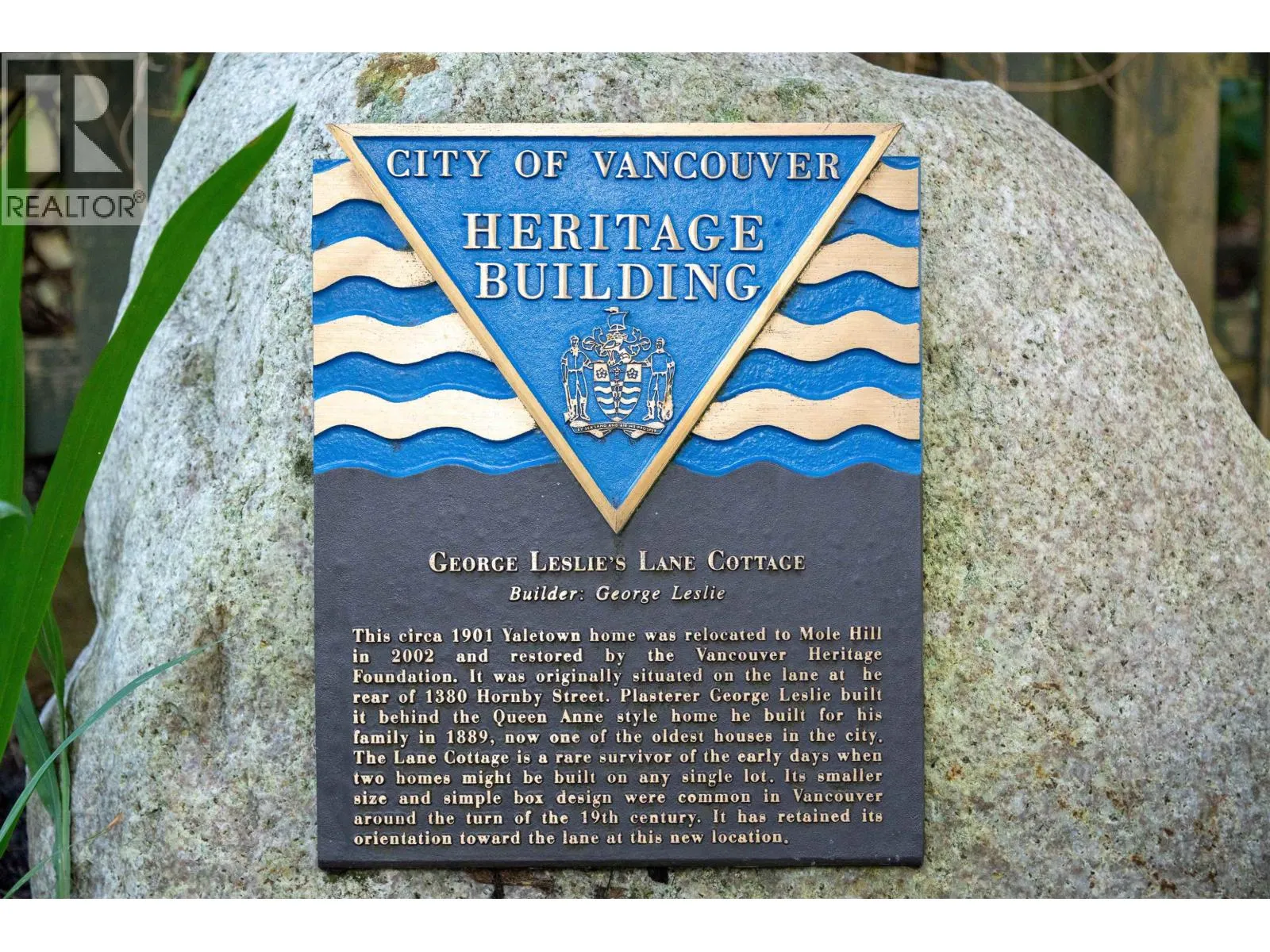 Rare Opportunity to Own a Heritage Home in the Heart of the City! This charming circa 1901 Yaletown heritage house was relocated to Mole Hill in 2002 and lovingly restored by the Vancouver Heritage Foundation. Originally positioned on the lane behind 1380 Hornby St, the home was built by Plasterer George Leslie behind the Queen Anne-style residence he constructed for his family in 1889, now one of the city´s most mature houses. Currently configured as 2 half duplex units, and functions as a strata, this versatile property offers the option to convert back to a single-family dwelling. The upper level features a 2 level 2 bed/2 bath layout, the lower level offers an open-concept 1-bed w/private patio. Nestled among lush, mature trees, this urban sanctuary and is truly a unique offering! (id:27476)