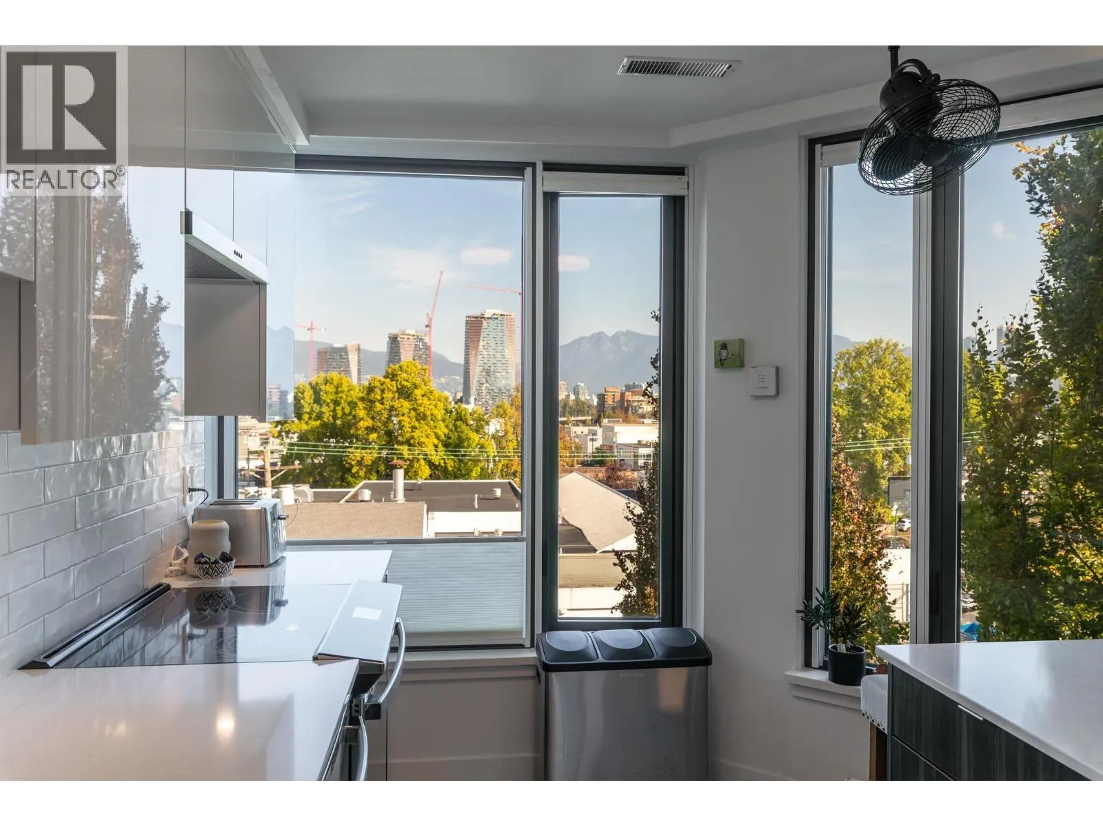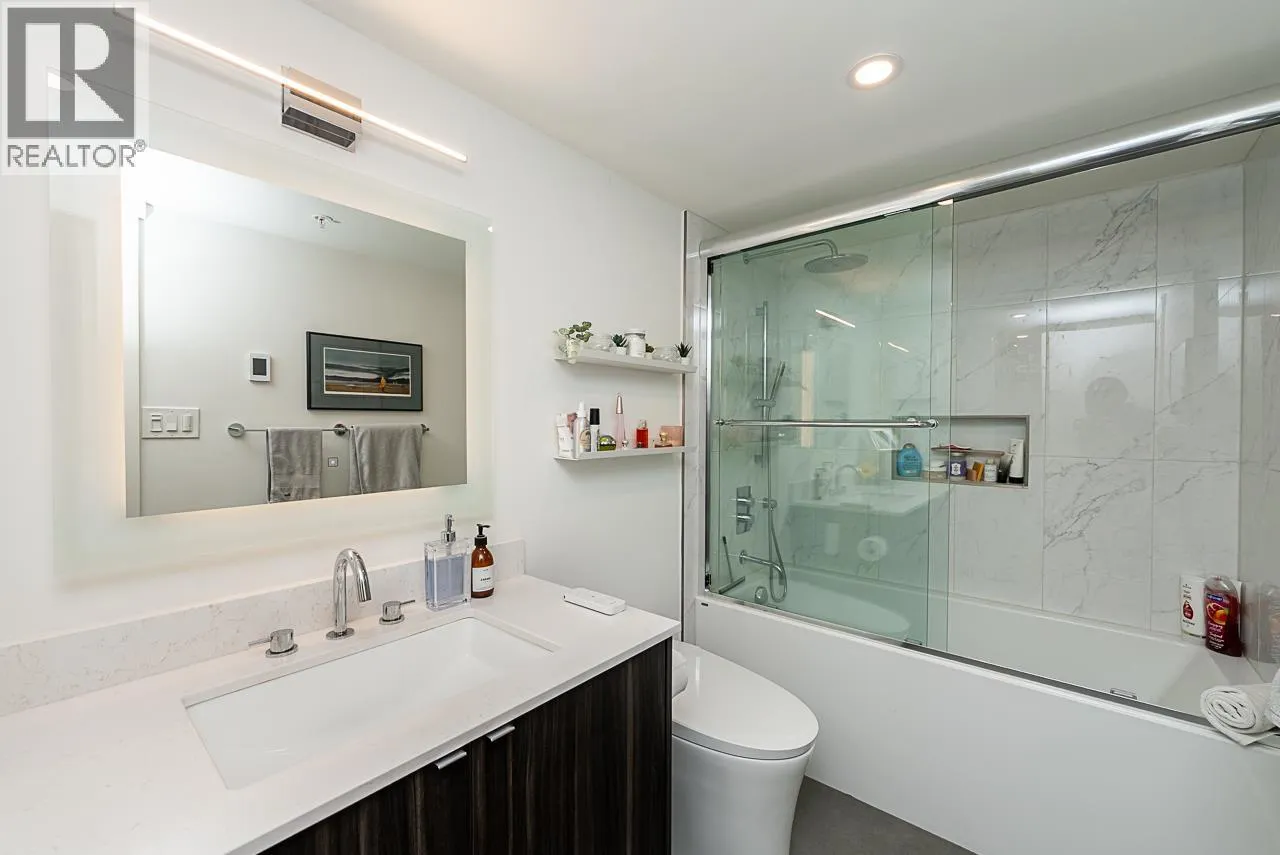Experience unmatched quality in this fully rain-screened concrete condo with triple-glazed windows with sweeping NorthWest views of city & mountains. The custom kitchen features Silestone quartz counters, wine fridge, & GE Profile appliances. The open-concept layout includes reimagined dining area-easily convertible back to 3rd bedroom if desired-alongside Dimplex fireplace & custom millwork. Extensively renovated with over $14K in motorized blinds, fresh paint, upgraded carpets, baseboards, trim, LED lighting, & high-efficiency heaters. Luxurious touches include NuHeat heated floors, dimmable LED mirrors, & premium UK fixtures. Includes 2 side-by-side parking, storage, & access to saltwater pool, hot tub, & sauna. EV-ready building with proactive strata & $16M envelope renewal completed. (id:27476)
