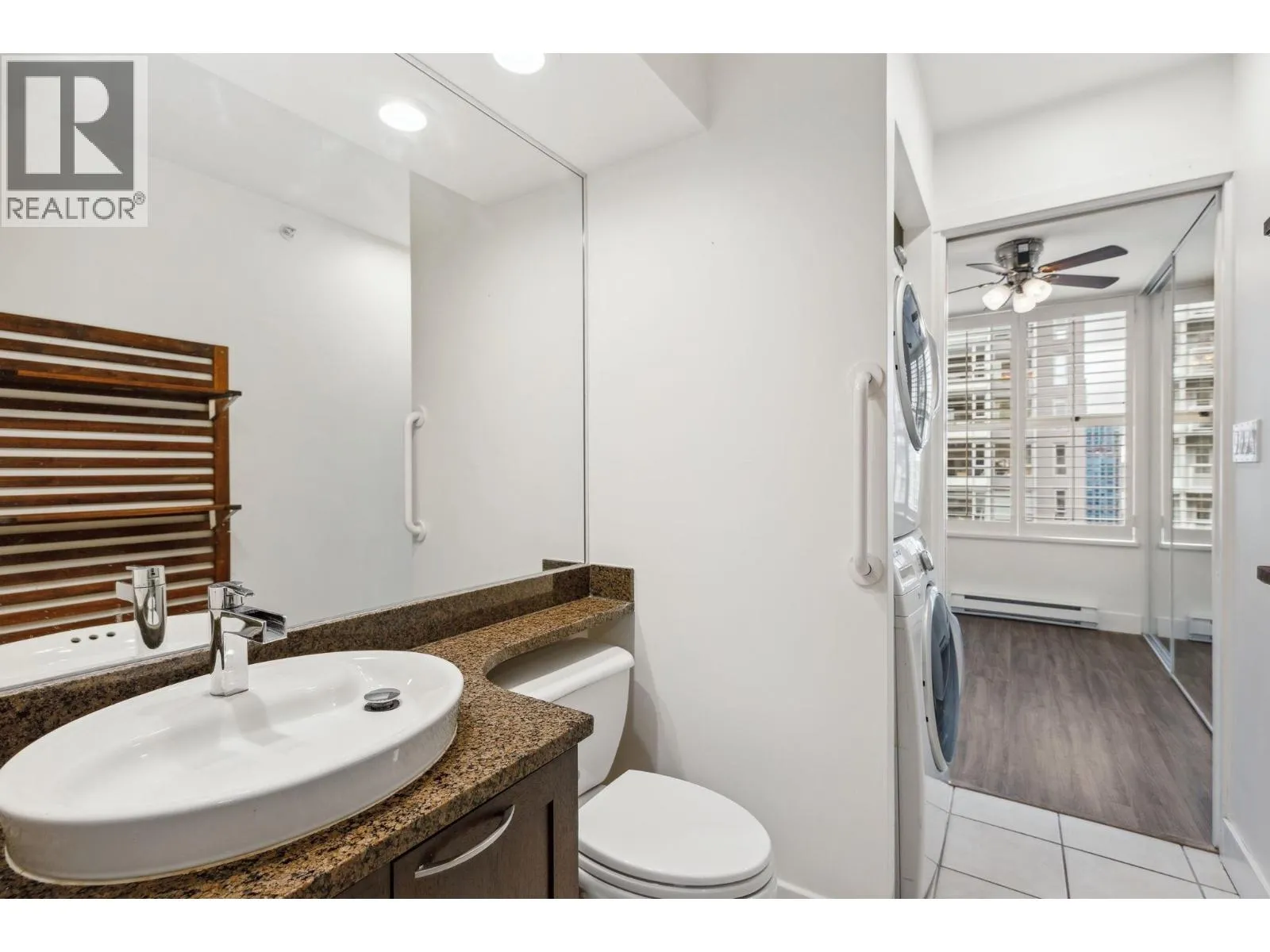 Welcome to this spacious and bright upper floor 1 bedroom + den corner home in the Mondrian 1 by Bosa, perfectly located at the edge of Yaletown. With a unique floor plan offering flexibility and plenty of space, this home is flooded with natural light and features stylish wood shutters, stainless steel appliances, granite countertops, and laminate and tile throughout. Enjoy cozy evenings by the gas fireplace or unwind on your balcony with stunning city views. The building offers resort-style amenities including an exercise centre, hot tub, sauna, guest suite, and visitor parking. Plus, you´ll have 1 parking spot and a locker for added convenience. Steps away from Yaletown's trendy restaurants, retail, and transit, this home offers the perfect blend of comfort, style, and location. (id:27476)