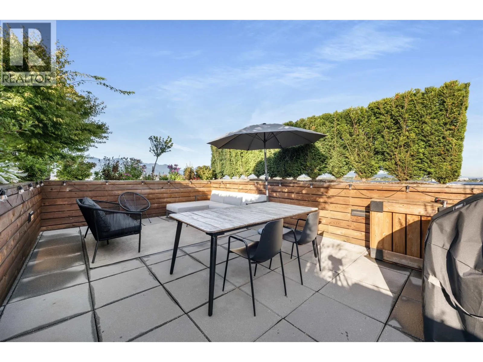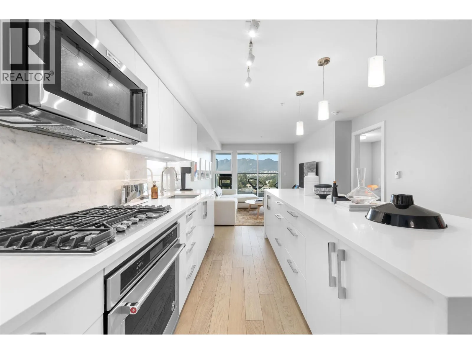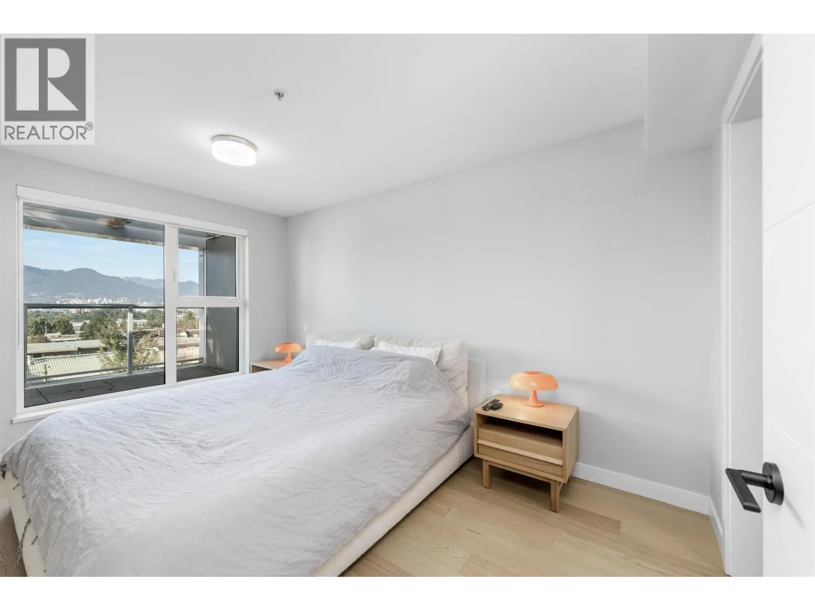 Top-floor corner penthouse in the heart of Mt. Pleasant! This bright & modern 1 bed, 2 bath home features a spacious open-concept layout with wide-plank flooring & oversized windows that flood the space with natural light. The sleek chef´s kitchen includes a large island, quartz countertops, Carrara marble backsplash, & high-end integrated appliances. The generous bedroom offers a walk-through closet & a spa-inspired ensuite with double vanity & herringbone tile. Enjoy spectacular North Shore mountain & city views from your massive private rooftop patio-complete with a gas line for BBQs, perfect for entertaining. Located in a boutique 35-unit building at Broadway & Fraser, steps to cafés, parks, transit, & Main Street. Includes 1 parking, 3 large storage lockers, & 2 bike lockers. (id:27476)