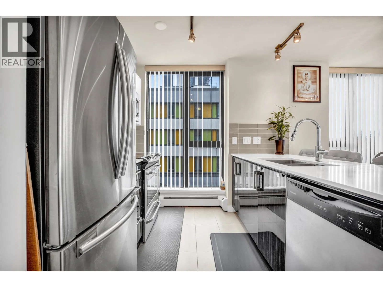 Welcome to Skyway Tower at 2689 Kingsway! This bright 2-bedroom, 2-bathroom home on the 3rd floor faces Norquay Park, offering a peaceful, green outlook. The kitchen features stainless steel appliances, quartz countertops, sleek cabinetry, and a spacious island with bar seating. The open layout flows into a light-filled living area, while both bedrooms are well-separated for privacy. Enjoy in-suite laundry, a covered balcony, and quality finishes throughout. Built by Thind Properties, Skyway Tower is a concrete mid-rise with secure parking, bike storage, and a rooftop garden. Steps from parks, shops, and transit in an unbeatable East Vancouver location! (id:27476)