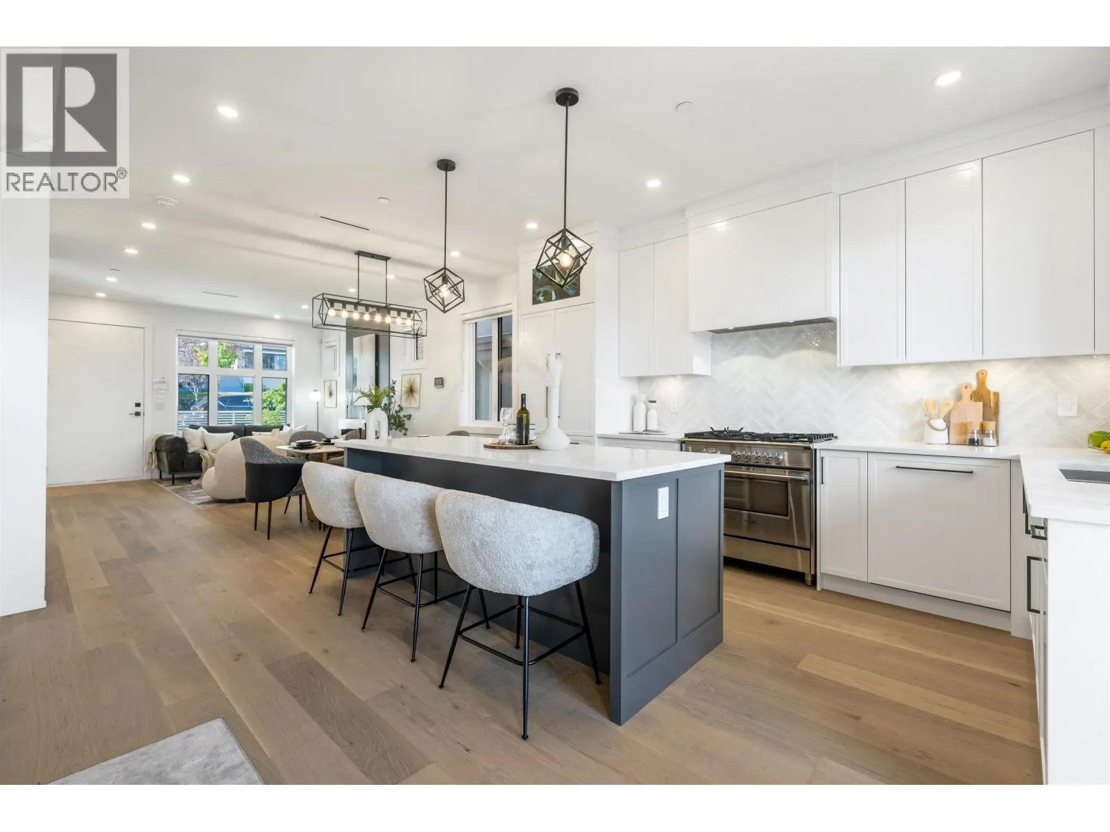 FRASERVIEW Side by Side duplexes on a prized 49x122 lot size. These homes embody exceptional craftsmanship & sophistication. Features 3 bdrms on the upper floor with additional bedroom for owners use in the basement & 1 bdrm WALK OUT legal suite. Inside, you'll find white oak hardwood floors, 10-foot ceilings, and an open-concept design that creates an airy, inviting atmosphere. Bright white shaker style cabinetry with integrated Fisher Paykel appliances including a 36 INCH GAS RANGE, Wine fridge & Extra large pantry. Other notable features include TANKLESS HOT WATER on demand GAS BOILER, radiant heating, No sump pump, premium bathroom fixtures, and HRV/AC/Heat Pump systems for year-round comfort. School Catchment: Sir James Douglas (French Immersion) & David Thompson Secondary. (id:27476)