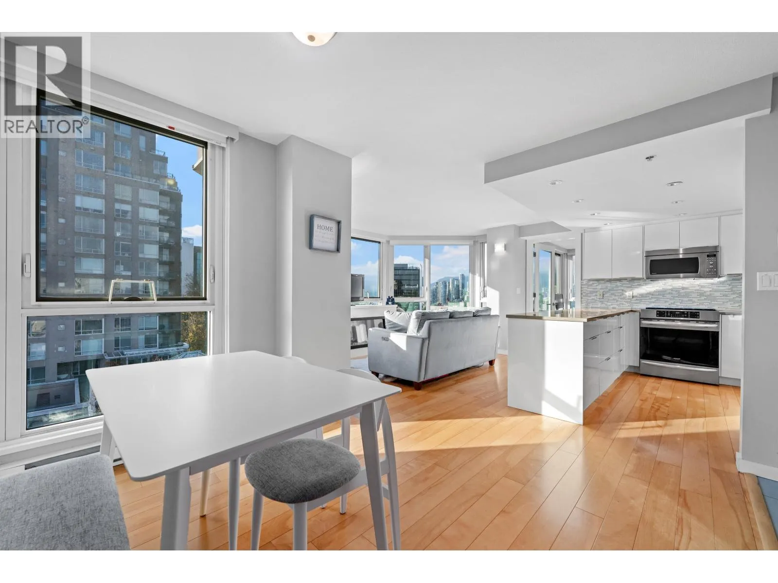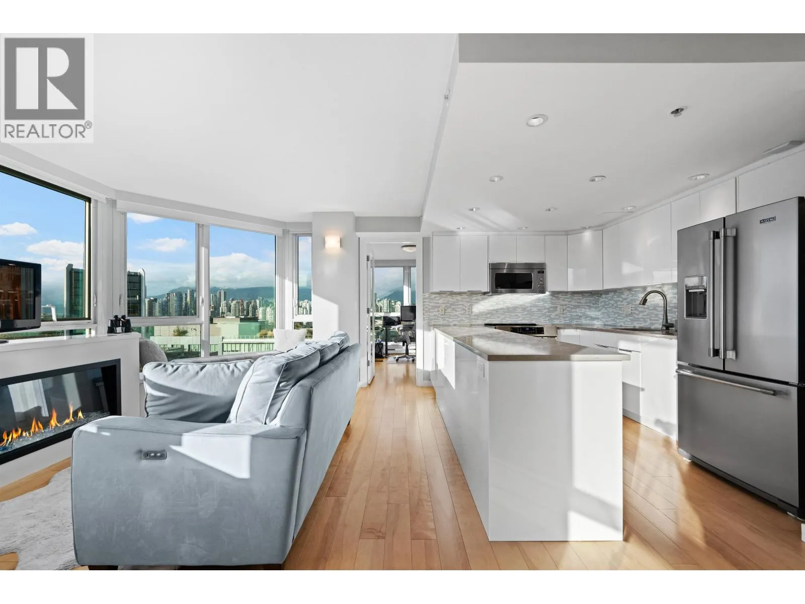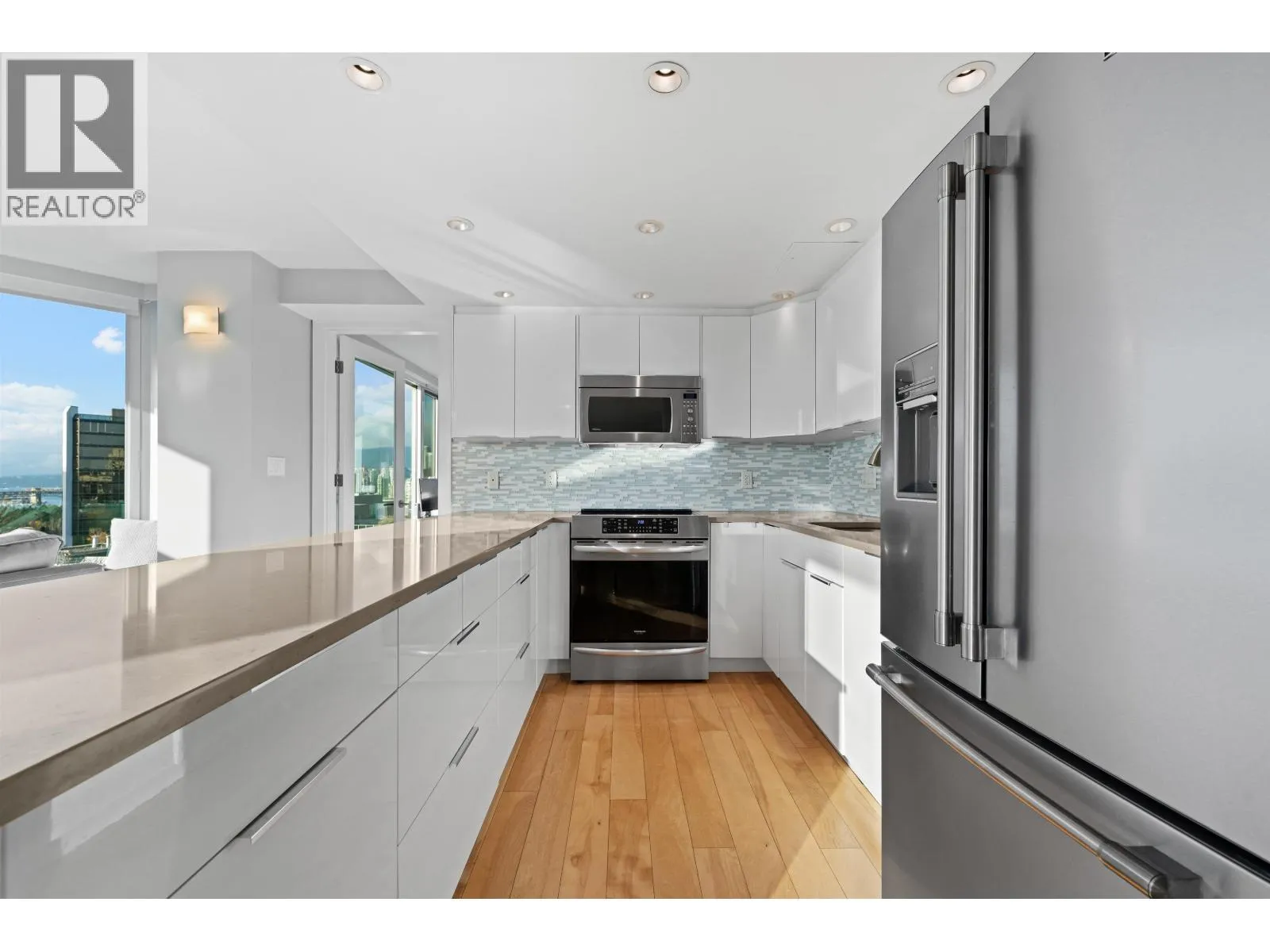 PENTHOUSE PERFECTION with sweeping views of English Bay, the City & North Shore Mountains! This beautifully maintained unit offers two generous bedrooms and a large flexible den with an expansive open layout ideal for entertaining or relaxing in style. The kitchen features sleek quartz countertops, modern cabinetry, and premium appliances designed for everyday luxury. Enjoy unmatched privacy with no neighbours on three sides and unobstructed 180° panoramic views from every room. Steps from the SkyTrain, shops, and restaurants (id:27476)