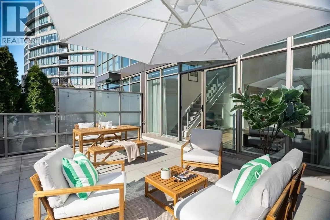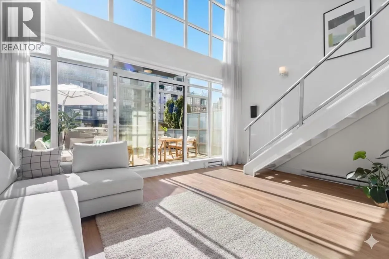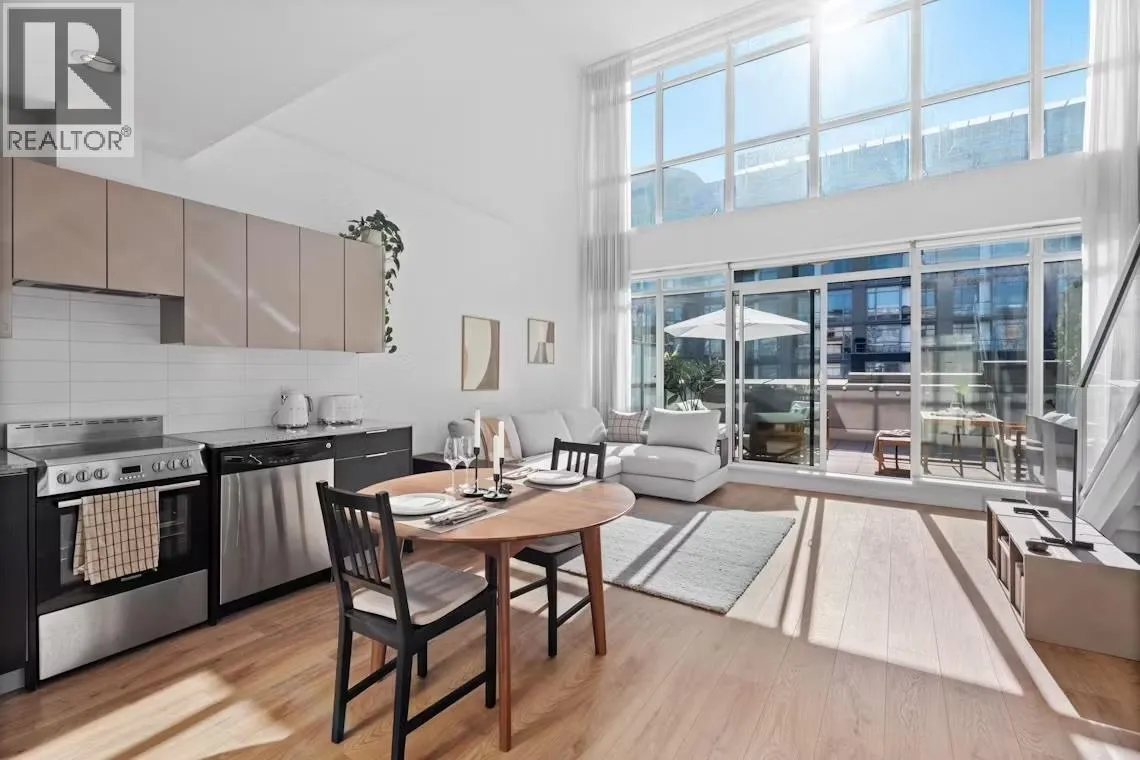 This stunning rare Two-Level Penthouse Loft in the historic Maynards Block, featuring 17´7" vaulted ceilings, floor-to-ceiling windows, and the extra-large private rooftop terrace (approx. 335 sq.ft.), providing exceptional privacy and a seamless indoor-outdoor lifestyle. Perfect for relaxing, entertaining, or enjoying the stunning nights. Smart layout with 1 bedroom, 1.5 baths, and flex/den ideal for a home office. The primary suite upstairs overlooks the tranquil courtyard garden. Bright open living, modern kitchen with s/s appliances, granite counters & tile back splash. Access to concierge, gym, yoga studio, rooftop courtyard & bike room. Steps to Canada Line, Seawall, and Olympic Village dining. Includes 1 parking stall (by elevator) & 1 lockers. A rare urban gem - must see! (id:27476)