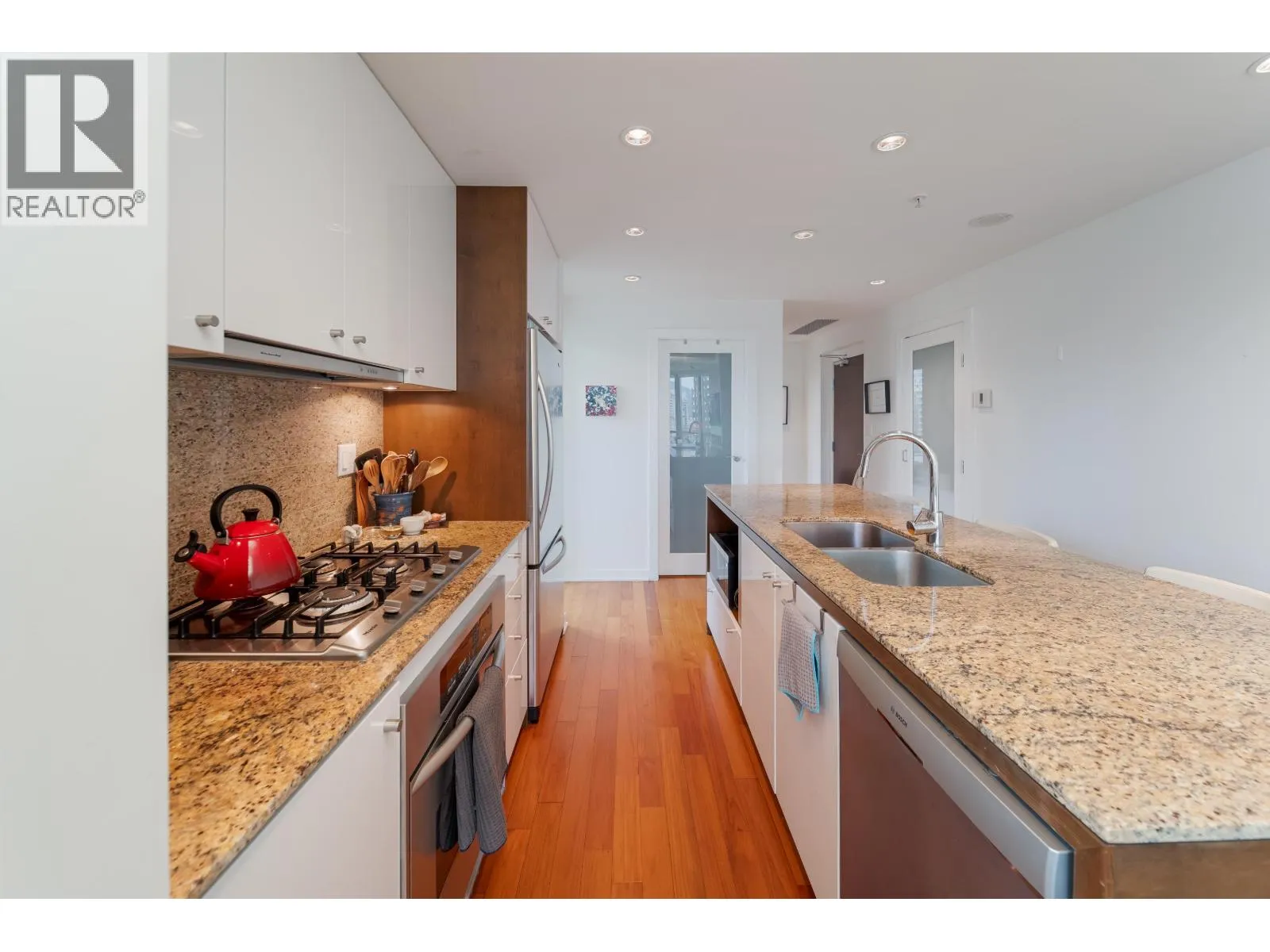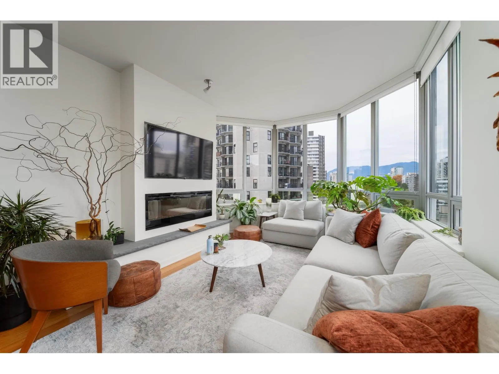 Experience waterfront living with breathtaking ocean and mountain views in this stunning 1-bedroom plus den corner suite at the sought-after Alvar building. Bright and spacious, it features a bonus flex room ideal for a home office, high ceilings, expansive windows, hardwood floors, and a cozy fireplace. The gourmet kitchen includes granite countertops, a large island, stainless steel appliances, a gas cooktop, and a built-in oven. Enjoy the fresh coastal breeze from your private patio. The Alvar offers a fitness centre, hot tub, theatre room, and an entertainment lounge with outdoor BBQs and water features. Steps from the beach, seawall, dining, and shopping, this home includes parking, storage, and many upgrades throughout. (id:27476)