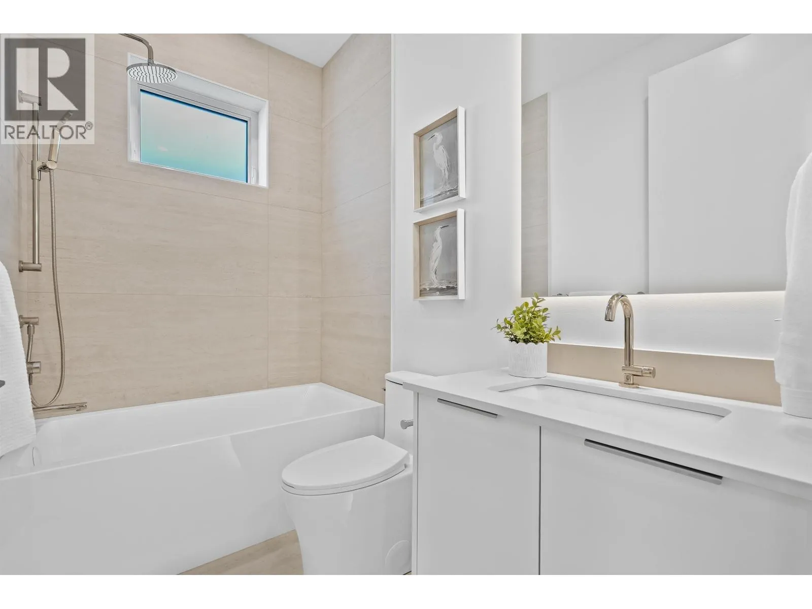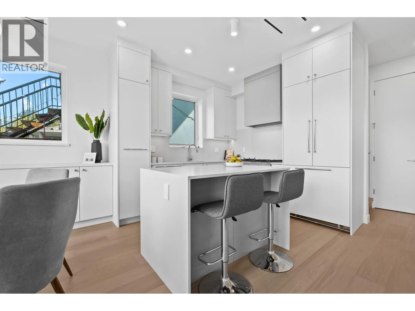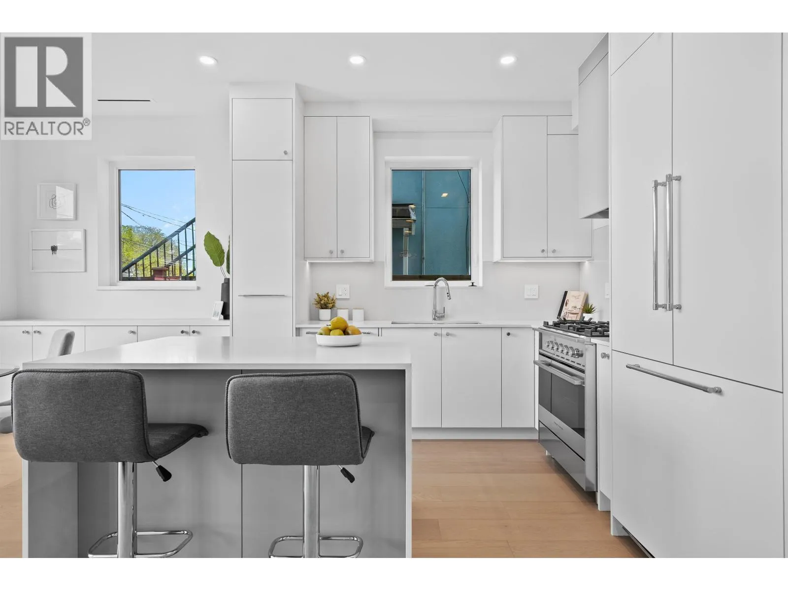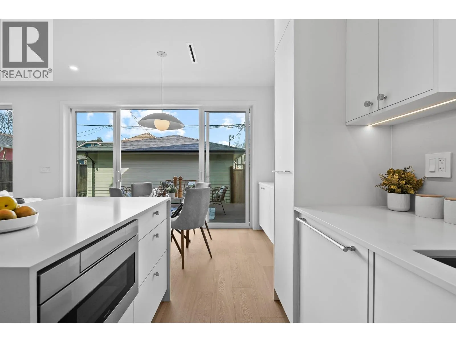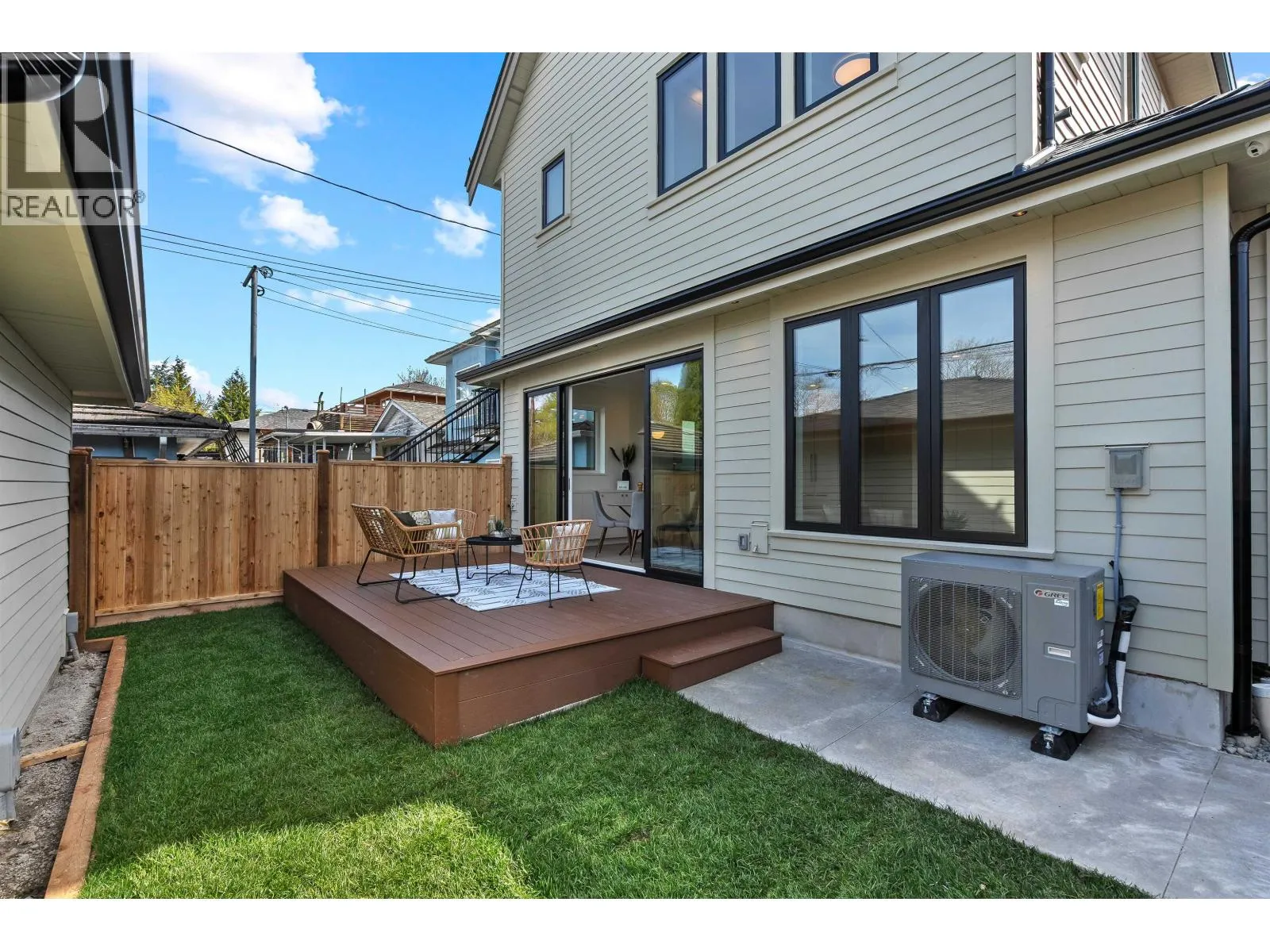 Introducing a brand new back 1/2 duplex located on a quiet family-friendly street, just steps from Commercial Drive, Lord Nelson Elementary, and Templeton High School. Built by Modern Styles Homes, this stunning residence offers over 1,600 square ft of refined contemporary living with premium finishes throughout. Enjoy 3 spacious bedrooms, 4 beautifully appointed bathrooms with integrated storage, and an open-concept main floor with multi-slide glass doors leading to a private backyard oasis. Features include engineered oak hardwood, radiant in-floor heat, A/C, expansive windows, skylights, and a integrated security camera system. The chef-inspired kitchen boasts Fisher & Paykel appliances, custom cabinetry, quartz countertops, and a large island. Open House: Saturday, Nov 22, from 2 - 4 PM. (id:27476)