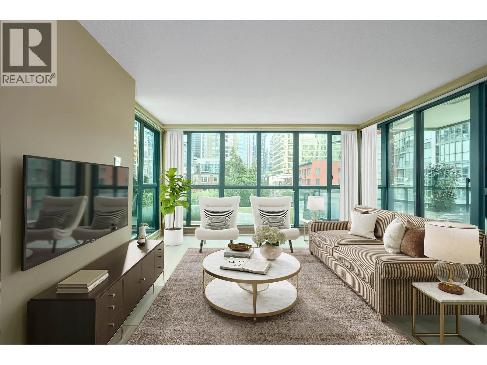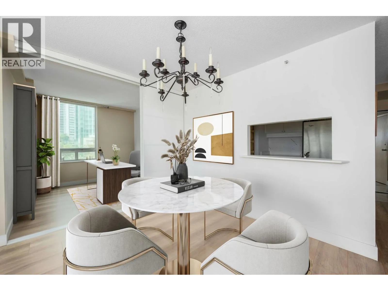 Welcome to this tastefully updated 1 bed+den SW corner unit at Point Claire in the heart of beautiful Coal Harbour. Spanning 792sf, this home offers a functional layout that seamlessly blends living and dining areas with a large adjoining den, ideal as a home office or second bedroom. Floor-to-ceiling windows fill the space with natural light and frame views of the private courtyard, city skyline, and glimpses of the ocean and mountains beyond. Enjoy resort-style amenities including indoor pool, hot tub, sauna, gym, concierge, EV chargers, etc. A rare opportunity to have it all in an unbeatable location! (id:27476)