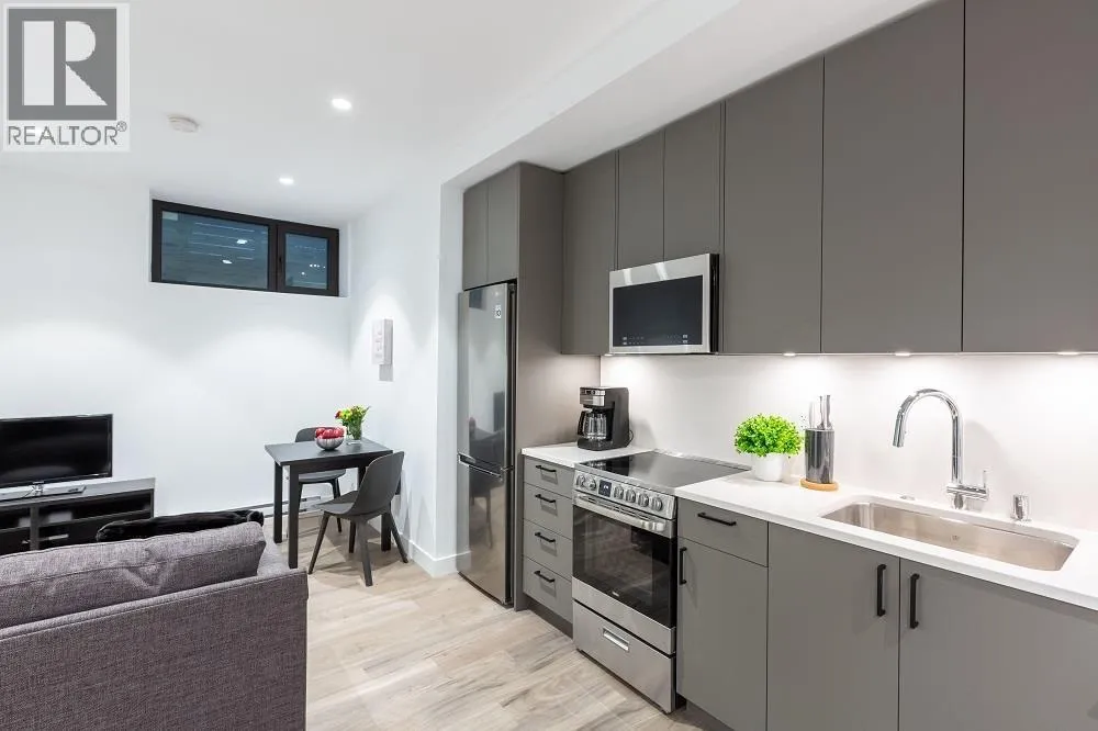Enjoy 450 square feet of living space in this Vancouver furnished junior bedroom for rent. This open-concept suite boasts high ceilings, wide-plank flooring and stylish furnishings. A well equipped entertainment area offers a comfortable couch, flat screen TV and plush pillows. Enjoy a dining table with seating for 2 and the galley kitchen offers stainless steel appliances, quartz counter-tops and plenty of pantry space. The comfortable bed is settled into a lovely nook with a frosted glass divider and a large closet for additional storage. Amenities include an alarm system, in-suite laundry, a private entrance, and water. Street parking is available and pets may be considered. Please note that a $295 cleaning fee applies. Located in beautiful Kitsilano (id:27476)