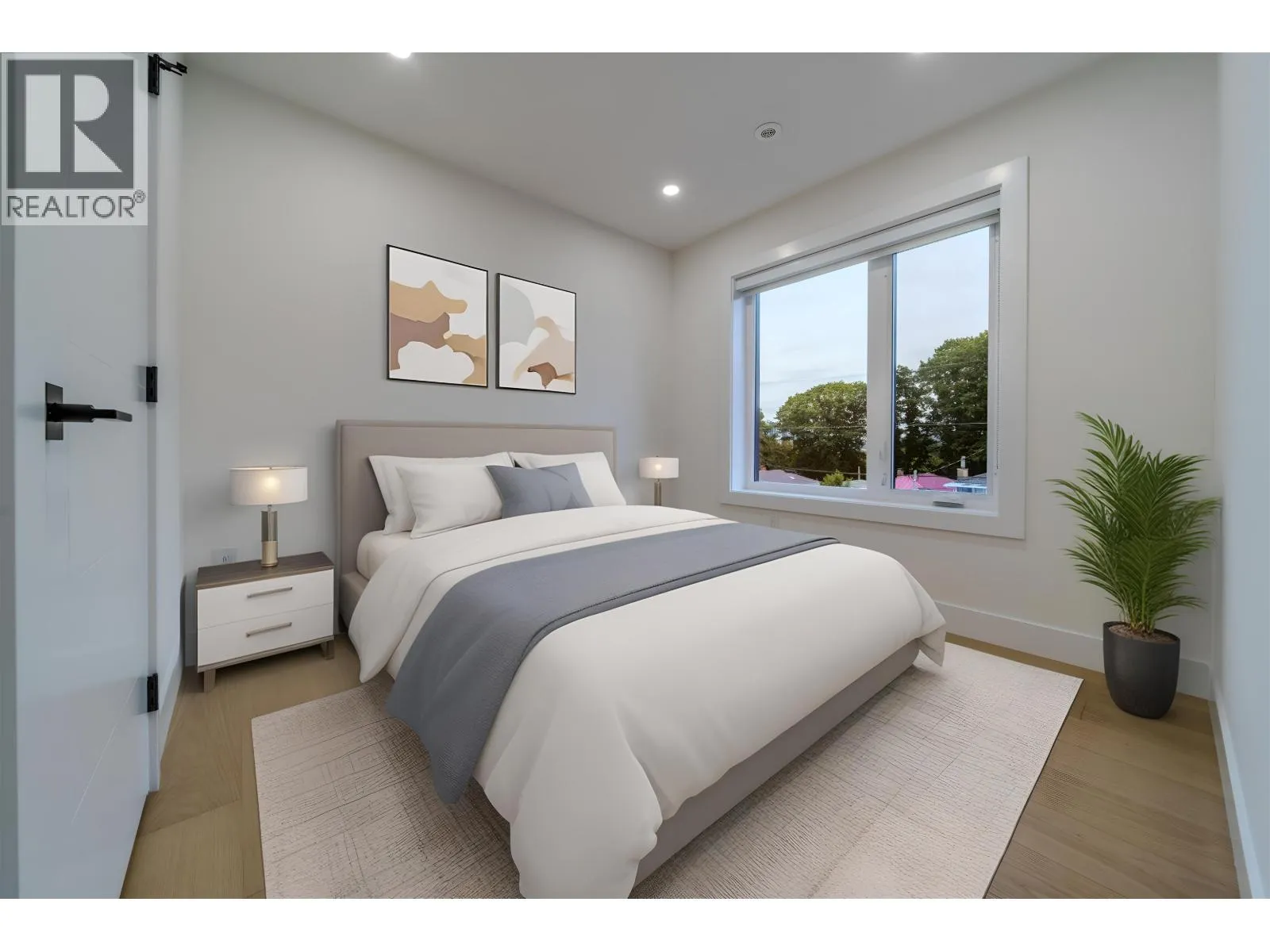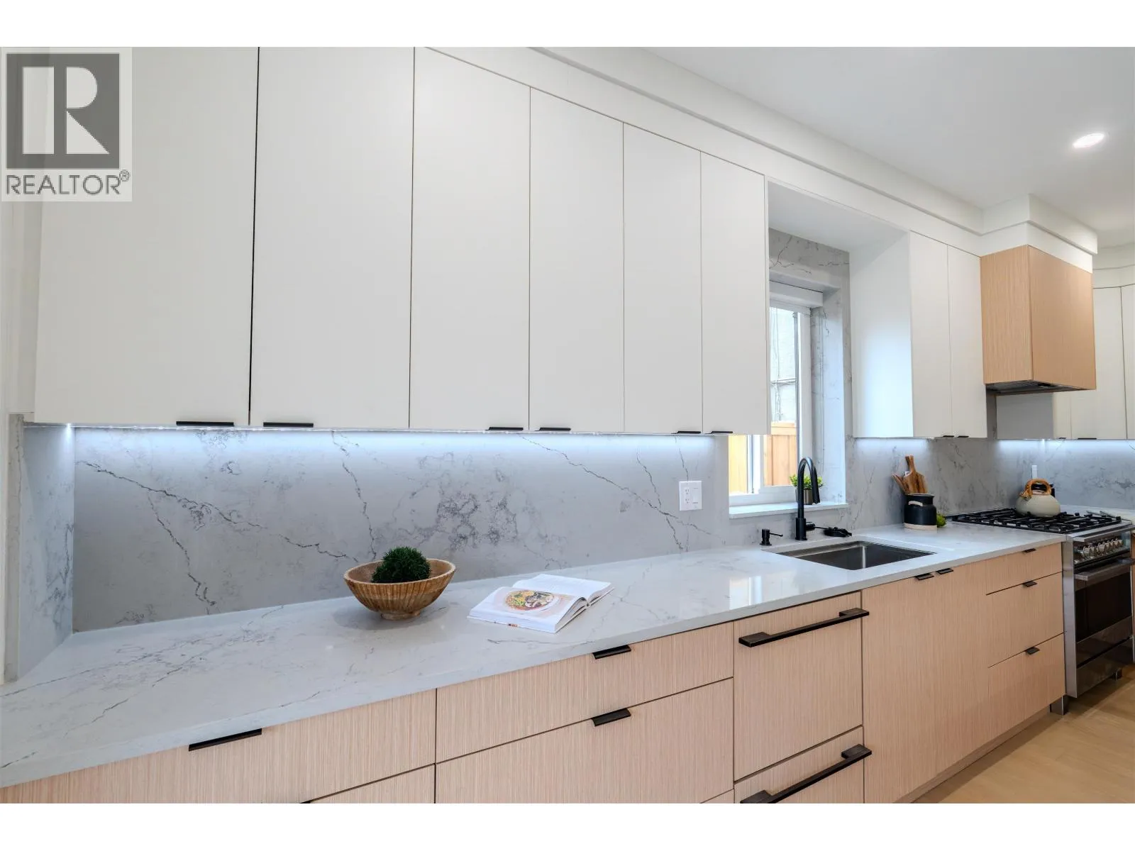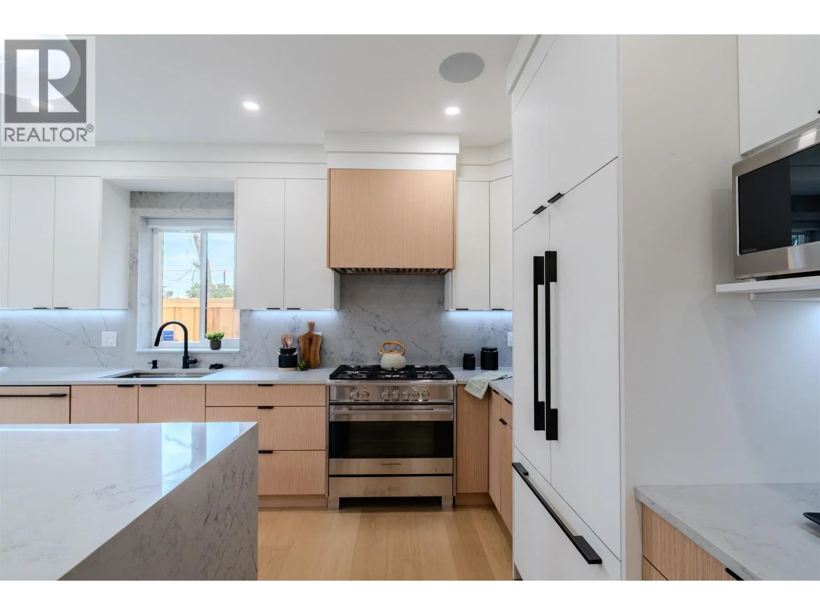 The Pender Vista Collection presents a brand new 4-bed, 4-bath ~1,700 sq.ft. rear 1/2 duplex, tucked away at the back of a rare 33Ã155 lot for privacy. Enjoy outdoor space and city & mountain outlooks from a private top-floor balcony. Interiors feature engineered hardwood, custom millwork, designer lighting, and smart home technology. The chef´s kitchen with built-in dining table boasts waterfall quartz, Fisher & Paykel appliances, gas cooking, and ample pantry. Spa-inspired tiled baths, A/C, and on-demand hot water ensure comfort. Minutes to parks, cafés, PNE, Adanac Bikeway, SkyTrain, and Brentwood Town Centre, with quick HWY-1 and Downtown access-quiet privacy meets city convenience. (id:27476)