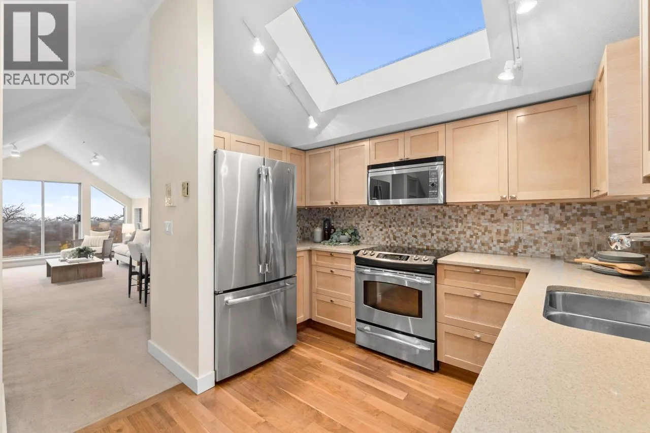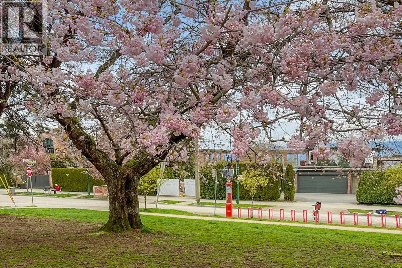 TOP 1/2 duplex with City, water & mountain VIEWS overlooking Cherry Blossom Park. Ideally situated in a special pocket of Kitsilano, this property has North, South & West exposures with over 400 square ft of decks. 2 bedrooms & 2 baths, vaulted ceilings and skylights provide plenty of natural light. Well maintained with renovated kitchen & baths. Adjacent to Point Grey Road and steps away from Jericho Beach, RVYC & Jericho Tennis Club. Kitsilano & Point Grey restaurants and coffee shops a short walk away. Single car garage as well as an open parking stall. A great neighbourhood! *Some photo is virtually staged. (id:27476)