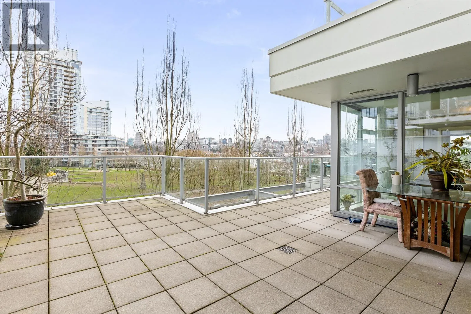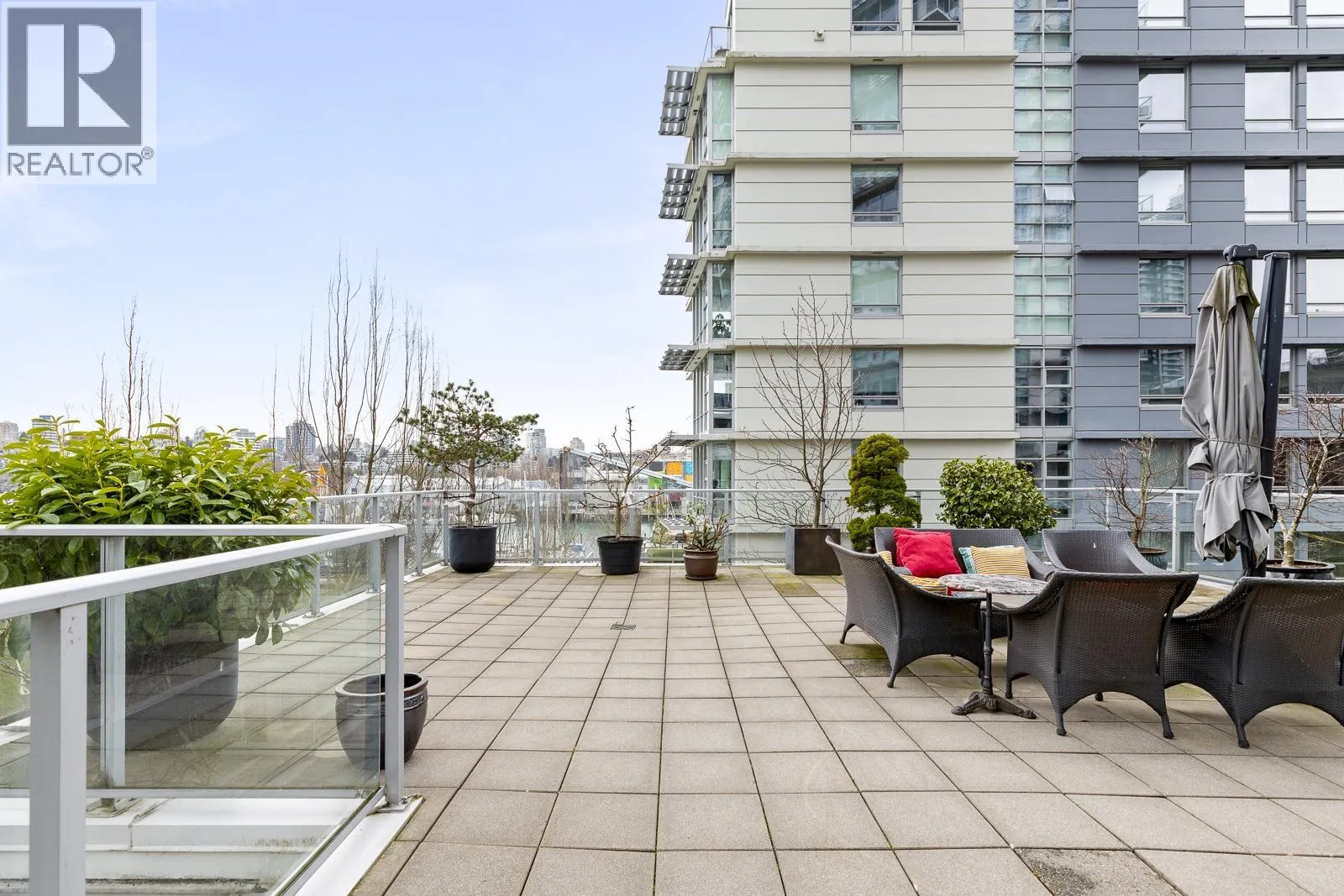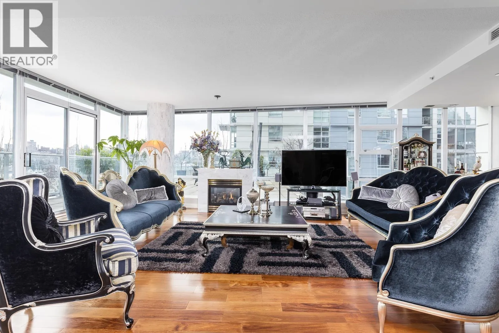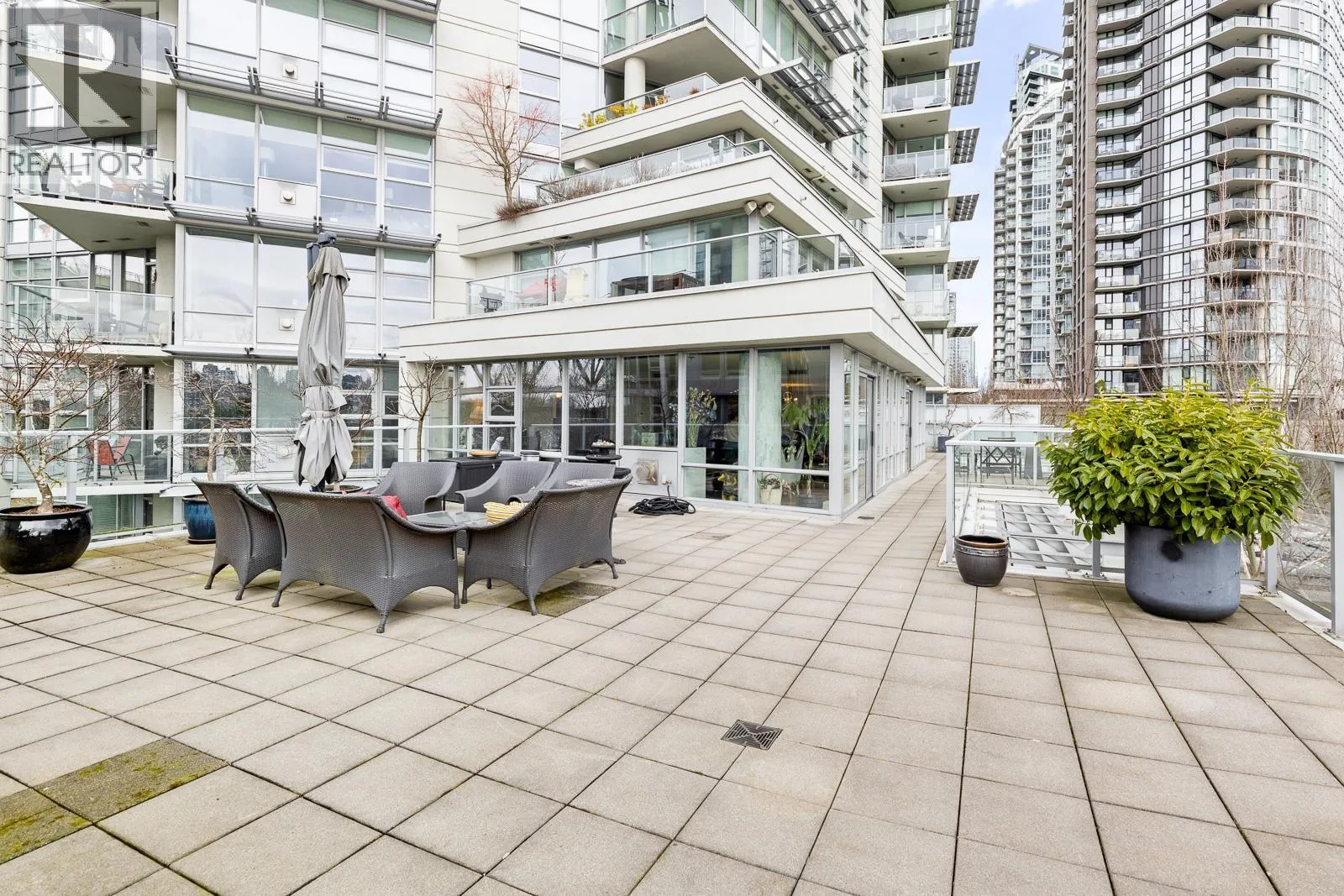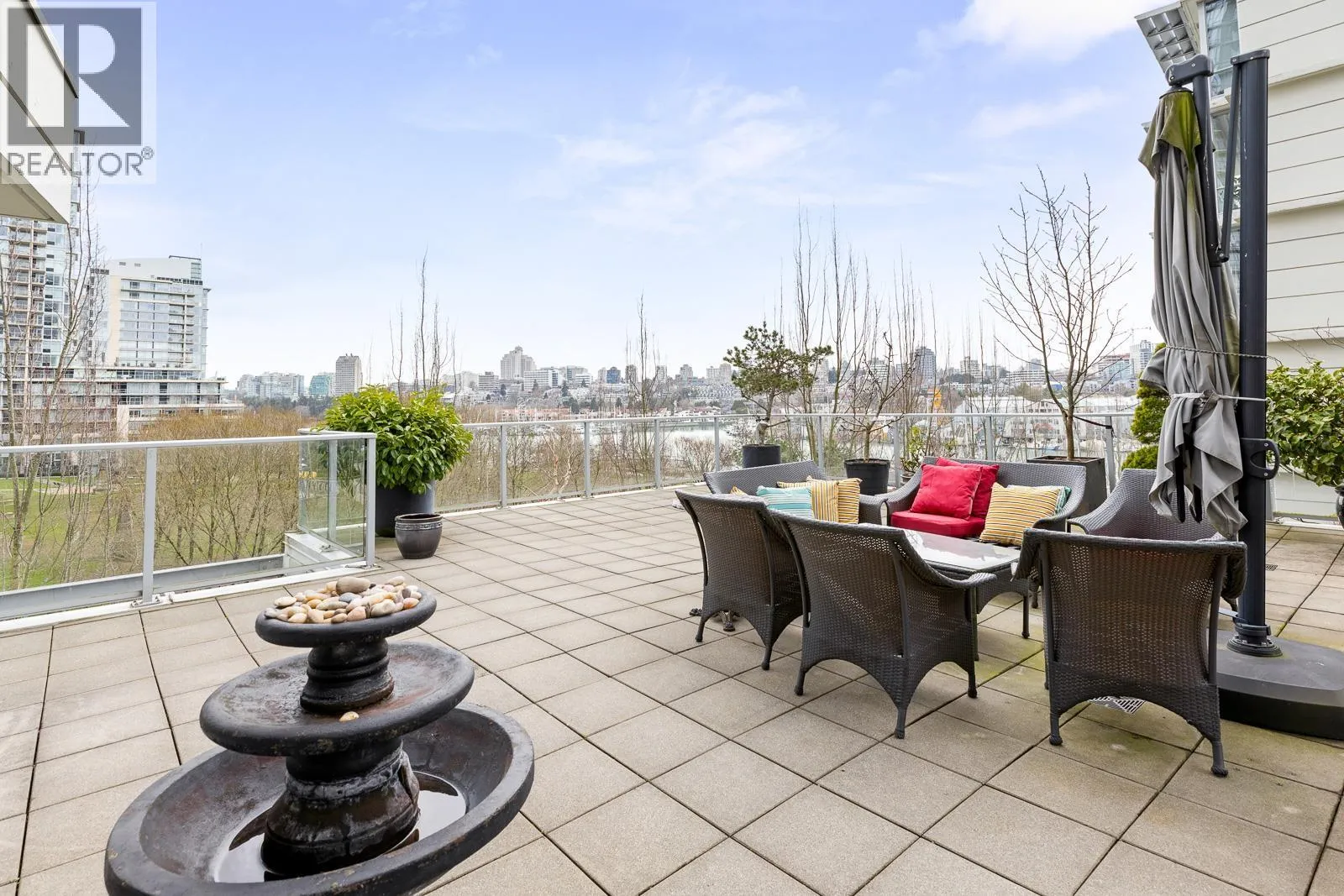 AIR CONDITIONED CORNER unit! Beautiful views directly overlooking park & water! South SUNNY & BRIGHT one of a kind unit. Well designed OPEN & SPACIOUS 2,172 sqft interior living w/A/C PLUS 1500 square ft of your own private landscaped terrace w/elegant gazebos & BBQ. 3rd floor perched up on the high side of the park. 2 bdrms + large den (could be 3rd bdrm) House size rooms w/chef's kitchen. Floor to ceiling windows completely surround the home & frame the NATURAL BEAUTY from outside! This most UNIQUE & SPECIAL home has penthouse quality finishings & appliances, marble gas fireplace. Inc. 2 side by side parking stalls. Prestigious, well run building. "The Icon I' offers concierge service, fitness center, pool, sauna (id:27476)