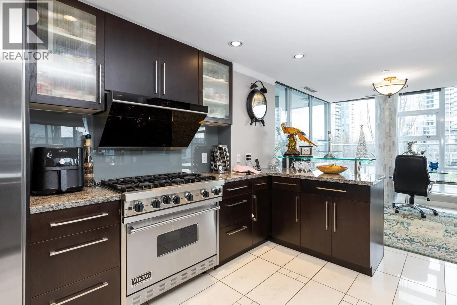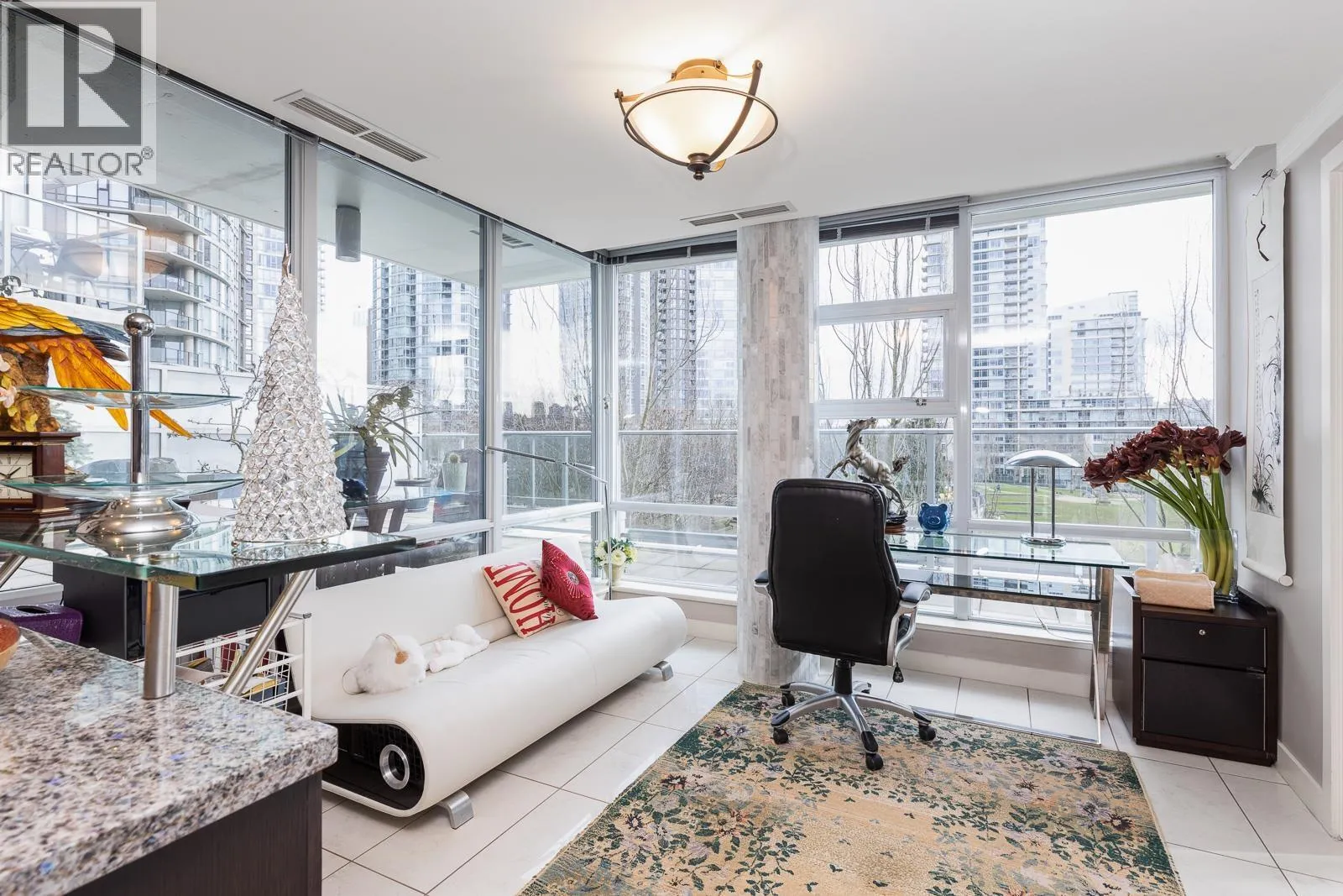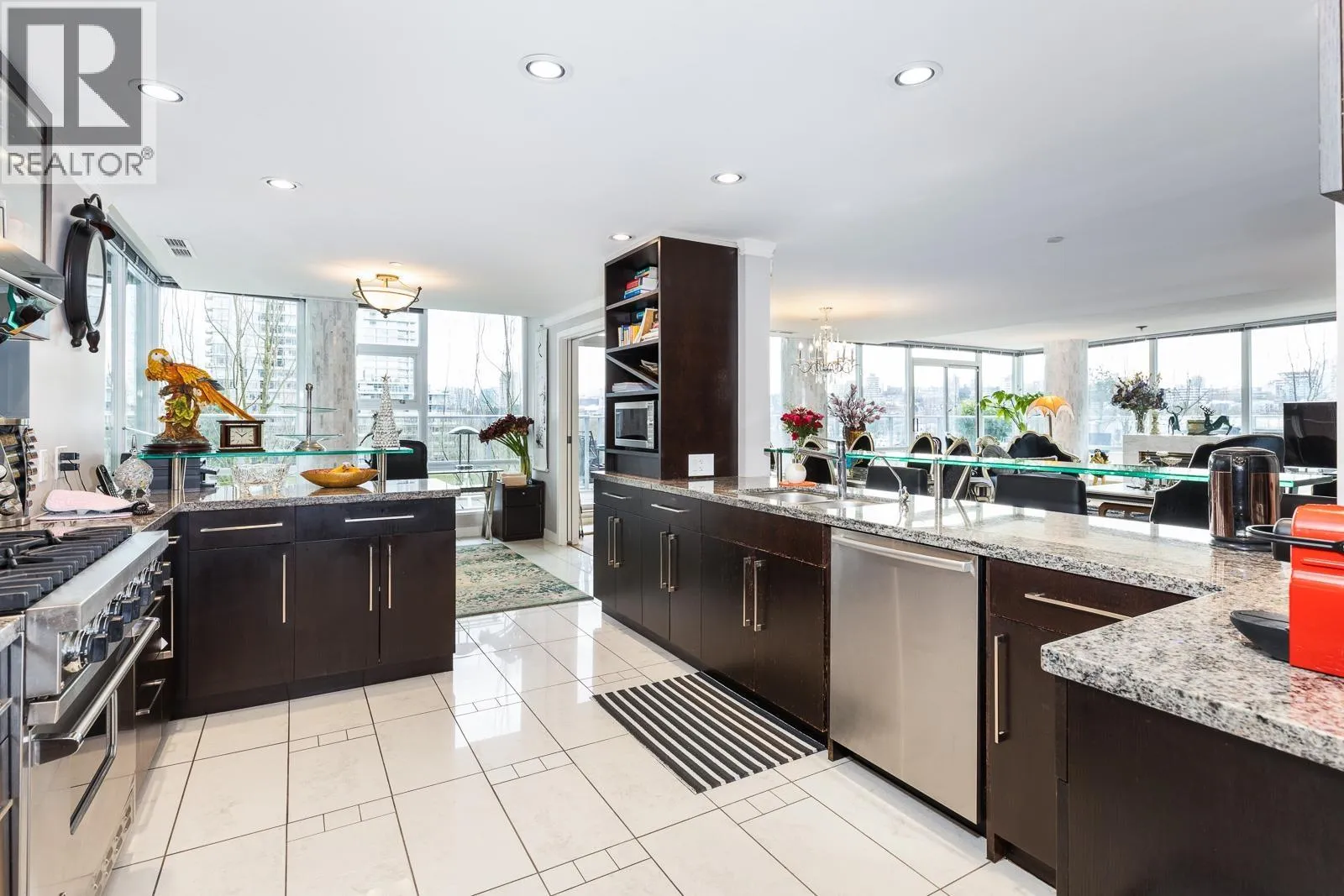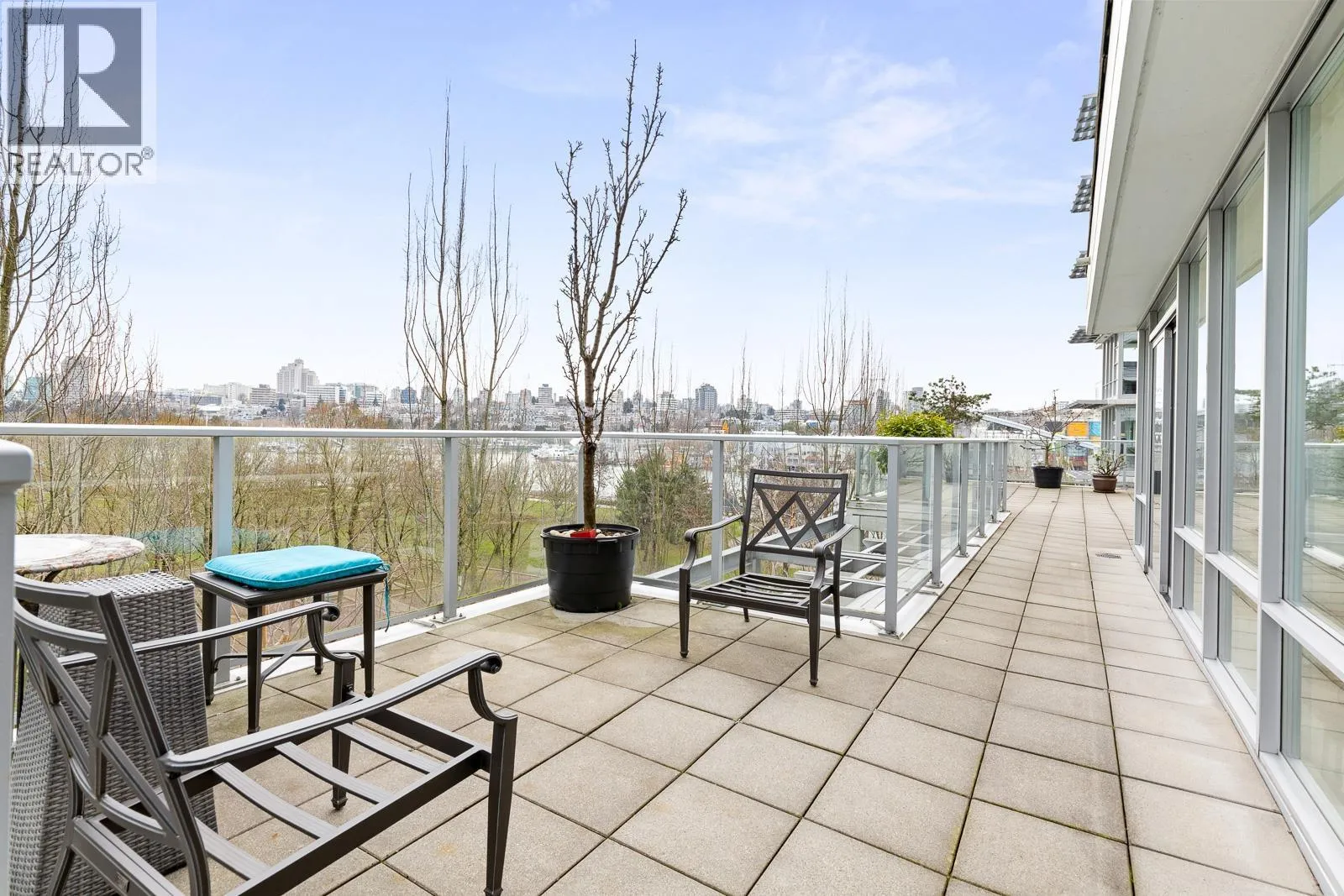 AIR CONDITIONED CORNER unit! Beautiful views directly overlooking park & water! South SUNNY & BRIGHT one of a kind unit. Well designed OPEN & SPACIOUS 2,172 sqft interior living w/A/C PLUS 1500 square ft of your own private landscaped terrace w/elegant gazebos & BBQ. 3rd floor perched up on the high side of the park. 2 bdrms + large den (could be 3rd bdrm) House size rooms w/chef's kitchen. Floor to ceiling windows completely surround the home & frame the NATURAL BEAUTY from outside! This most UNIQUE & SPECIAL home has penthouse quality finishings & appliances, marble gas fireplace. Inc. 2 side by side parking stalls. Prestigious, well run building. "The Icon I' offers concierge service, fitness center, pool, sauna (id:27476)