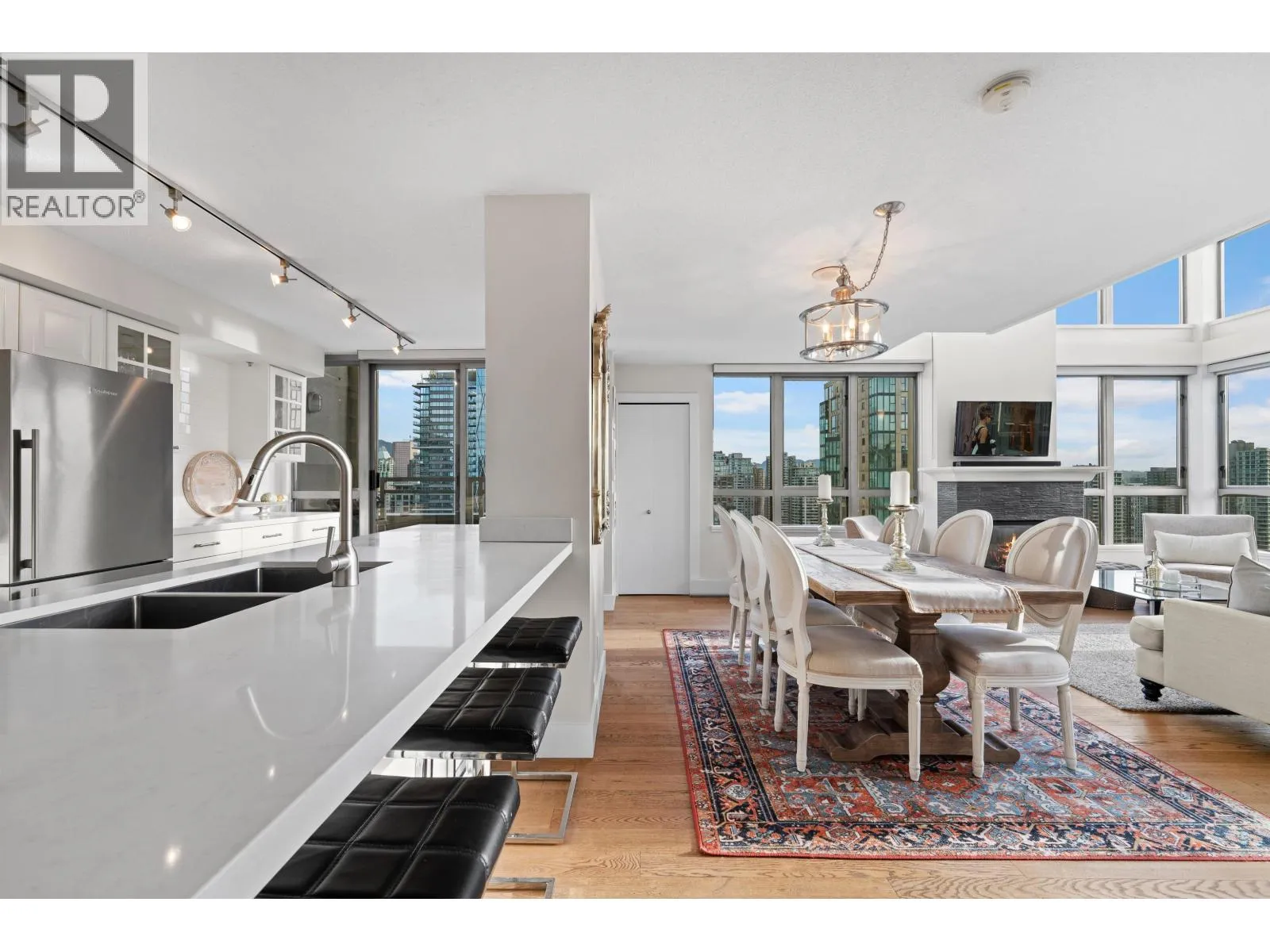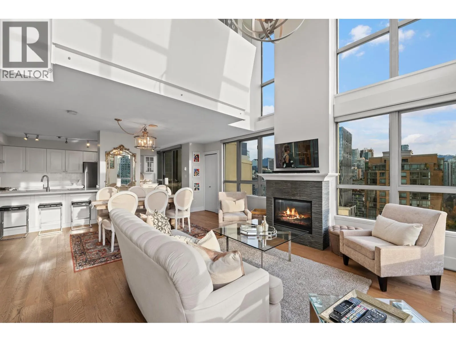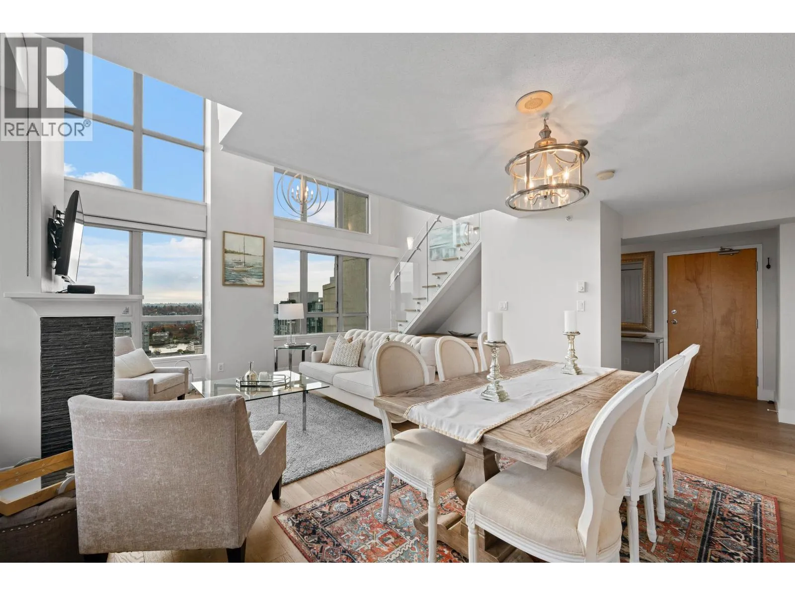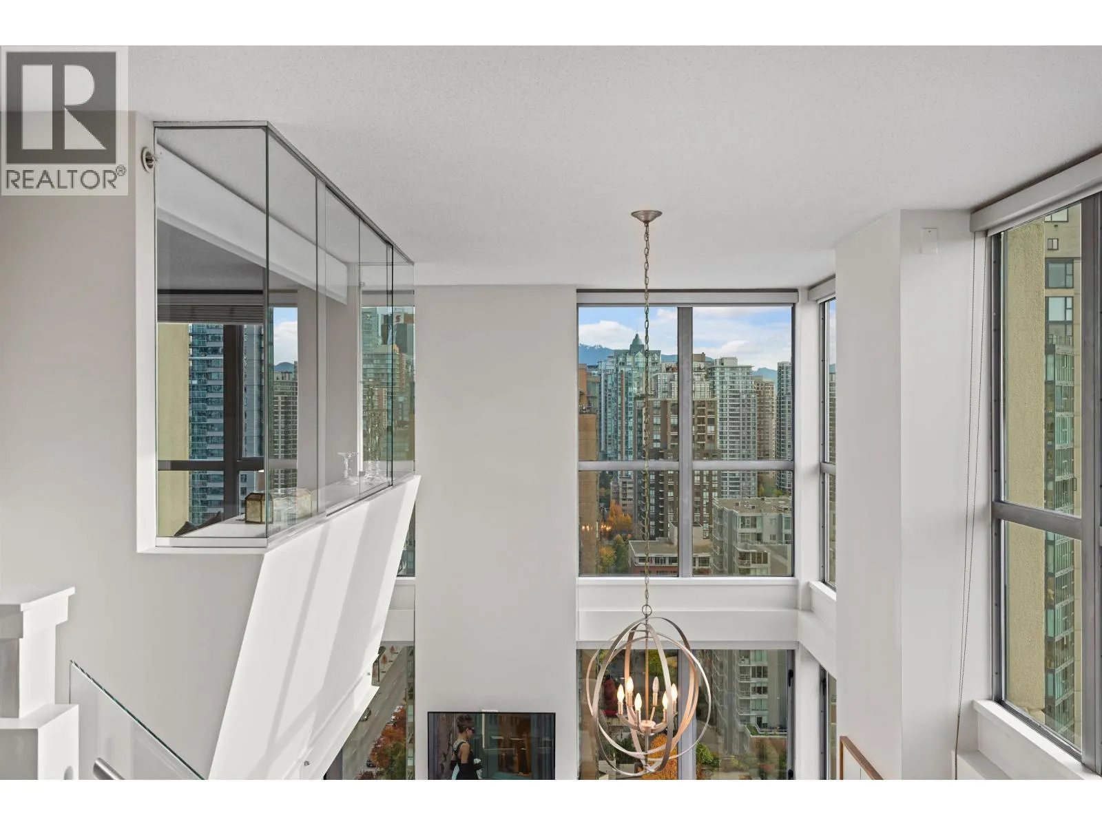 A true Yaletown icon. With 1,542 square ft of living space, 16-foot ceilings, and panoramic city-to-mountain views, this bright two-level corner loft at The Metropolis delivers both style and comfort. The fluid layout merges a granite-clad kitchen and open dining area with a dramatic double-height living room wrapped in glass and filled with natural light. Upstairs, the mezzanine reveals the primary suite with dual closets, ensuite, and a versatile den. A second bedroom on the main level provides ideal separation for guests. Set within a well-managed concrete building all just steps from the Seawall, parks, cafés, and Yaletown shopping. (id:27476)