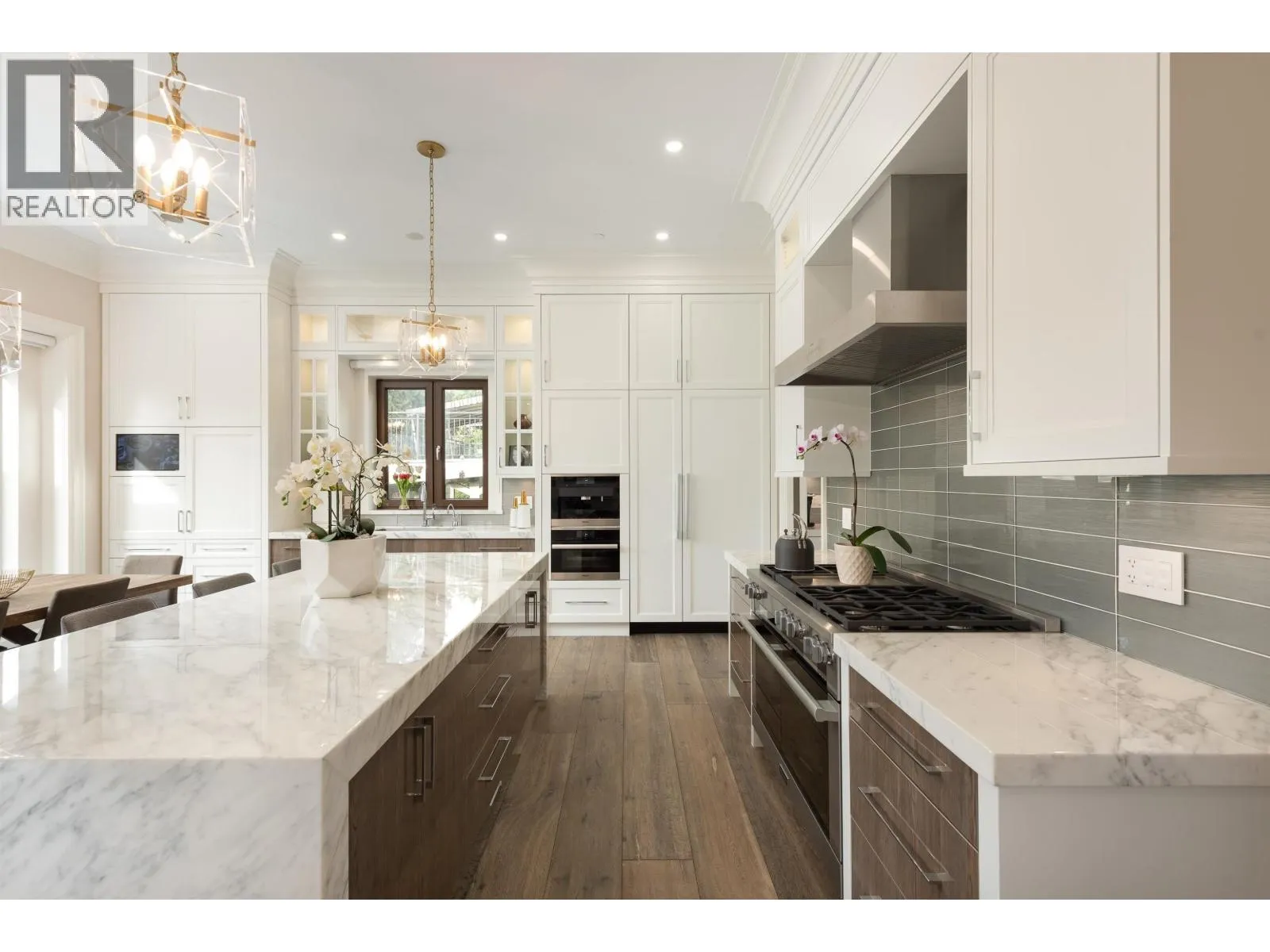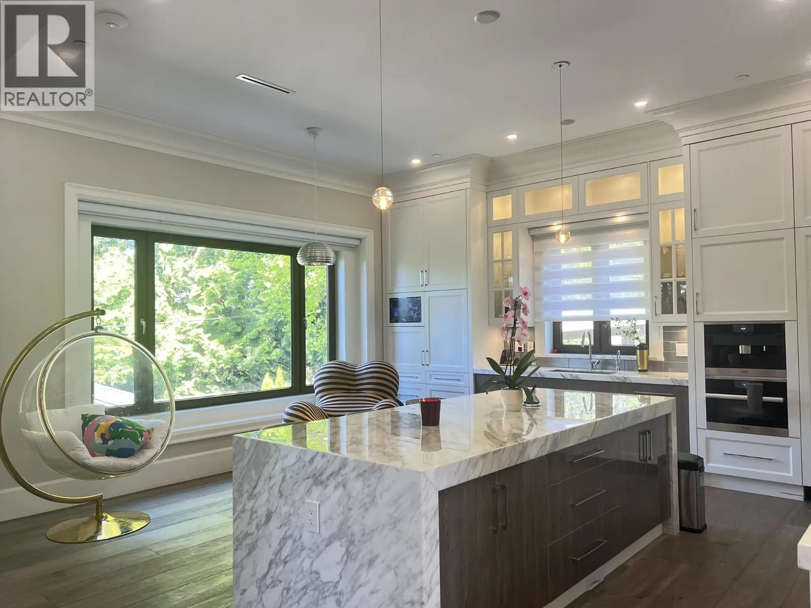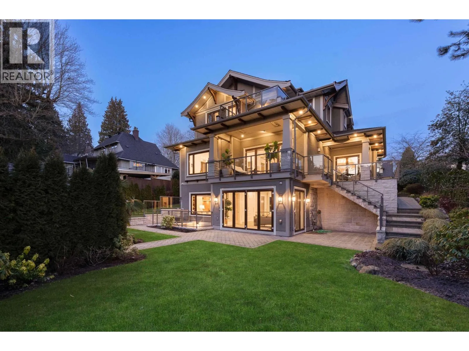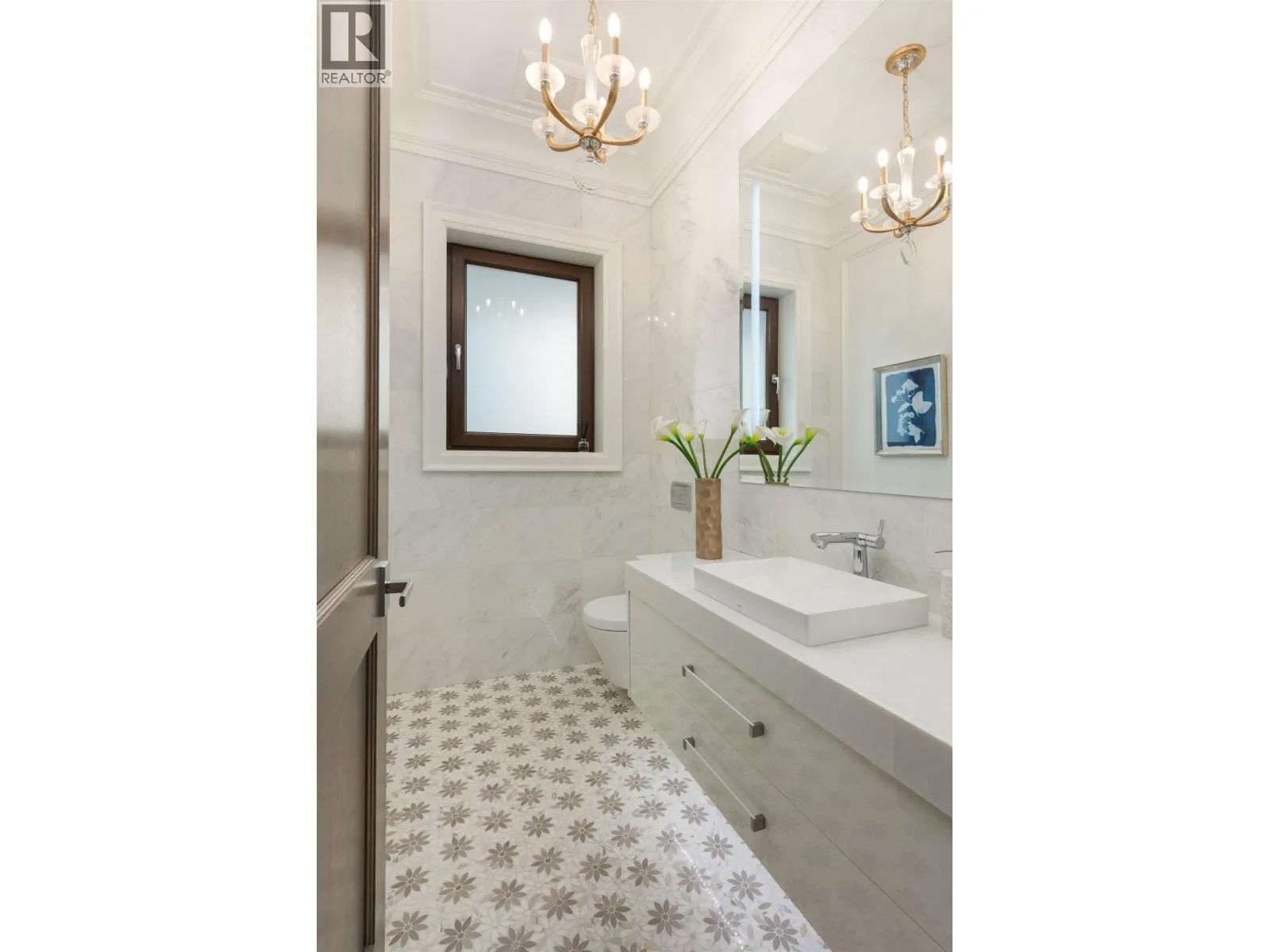 An extraordinary 4-level, 5-bedroom, 6.5-bathroom elevator served West Coast Modern masterpiece, nestled in the prestigious Shaughnessy neighborhood. As you step through the solid core front door, you are immediately welcomed into an expansive open-plan living space, elegantly appointed with Bocci chandeliers and exquisite White Oak solid wide plank flooring. The west-facing orientation and expansive turn-and-tilt windows fill the home with a generous flow of natural light, creating an inviting ambiance. The chef´s kitchen and wok kitchen showcase high-gloss cabinetry, Calcutta Gold waterfall countertops, and elite appliances, including a cappuccino machine and steam oven, designed for the most discerning culinary enthusiasts. Entertaining at this residence is effortless, generous living areas adorned with marble fireplaces, large patios that overlook beautifully manicured gardens, a state-of-the-art theatre room, a sophisticated wet bar, and a climate-controlled wine room that caters to the connoisseur. (id:27476)