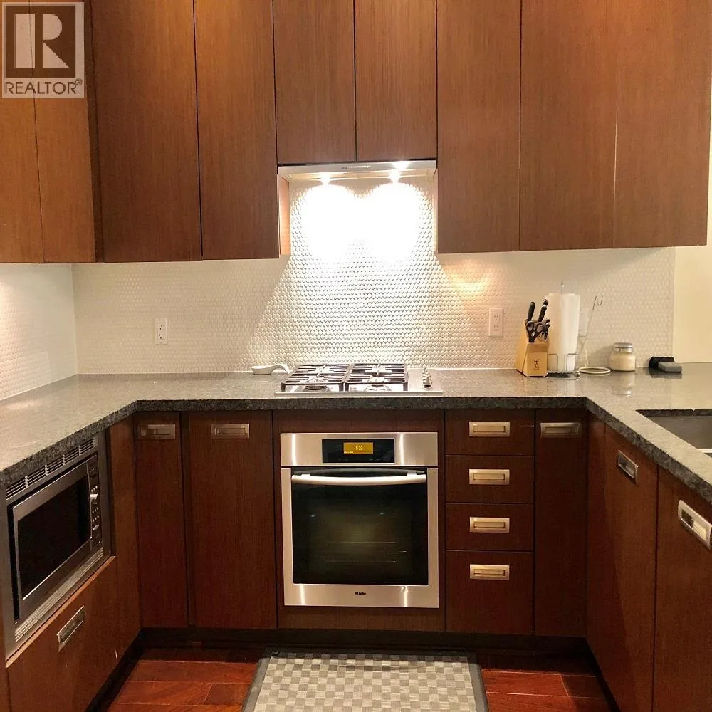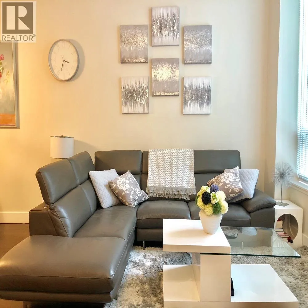With 1216 square feet spread over 2 stories, this Yaletown furnished townhouse rental at The Donovan offers contemporary living with a sophisticated style and sweeping 14 foot ceilings. You will feel right at home thanks to the modern and neutral furnishings, perfect for anyone's style. The foyer as you enter the townhome is spacious with plenty of closet space. The living area houses a plush leather sectional, cozy area rug, and coffee table. A chic dining area has a 5 person glass dining table illuminated by a chandelier, and can be extended to seat 8 when entertaining. With granite counter tops, modern stainless steel appliances, a gas stove, and pull out kitchen faucet, you will love cooking in your new home. (id:27476)