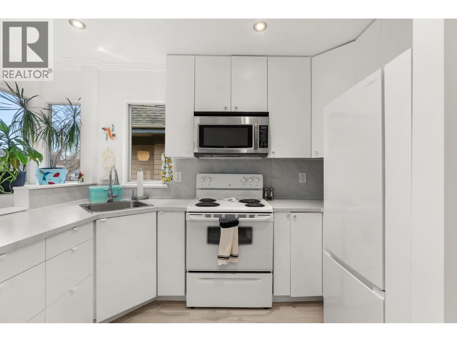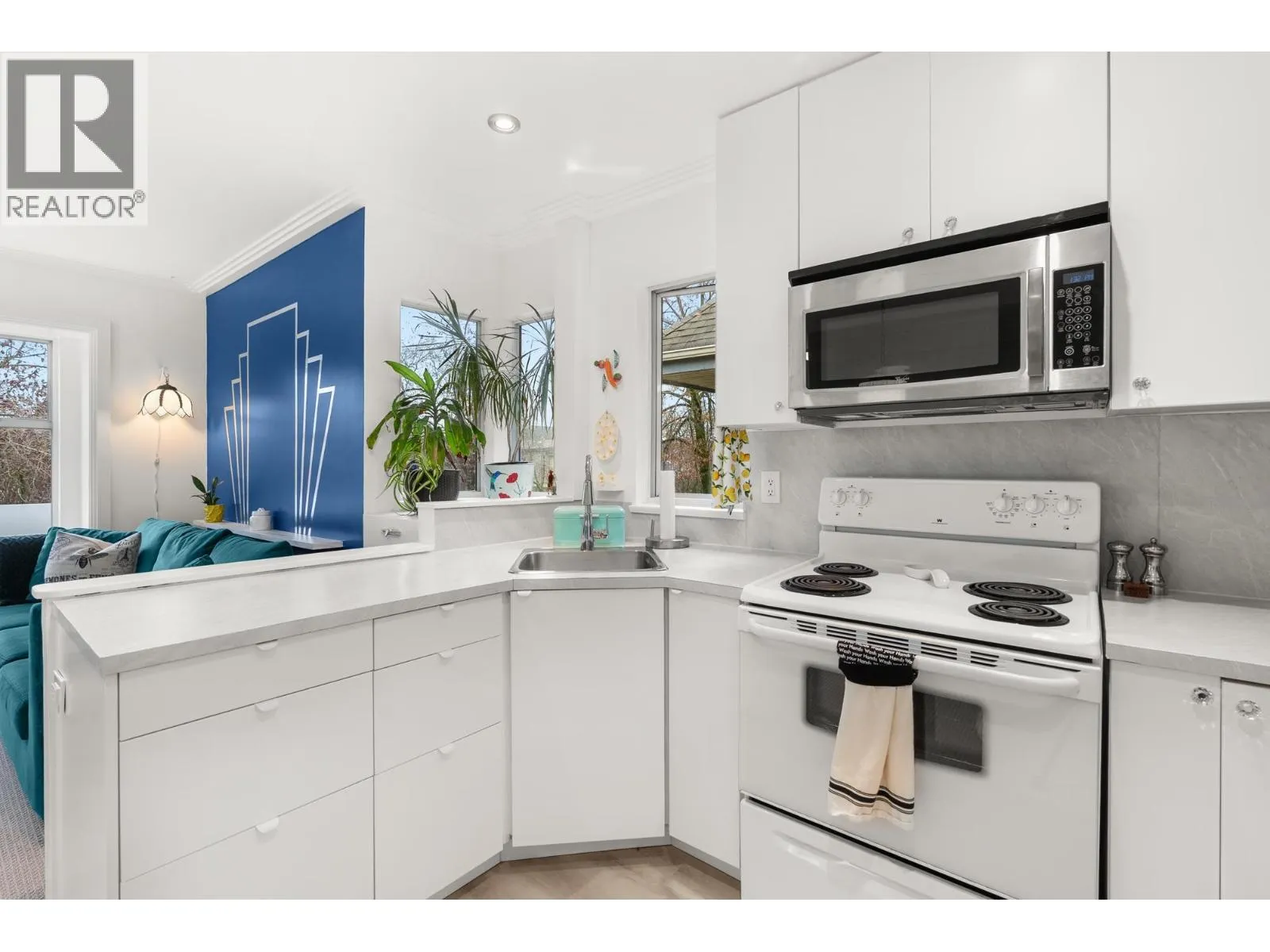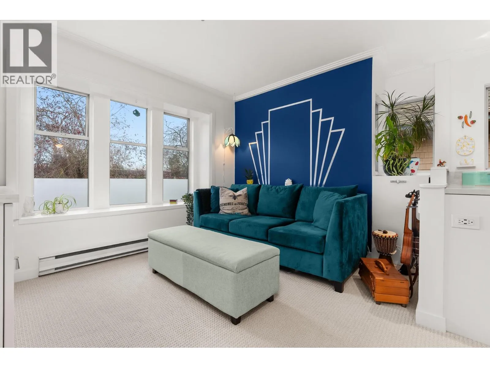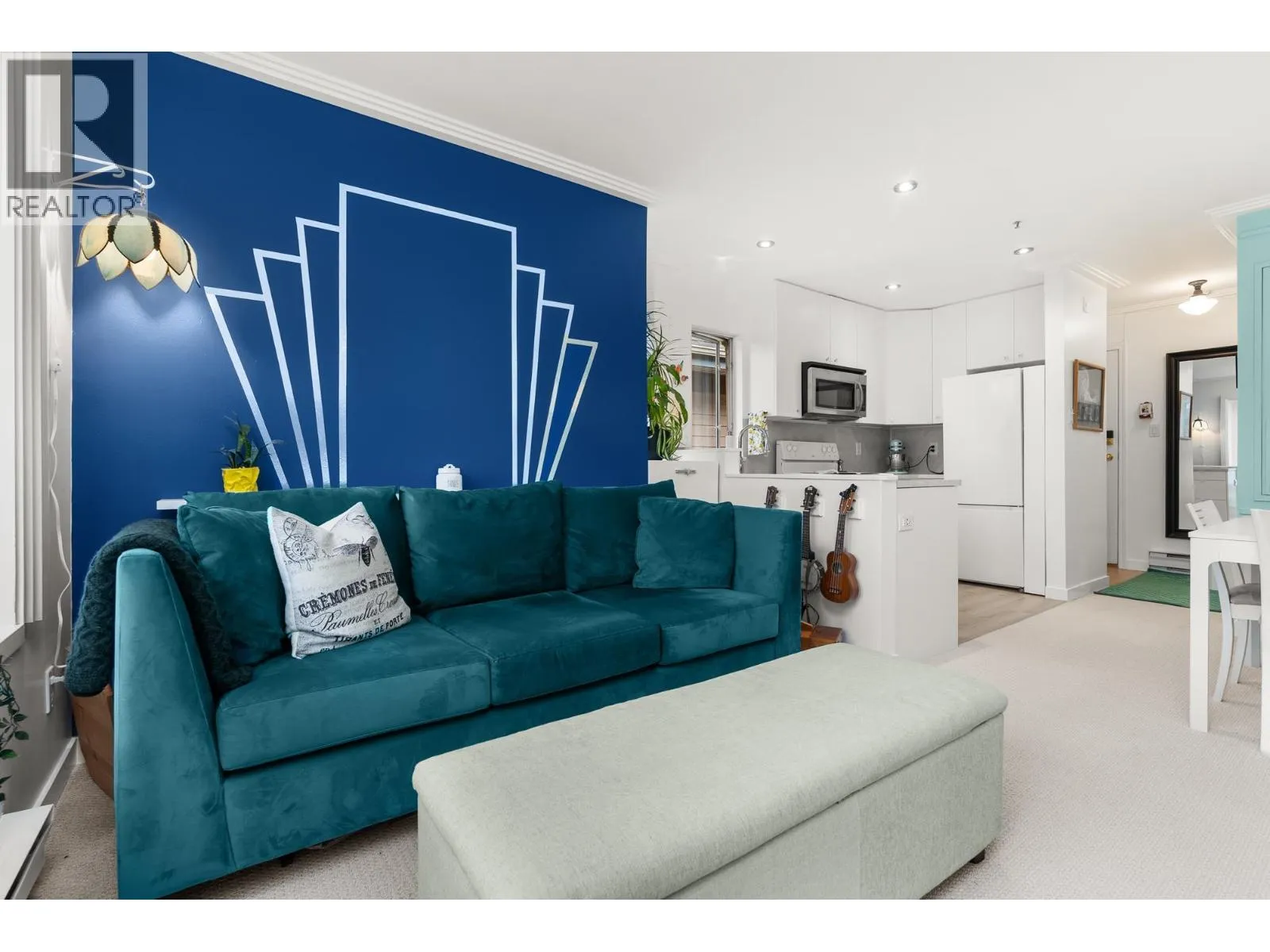 Perched on the top floor corner looking south, this open plan 1 bed & 1 bath almost 600 sqft apartment is in the sought after Connaught Estates. An abundance of windows on three sides plus a skylight in the bedroom floods this home with light. An open kitchen flows into the living and dining room, smart built ins throughout for added storage with crown moldings, smoothed out ceiling, newer carpet and kitchen flooring and paint. Enjoy the quiet with only one common wall, outlook to open green space across the street & far enough from traffic. With new elevators, recent work to balconies, this building is so well maintained. Steps to Cambie, the Canada & Broadway Subway Line, VGH, shops, restaurants and all the benefits of Fairview & the Cambie Corridor. (id:27476)