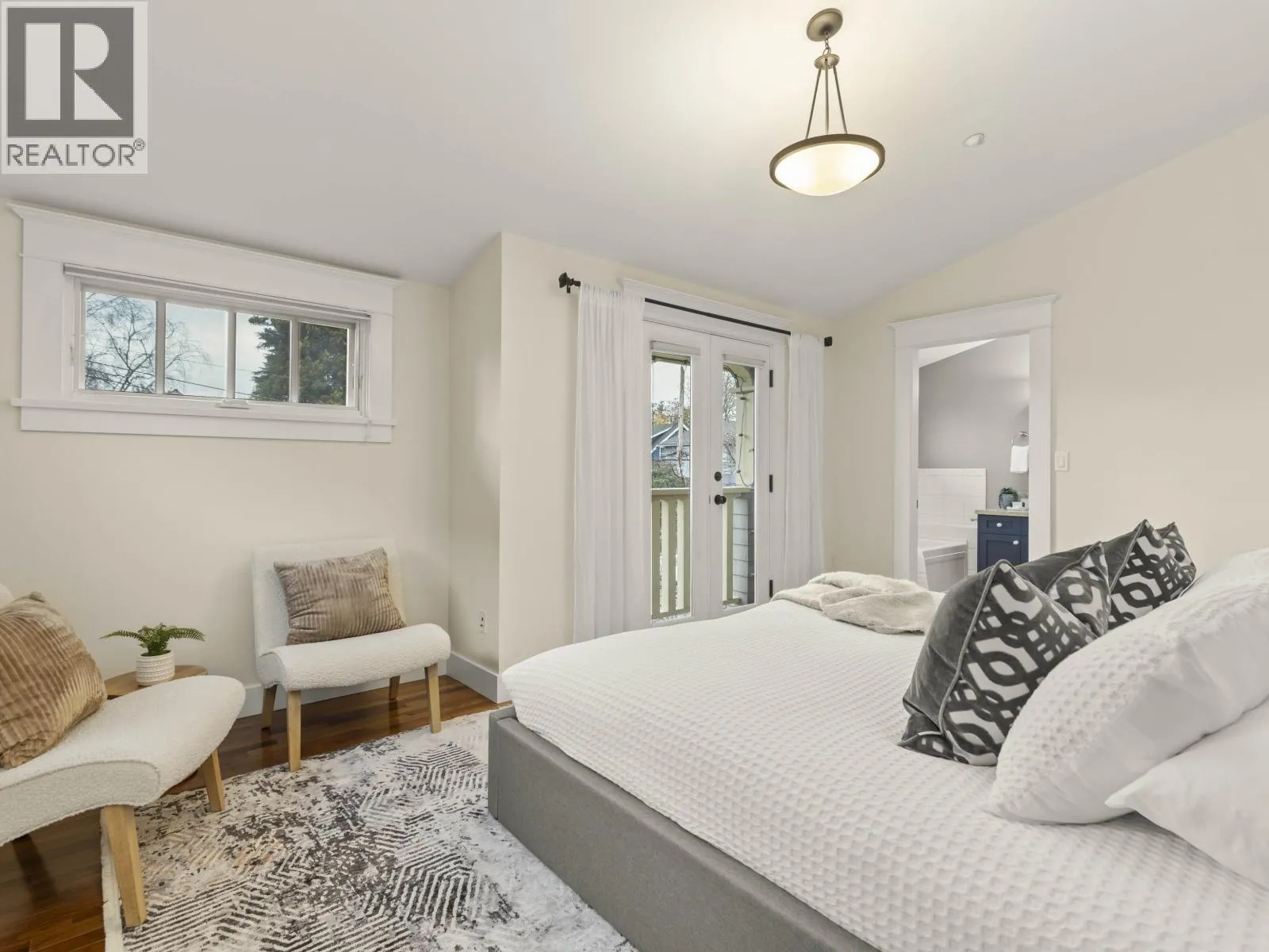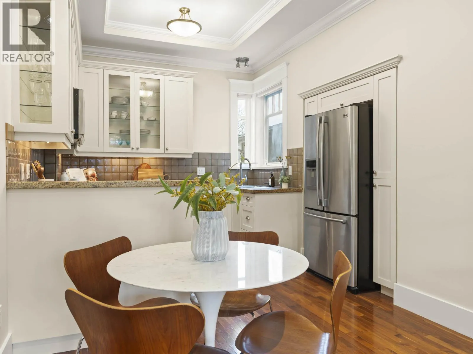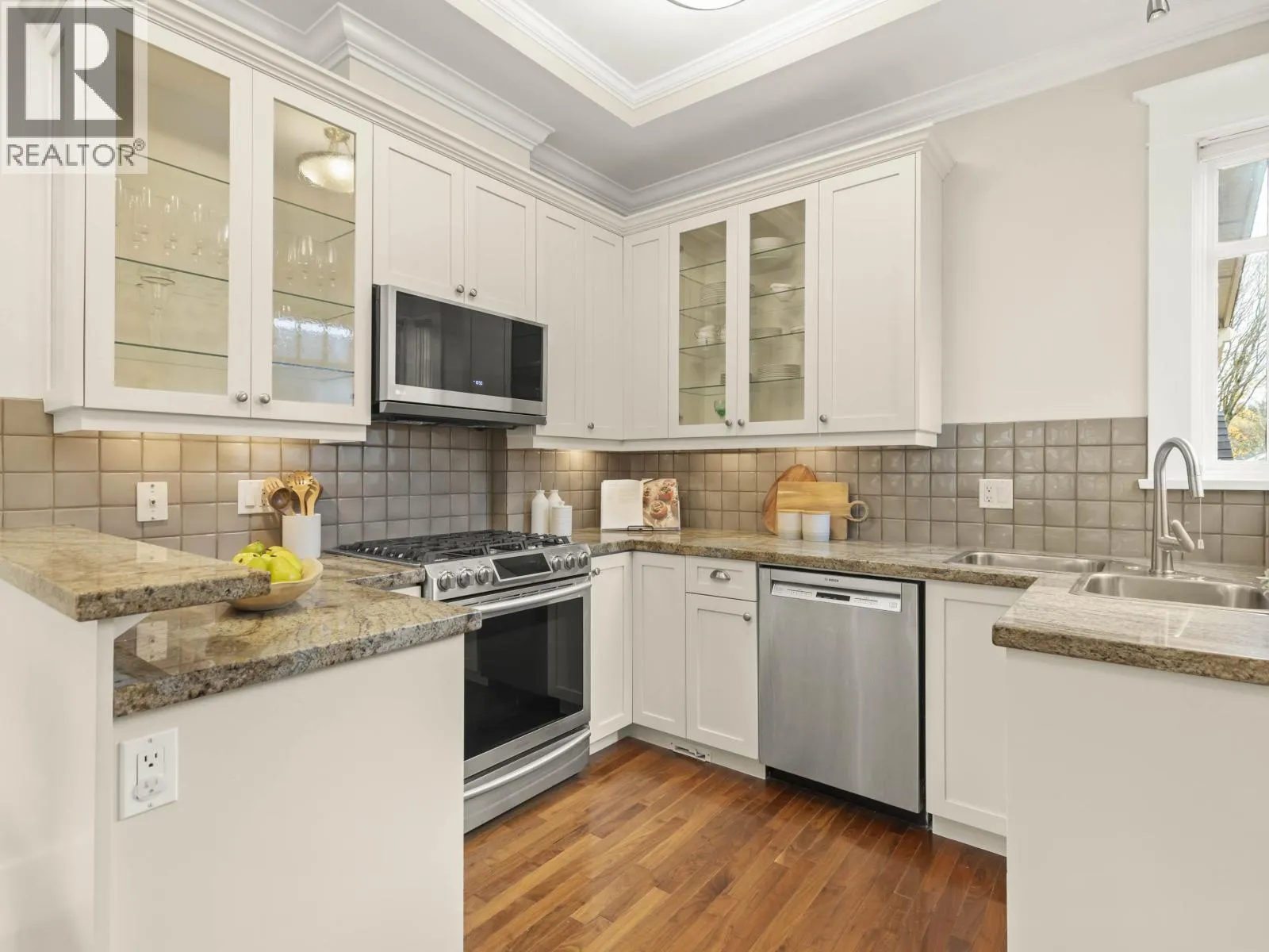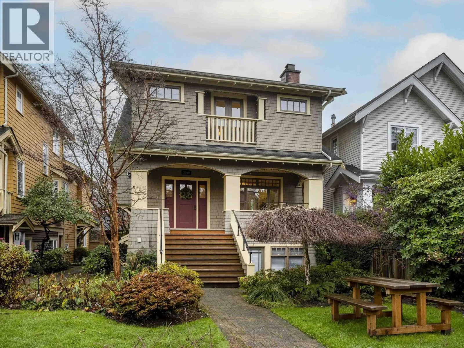 Beautiful Kitsilano craftsman-style 2-level home blending heritage charm with modern updates. Features 9'-12' vaulted ceilings, crown moulding, maple/cherry hardwood floors, vented skylights and a cozy gas fireplace. Updated kitchen with refinished cabinets, granite counters, Samsung gas stove and upgraded appliances. Two bedrooms each with full ensuites plus a handy workspace nook. Enjoy in-floor geothermal radiant heat, built-in speakers, fresh paint and upgraded lighting. Landscaped gardens, private parking pad and an unbeatable walkable location close to schools, parks, shops, transit and the beach. Minutes to UBC and downtown. (id:27476)