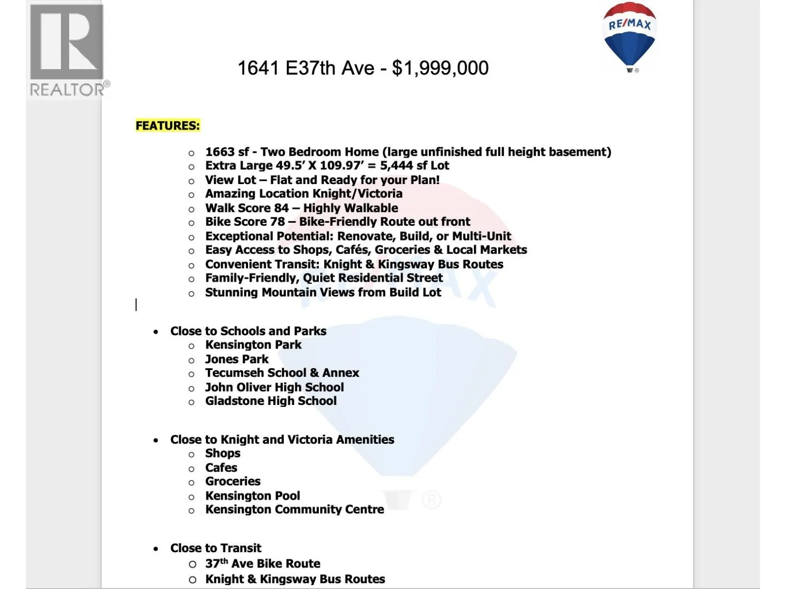 Welcome to 1641 E37th! This charming 2-bedroom, 1,750 SF home sits on an impressive 5,444 sf OVERSIZED lot along a calm bike route with lovely mountain views! With its full unfinished basement, this property offers exceptional potential for those looking to live, renovate, or develop. Whether you plan to refresh the existing home, build your dream residence, or explore multi-unit possibilities, the options are wide open. Ideally situated just east of Knight and mere steps to two parks, Kensington Community Centre, and Tecumseh School & Annex, it´s perfectly positioned for family living or a multi-home project. Enjoy quick access to shops, cafes, groceries, and transit. Don´t miss the ONE on E37th! Showings by Appointment. (id:27476)
