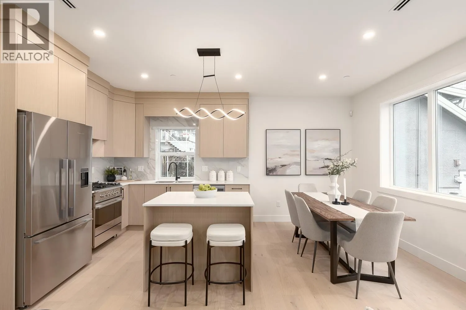 This rare TWO LEVEL 3-bedroom home at The Westline Collection delivers bright south facing living on a quiet tree lined street. The open main floor offers massive living and dining spaces, wide plank light oak engineered hardwood, and a Scandinavian inspired island kitchen with Fisher Paykel appliances, quartz counters and backsplash, under cabinet LED lighting, and custom millwork. All bedrooms sit on the 2nd level, ideal for families, with a primary suite that includes a generous walk in closet and ensuite finished with Italian and Spanish tile, Riobel matte black fixtures and quartz counters. Enjoy full size laundry, built in closet organizers, EV charger parking, and smart home features in a truly convenient location close to amenities, cafes (Breka!), restaurants, and transit. (id:27476)