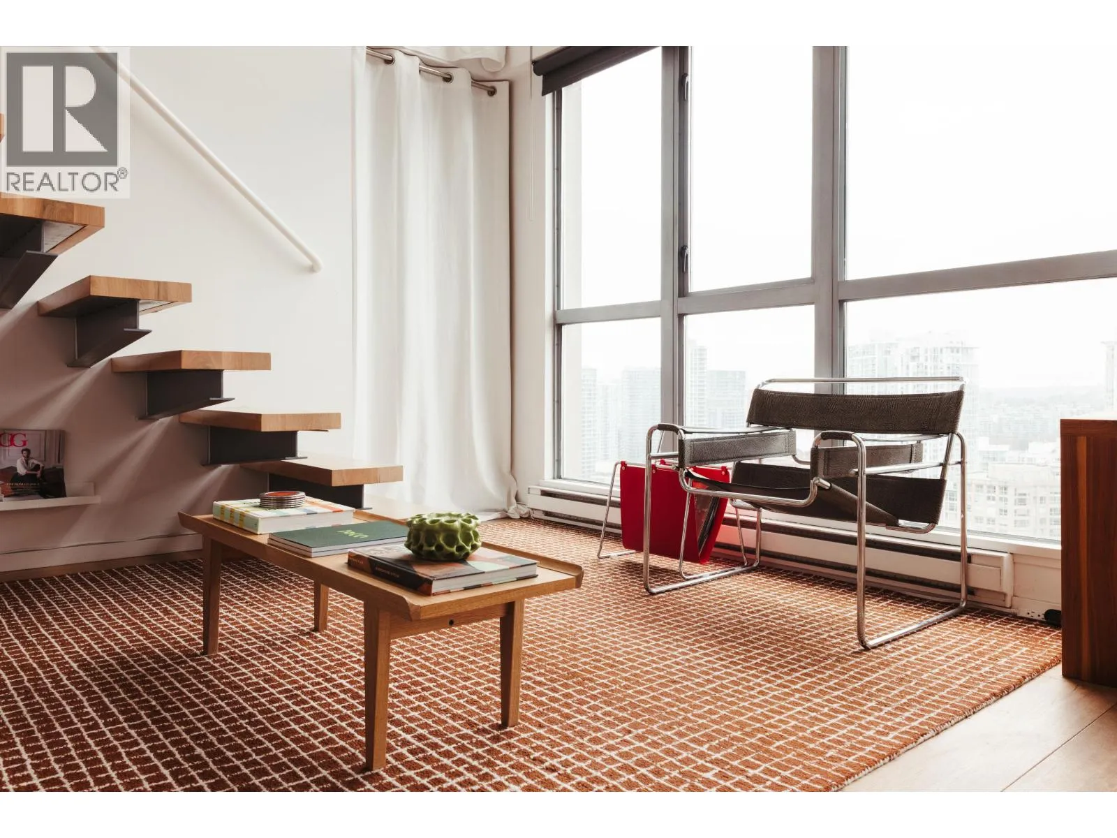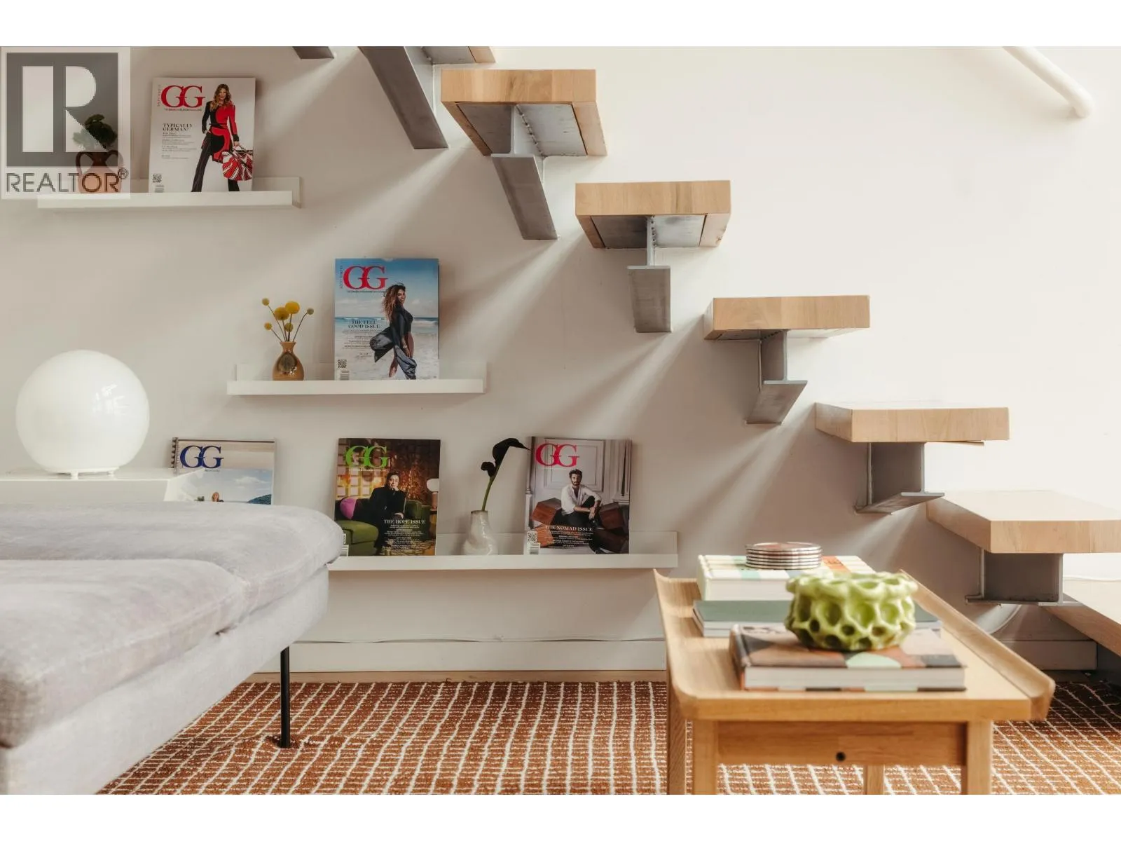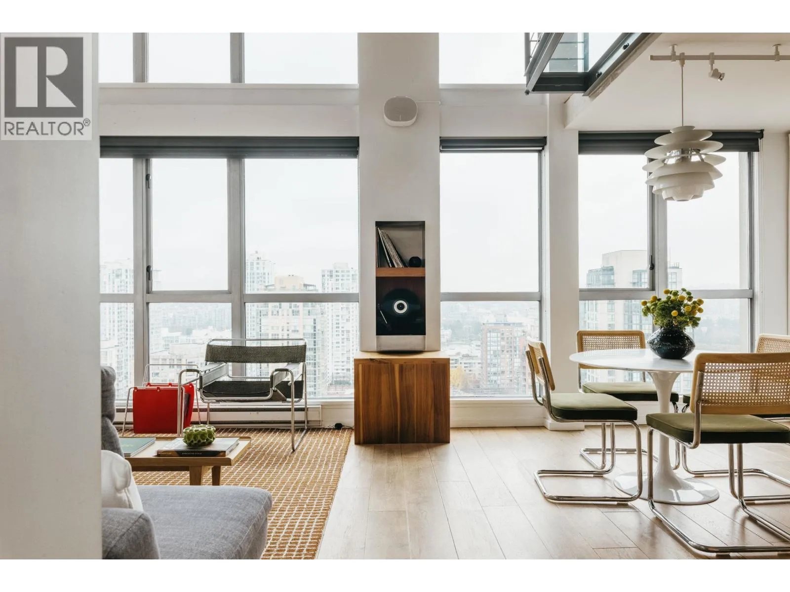 A true showpiece loft with undeniable cool factor. This rare south-facing residence offers panoramic views of False Creek, the city skyline, and Mount Baker-one of Metropolis' most iconic lofts. The 952 sq ft. two-level, 1 bedroom+ flex, 2 bath home has been fully reimagined with a sophisticated renovation that blends design and function. Soaring 16 ft. ceilings and wall-to-wall windows flood the space with light. A custom cantilevered staircase with glass-floor extension anchors the home, alongside Remplus glass doors, lighting by Louis Poulsen and Bocci, premium appliances, and Blu Bathworks fixtures. Set along a treelined stretch of Richards Street, this boutique building offers direct access to a grocery store, fitness centre, and salon. OPEN HOUSE SAT DEC 20TH, 2-4PM (id:27476)