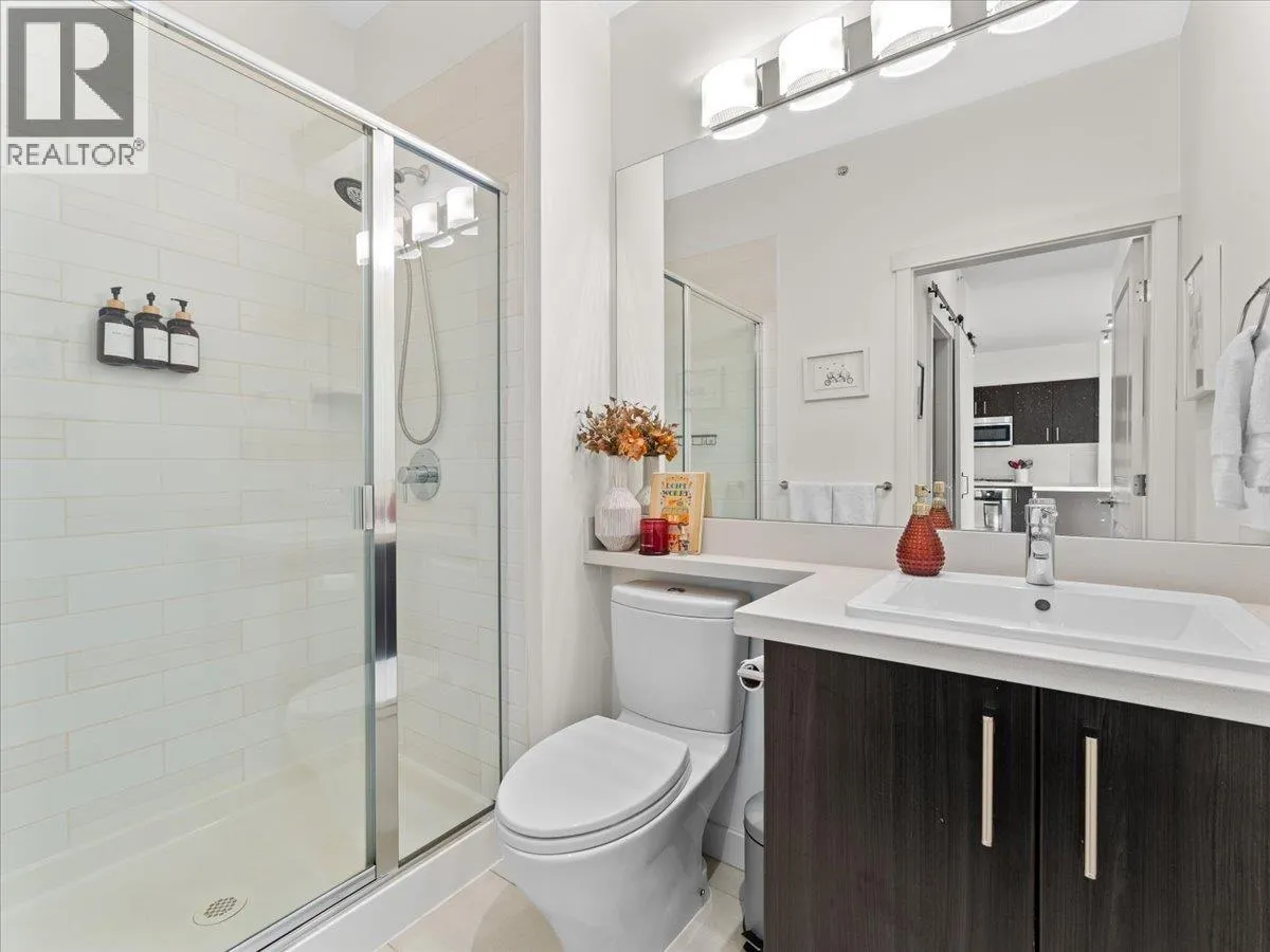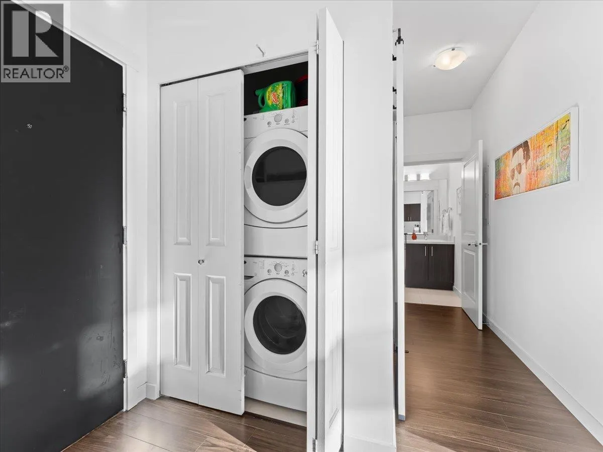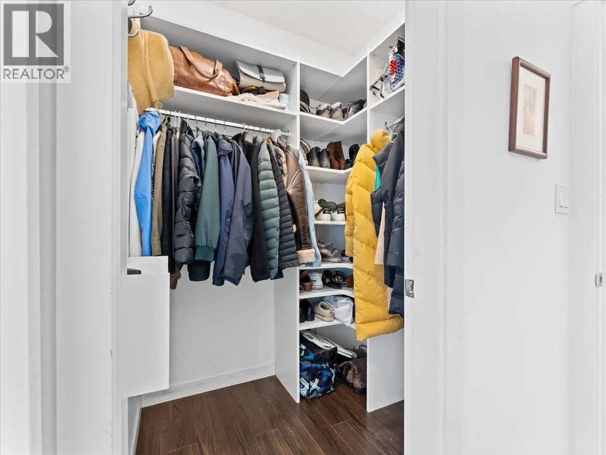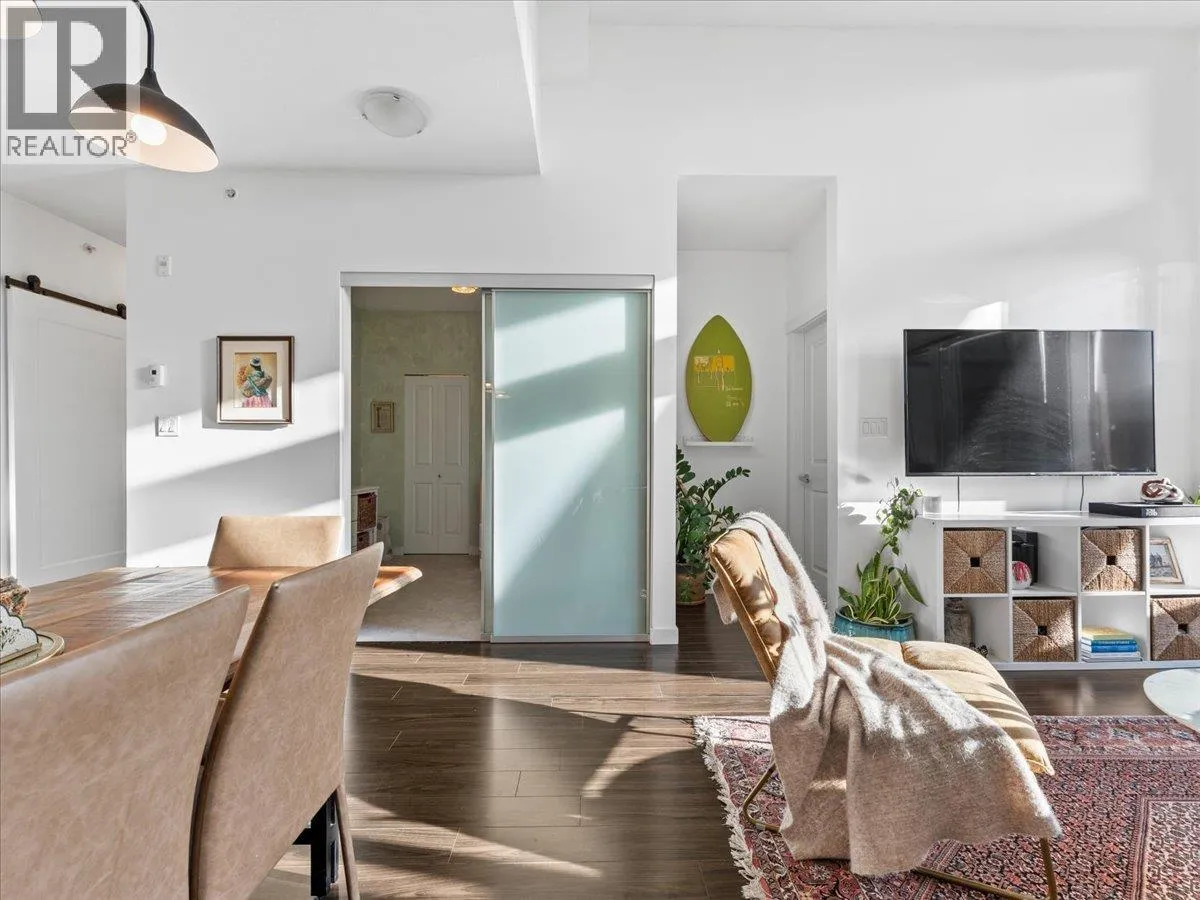 Experience the perfect blend of nature, urban living and luxury in the vibrant River District. This beautiful and spacious TOP FLOOR 2 bedroom condo boasts VAULTED CEILINGS and open concept living plan that seamlessly connects spacious dining/ living areas. The chef's kitchen is equipped with quartz counter tops, breakfast bar, gas range, designer appliances, & cabinets. Large primary bedroom features a walk in closet, spa- inspired ensuite, double vanity, soaker tub & separate shower. Den has been converted into multi- functional closet for extra storage. Step outside your covered balcony to enjoy morning coffee & outdoor entertaining all year round. Bonus 2 side by side parking & extra storage locker for convenience. Steps away from trails, shops, eateries- truly the perfect lifestyle. (id:27476)