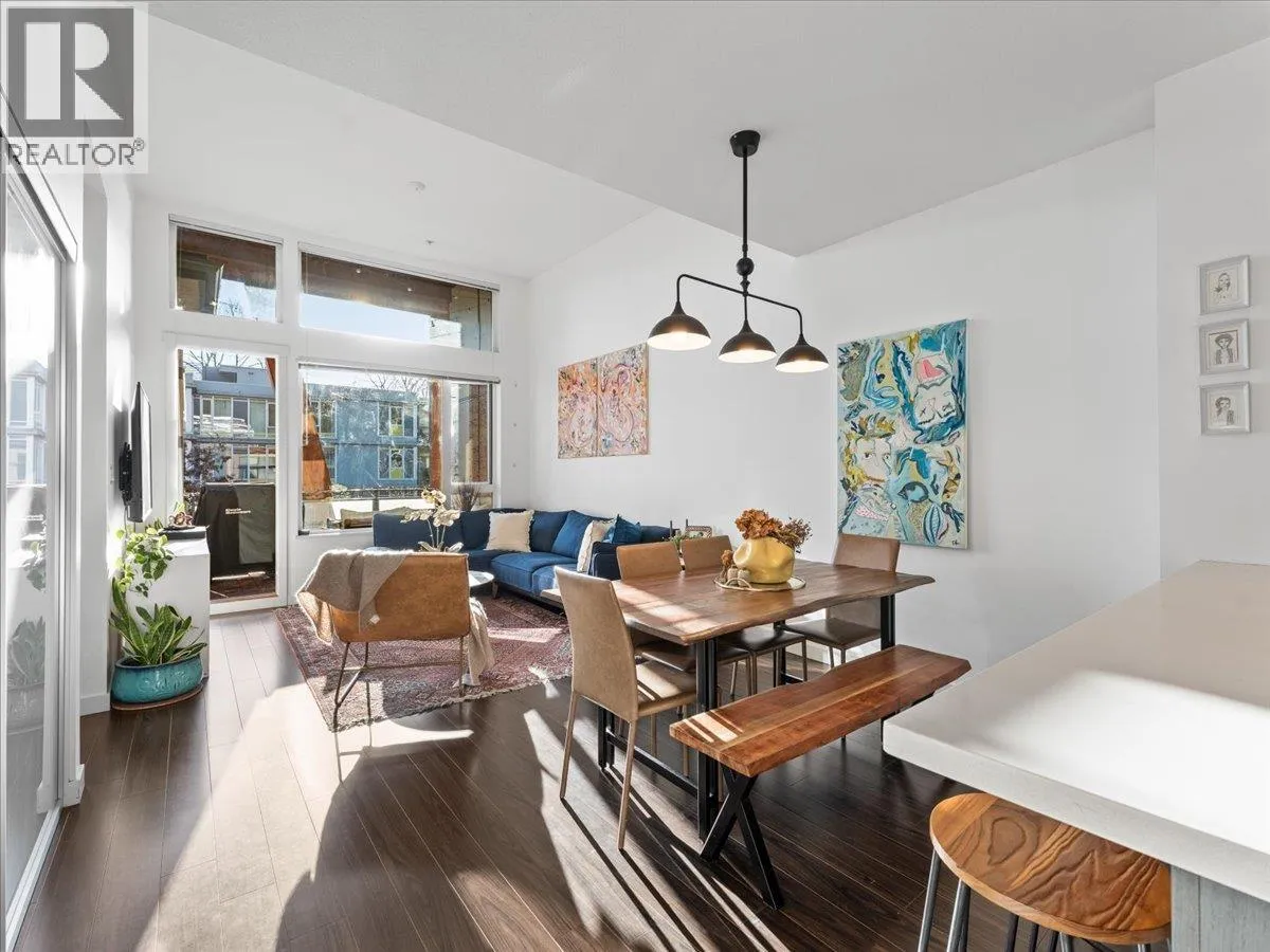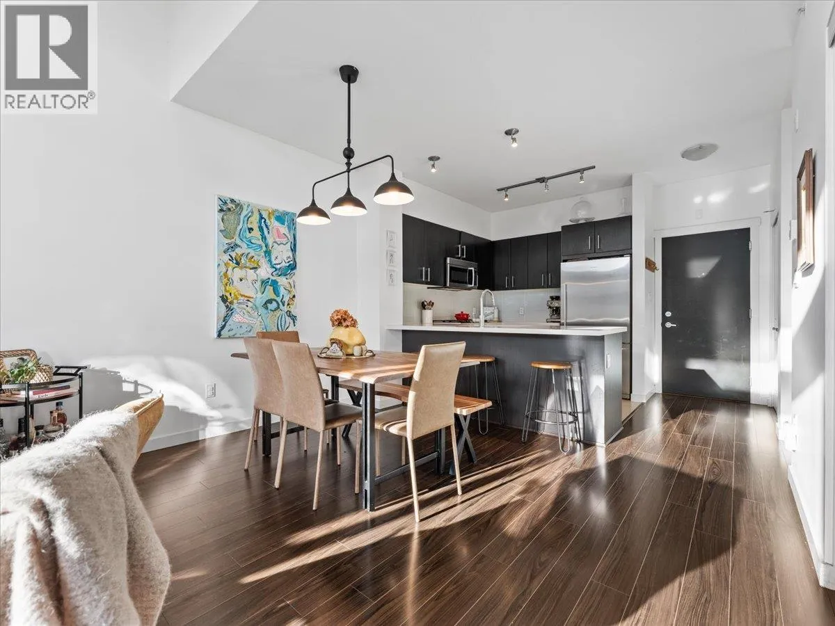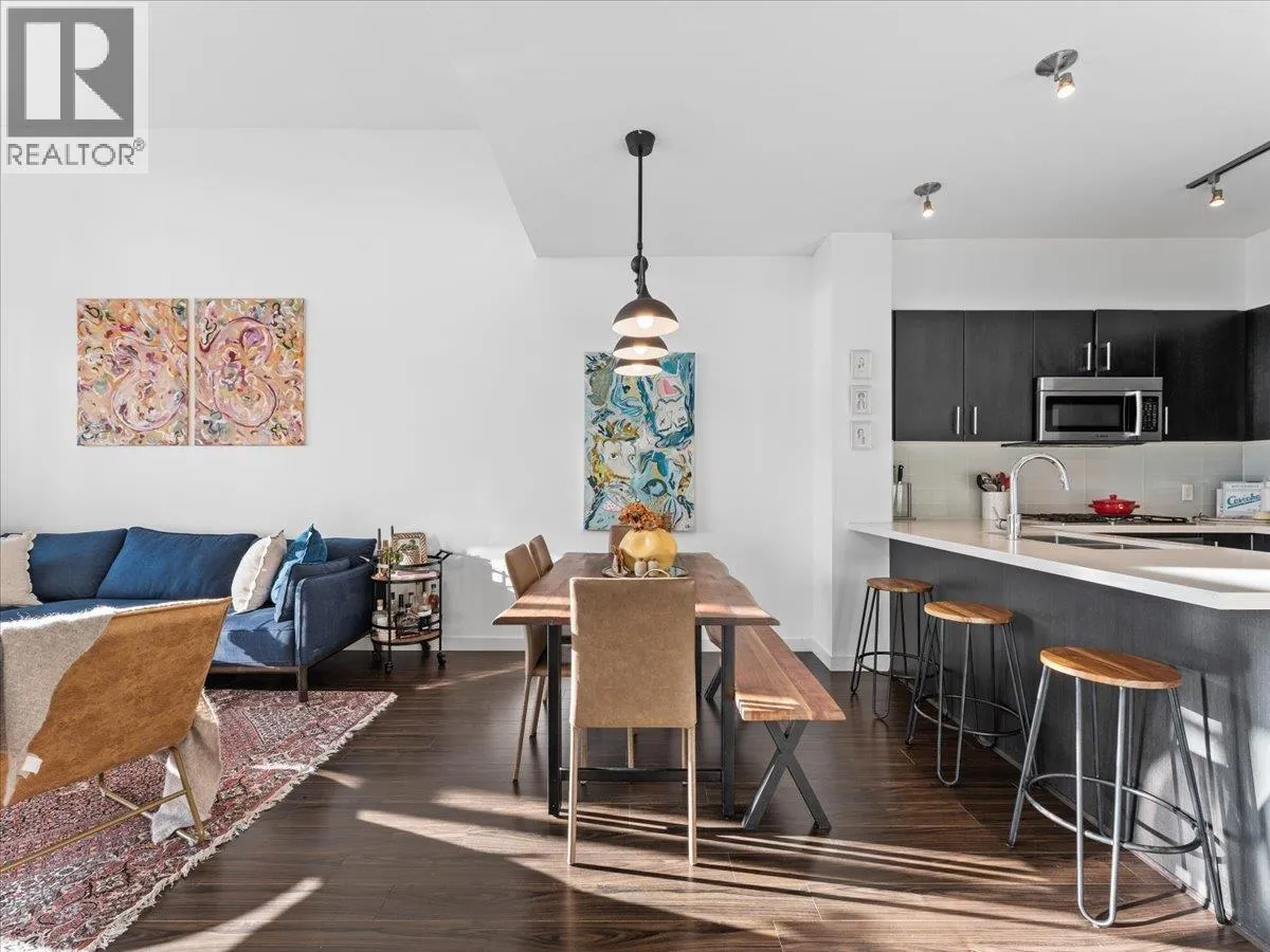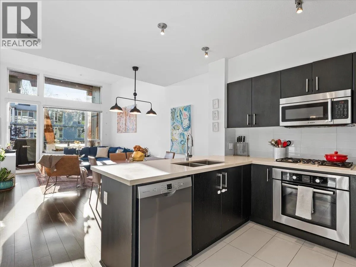 Experience the perfect blend of nature, urban living and luxury in the vibrant River District. This beautiful and spacious TOP FLOOR 2 bedroom condo boasts VAULTED CEILINGS and open concept living plan that seamlessly connects spacious dining/ living areas. The chef's kitchen is equipped with quartz counter tops, breakfast bar, gas range, designer appliances, & cabinets. Large primary bedroom features a walk in closet, spa- inspired ensuite, double vanity, soaker tub & separate shower. Den has been converted into multi- functional closet for extra storage. Step outside your covered balcony to enjoy morning coffee & outdoor entertaining all year round. Bonus 2 side by side parking & extra storage locker for convenience. Steps away from trails, shops, eateries- truly the perfect lifestyle. (id:27476)