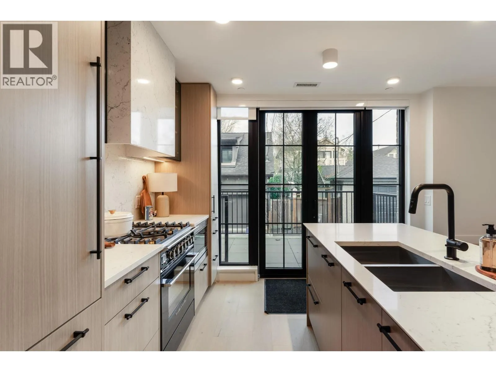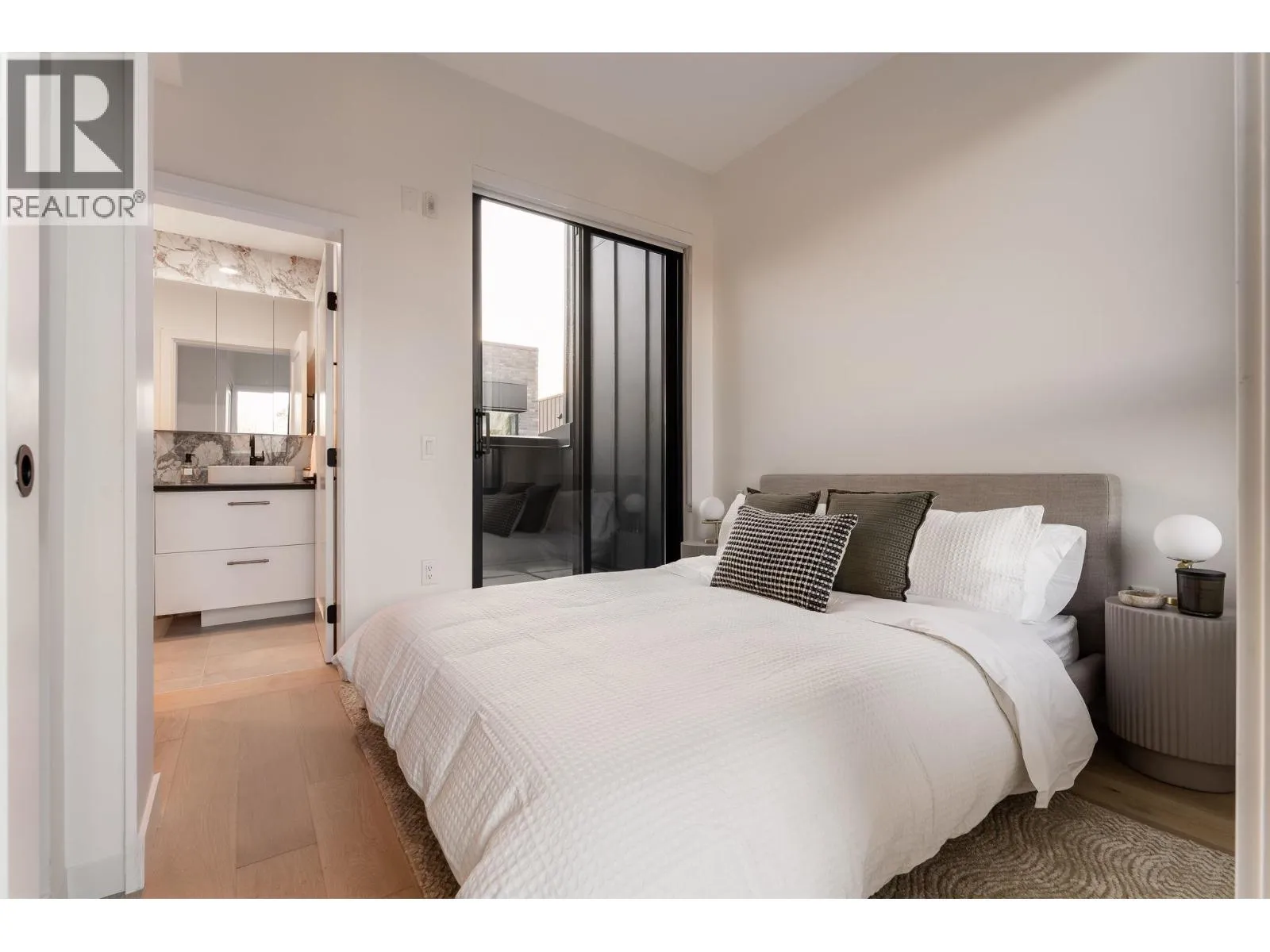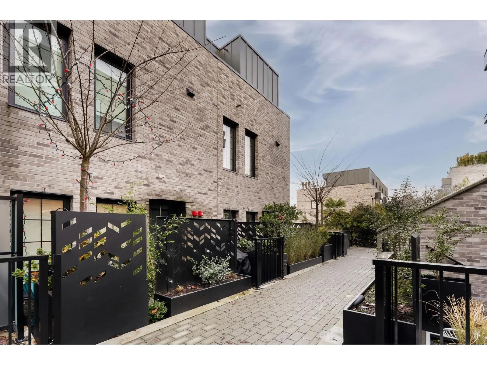 Brand new duplex-style townhome offering 3 bedrooms and 2.5 baths, attached to only one other home for a rare level of privacy in this boutique community. Enjoy both north and south exposure with a front and back patio, plus two private rooftop decks showcasing beautiful North Shore mountain and city views. The home features expansive 20 ft wide interiors, airy 9 ft ceilings on all three levels, AC, in-suite storage, and oak engineered hardwood throughout. The kitchen includes premium Fisher & Paykel appliances with an integrated fridge and dishwasher and a built-in wall oven. One EV-ready parking stall included. Located within King & Columbia, a boutique collection of modern brownstone homes in Riley Park, offering timeless architecture and thoughtful design. Just a 6-minute walk to the Canada Line and the shops and restaurants along Cambie and Main. (id:27476)