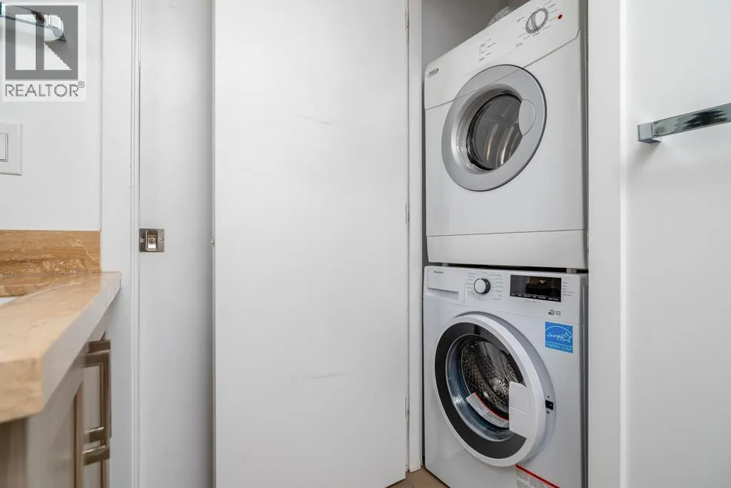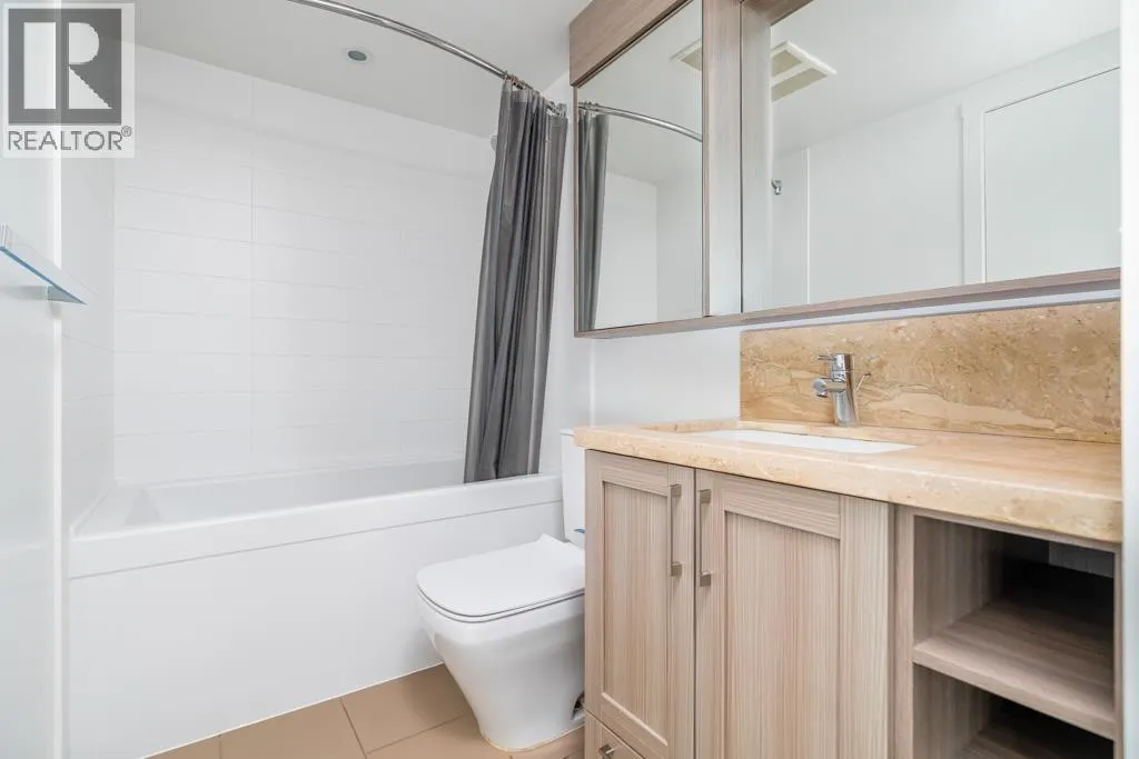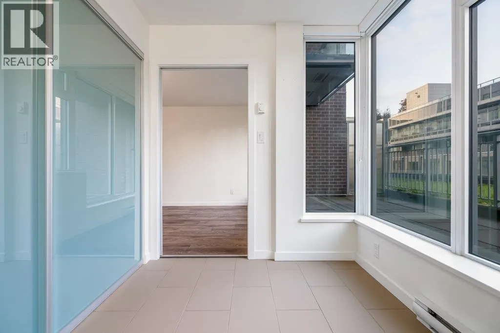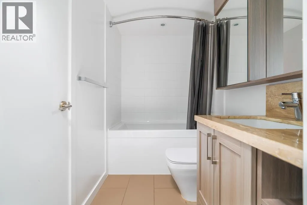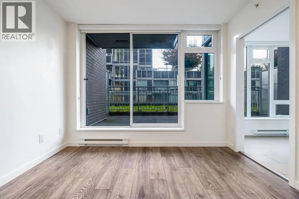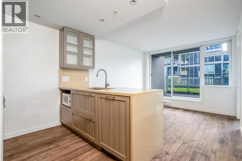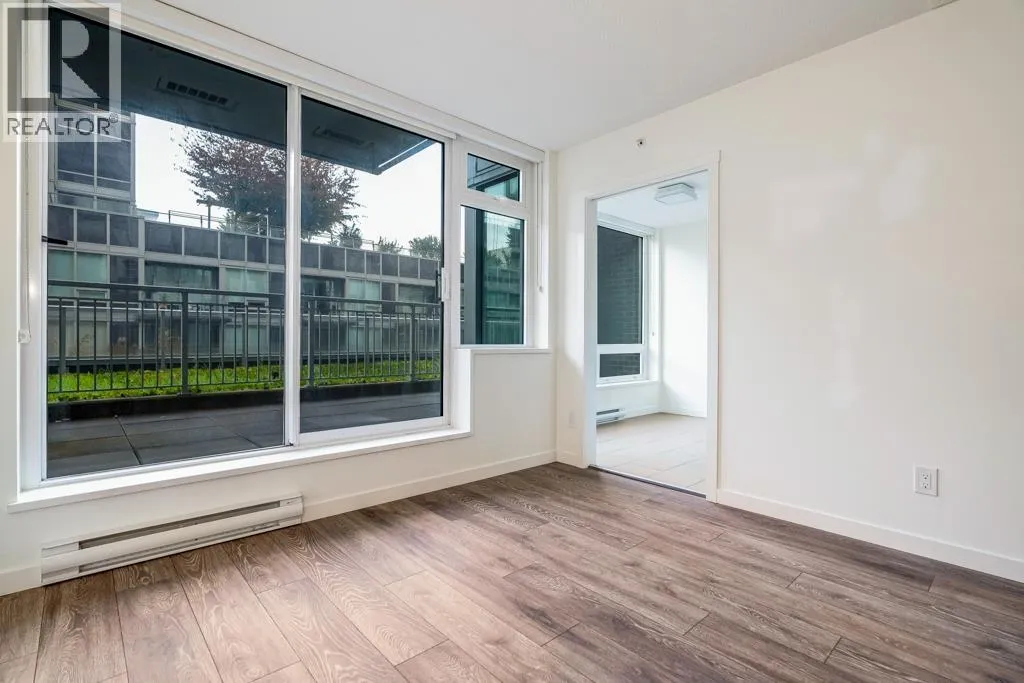 Wall Centre Central Park is a modern LEED Gold community in East Vancouver with green rooftops, gardens, bike paths, and great transit access. This 509 square ft 1-bedroom plus flex unit has engineered wood floors and a full-width concrete patio facing a landscaped courtyard. The kitchen includes shaker cabinetry, quartz counters, a breakfast bar, a Liebherr fridge, a Porter & Charles dishwasher, and a stainless steel gas range. The flex room near the foyer works well as an office or storage. The 4-piece bathroom features marble counters and a mirrored medicine cabinet. The bedroom has mirrored closets and sliding doors connecting to the dining area. Rent includes one parking stall and one storage locker, with the first month discounted to $2,100. (id:27476)