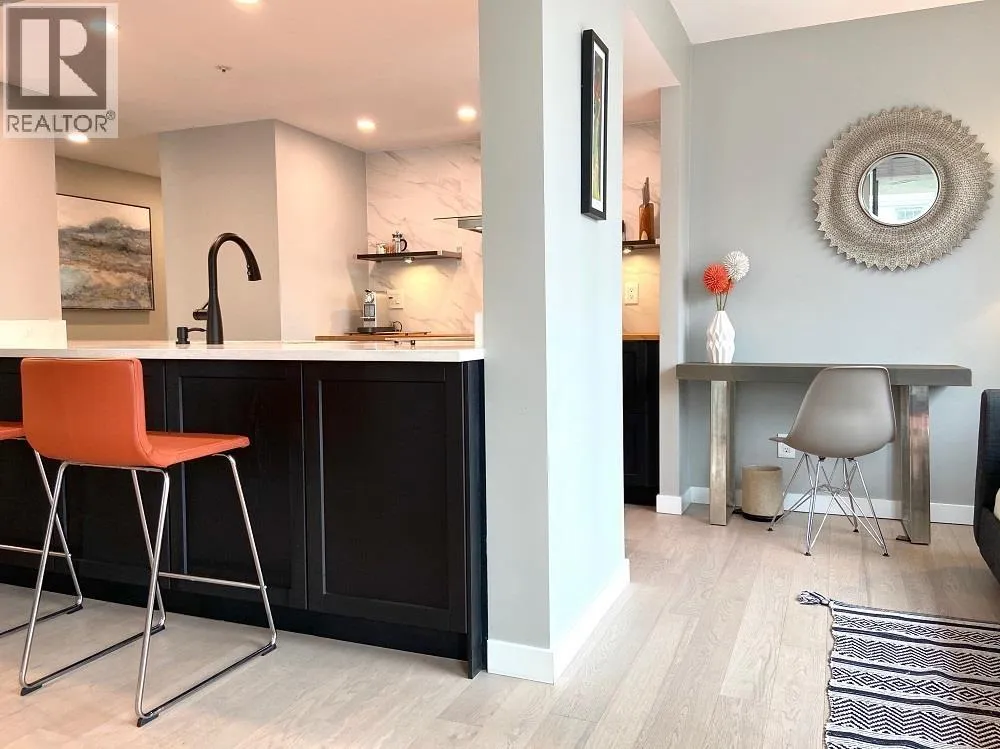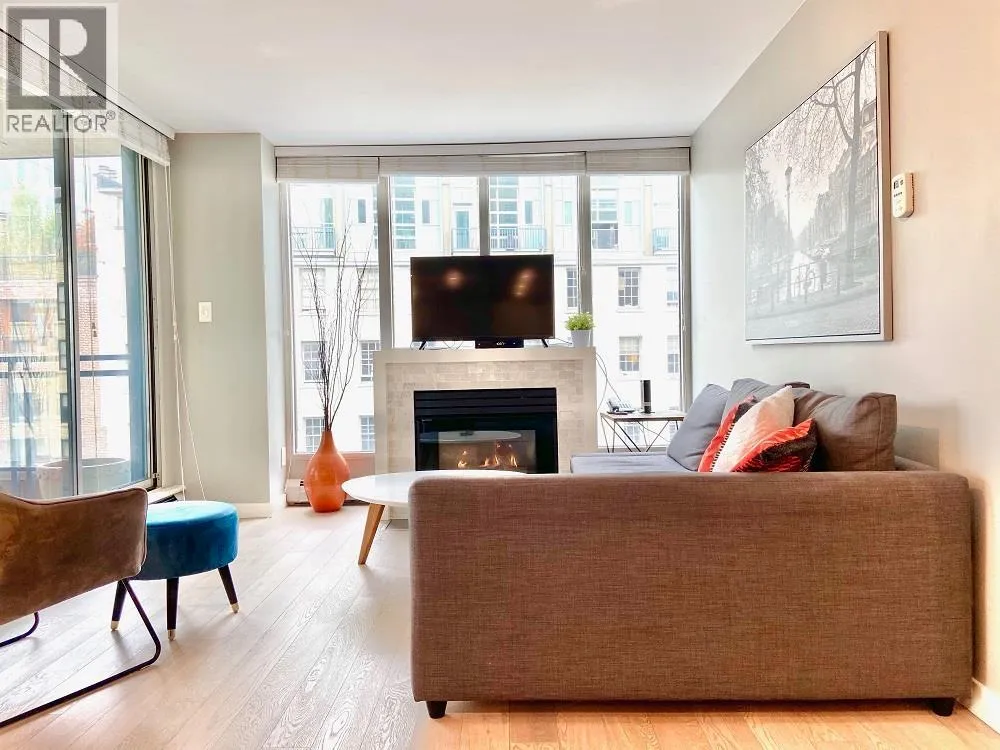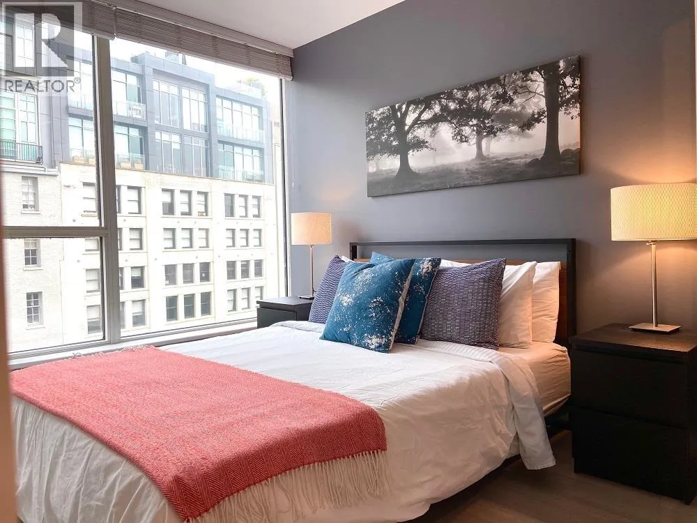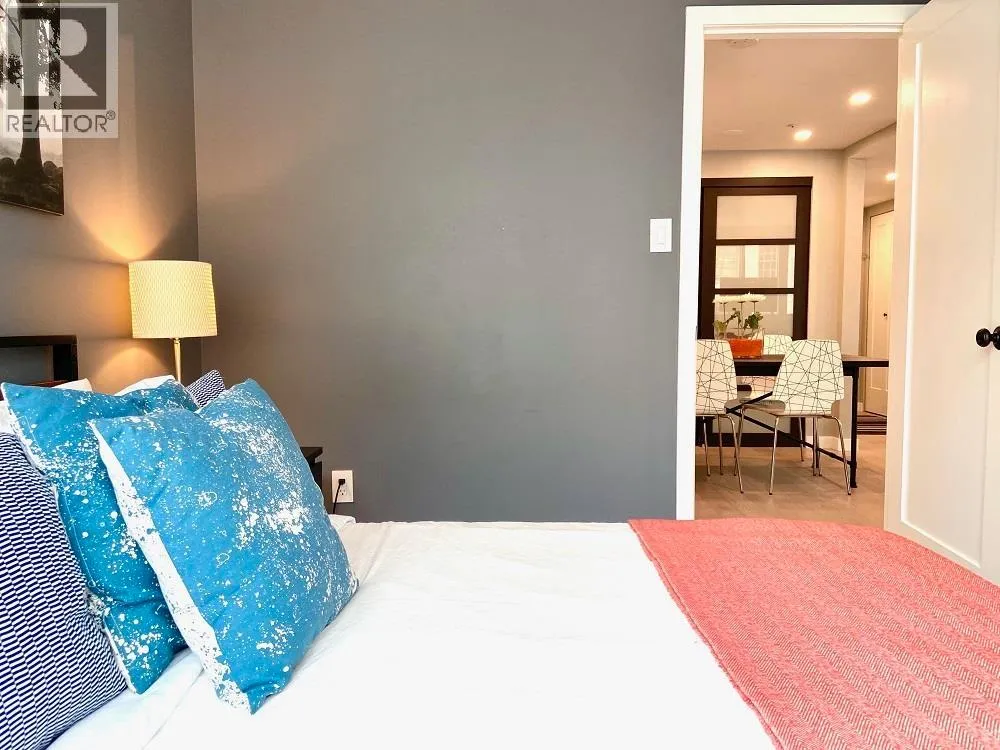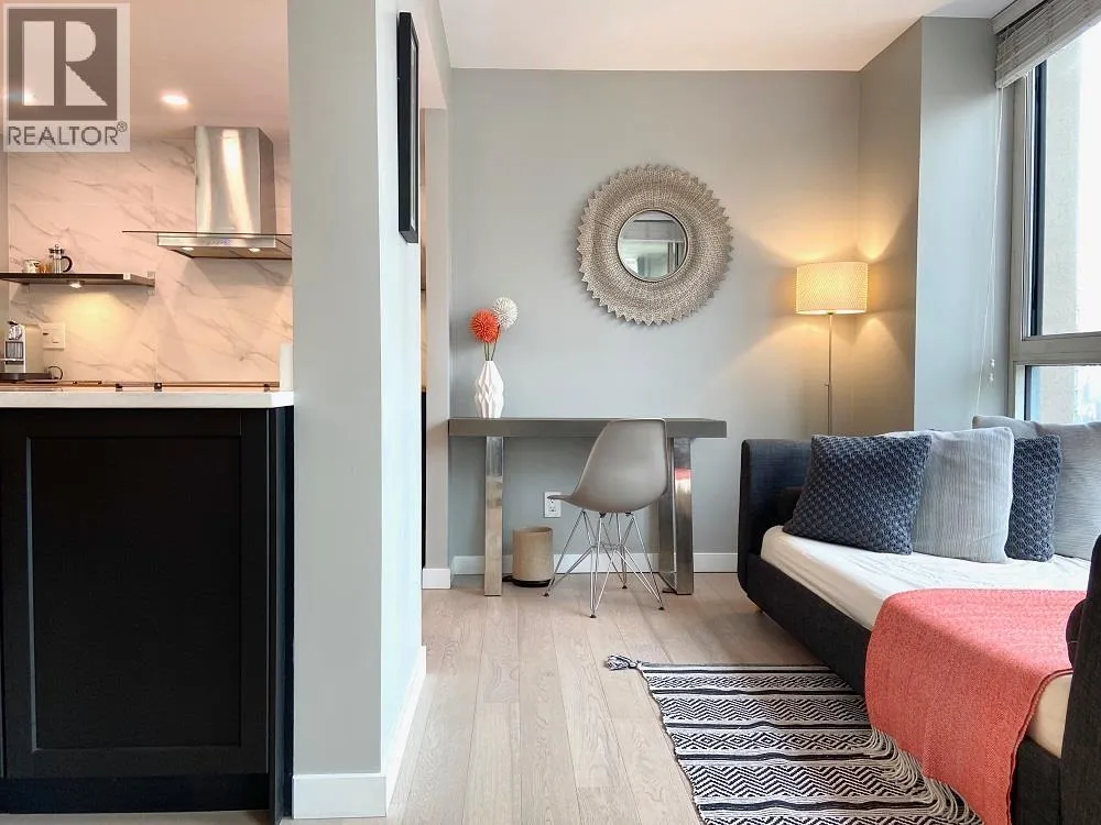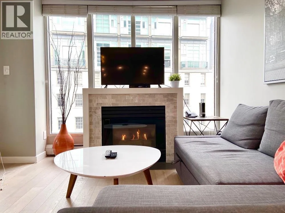 This spectacular 1 bedroom, 1 bathroom Vancouver Furnished Condo for Rent features beautiful modern décor, a large private balcony with city views, hardwood flooring, large windows, a den area and perfect amount of living space. Find a fireplace anchoring the main living space, an L-shaped sofa, modern home accents and access to the balcony. This open concept design enjoys a dining area complete with seating for 4 and access to a brilliant kitchen. The kitchen features beautiful dark cabinetry, a marble backsplash, quartz and wood countertops, a breakfast bar with seating for 2 and upscale Subzero and Bosch appliances. Find the den area with a perfect workstation and chaise lounger and enjoy the flexibility in this space. (id:27476)