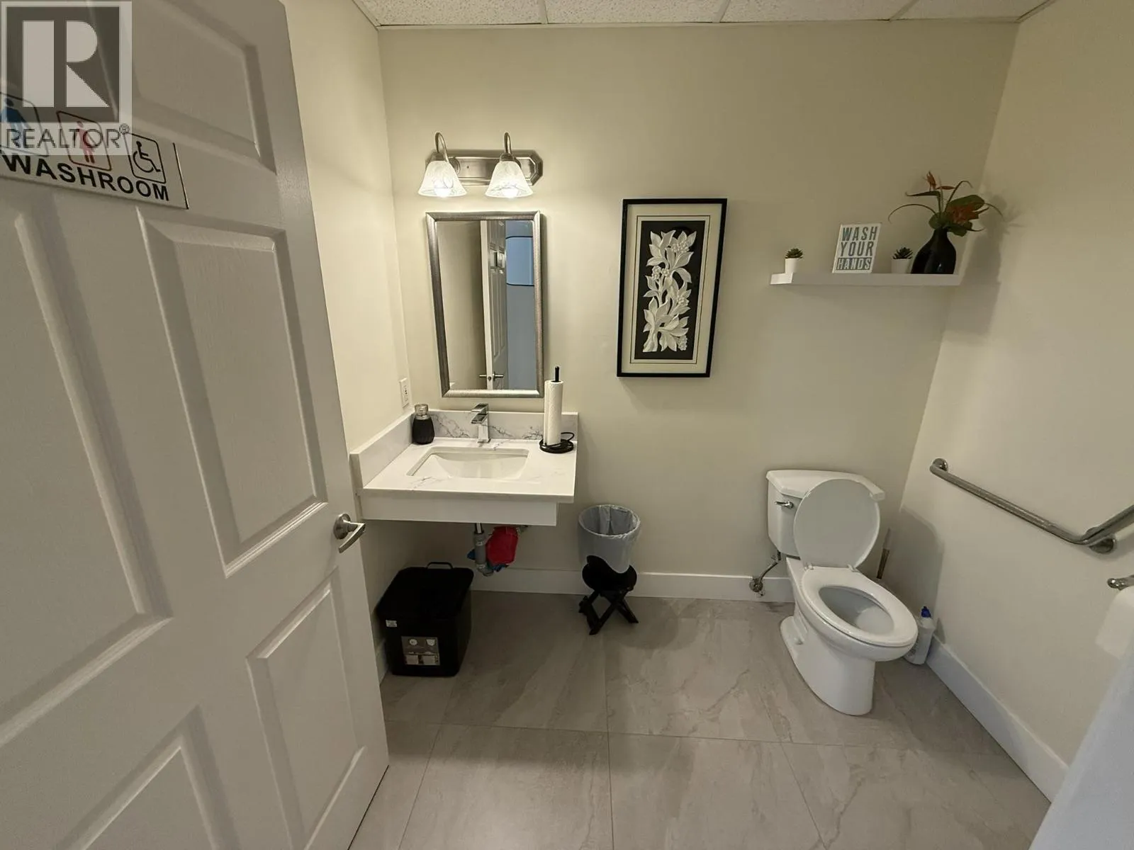 Amazingly well-improved retail unit with high exposure, located at one of the busiest intersections in East Vancouver. Turn-key and ideal for physiotherapy, beauty or hair salon uses. The versatile improvements also suit a professional street-front office. Features include one accessible washroom with in-suite washer and dryer, plus one assigned covered parking stall. (id:27476)