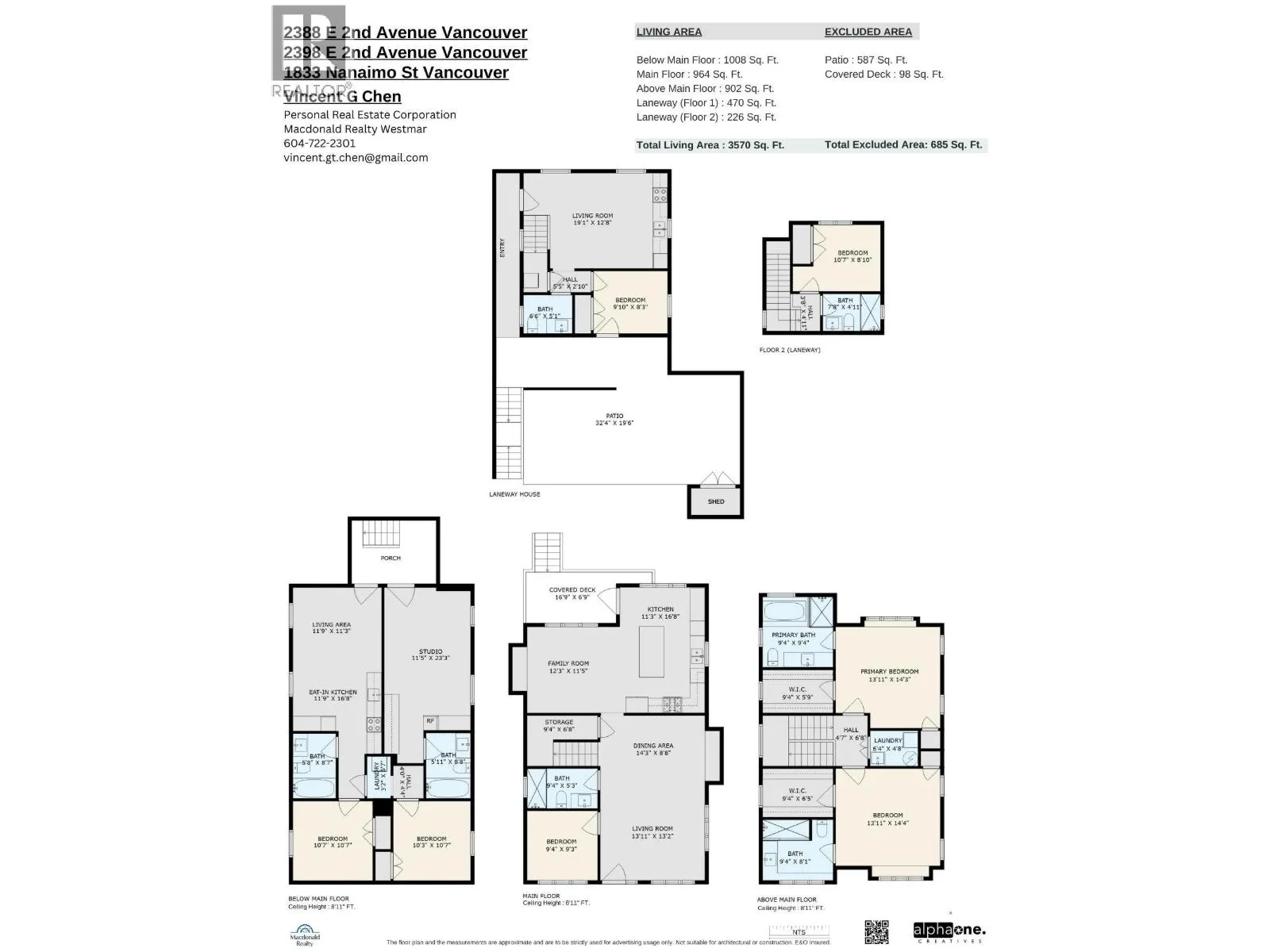 Versatile & Modern Vancouver Home with Suites & Laneway situated on a 33x122' lot in convenient Grandview-Woodland. This property offers incredible value with multiple living options and strong rental income. The main house features radiant floor heating and Central A/C. It has 3 bedrooms, 3 full bathrooms, including two primary suites upstairs, a third bedroom on the main, 2 living areas, stylish kitchen with upscale appliances and ample storage. A covered deck leads to a sunny, south-facing tiled patio, perfect for outdoor living. Below, a 2-bedroom basement suite and a bonus self-contained studio with full bath. A cozy 2 level laneway house with 2 bedrooms and 1.5 bath sits at the back. Parking pad for 1 car next to laneway with EV charger. (id:27476)