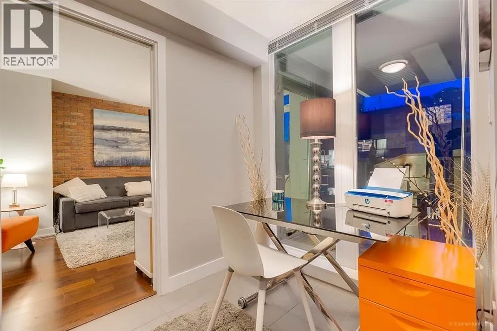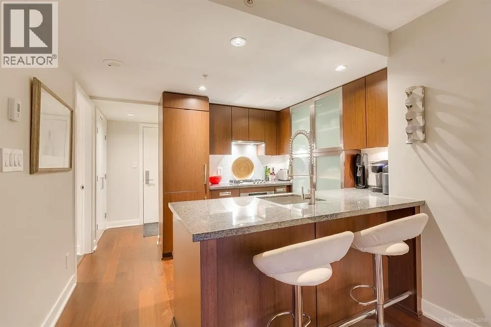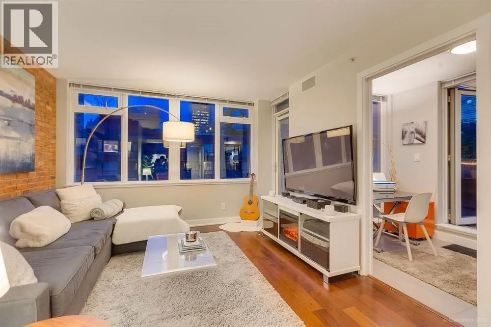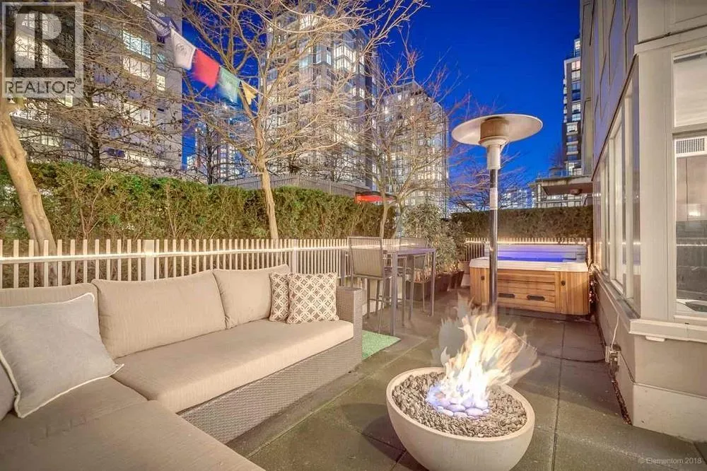 This Yaletown Vancouver furnished condo rental at The Donovan is a rare find with a luxury patio and an exclusive hot tub. This 1 bedroom and den corner suite boasts sweeping hardwood floors, beautifully offset by the intelligent lighting and generously sized windows that allow ample natural light inside. The living area is furnished with a pull out fabric sectional, shag carpet and flatscreen TV for your entertainment. There is also a fireplace that makes a welcome addition in the cooler months. The gourmet kitchen comes fully equipped with stainless steel appliances, an abundance of millwork cabinetry and a kitchen island, doubling as a breakfast bar with seating for 2. The bedroom offers a sizable bed, luxurious linens and plenty of built-in storage. (id:27476)