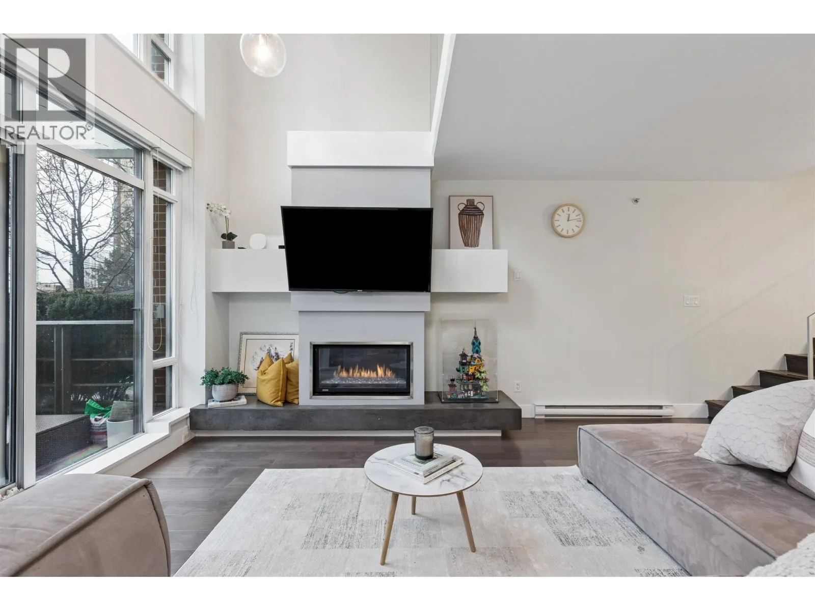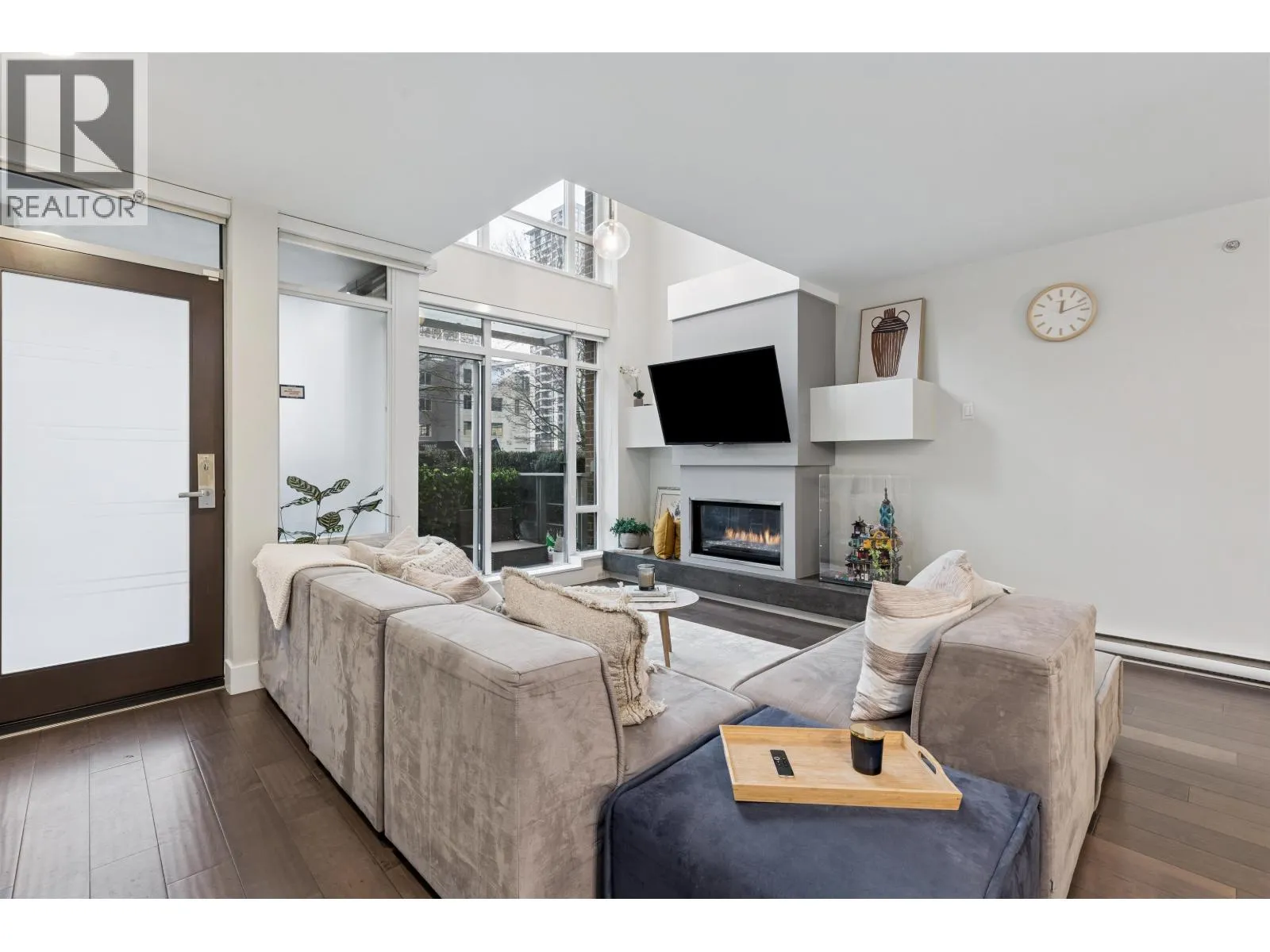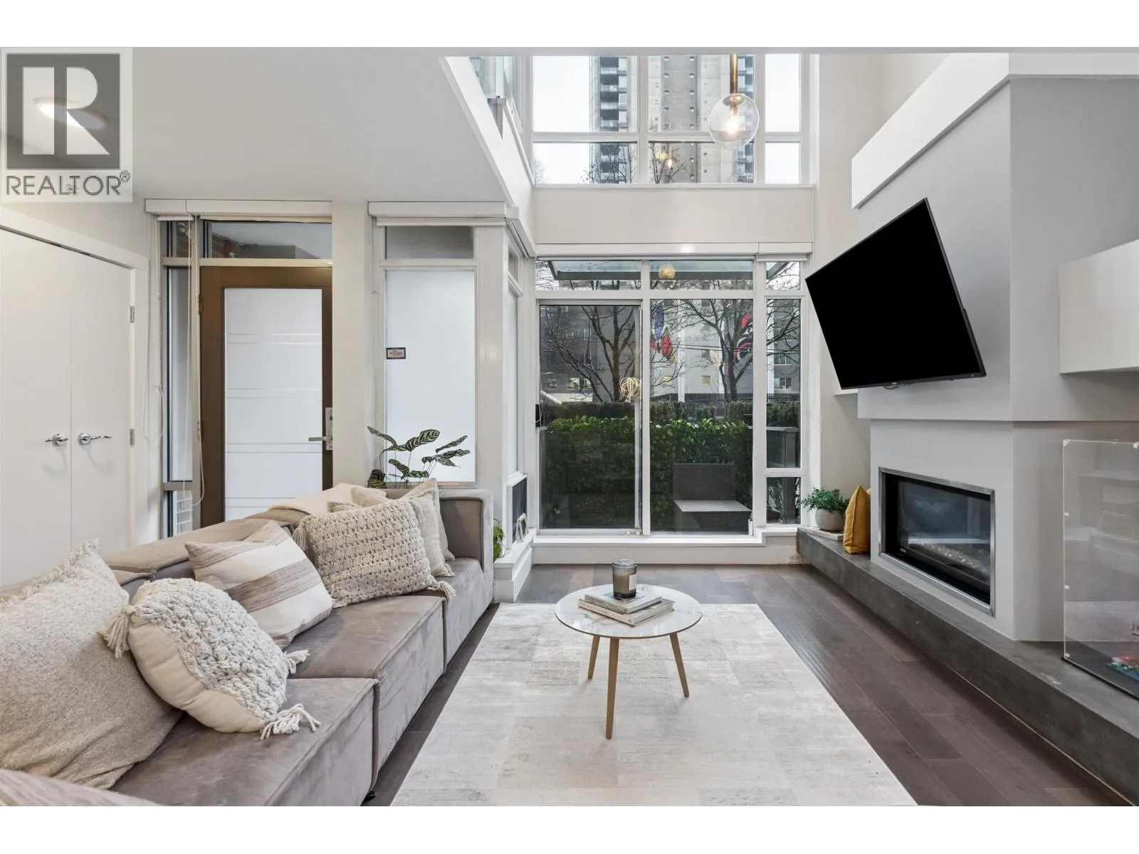 Located on the BEST tree lined street in Downtown, this rare two-level LIVE/WORK home at Dolce by Solterra offers nearly 1,400 sq. ft. of flexible, modern living. Situated right across from the BRAND new park and Cafe. Featuring 2 bedrooms, a flex space, 3 bathrooms, and dual private entrances, this residence blends style with function. Inside, enjoy premium appliances, a gas fireplace, in-suite laundry, and two balconies, along with one parking stall and a storage locker. Residents have access to full-service amenities including concierge, fitness centre, steam room, hot tub, children´s play area, and a spacious lounge with outdoor common spaces-all just steps from Vancouver´s best dining, shopping, and entertainment. (id:27476)