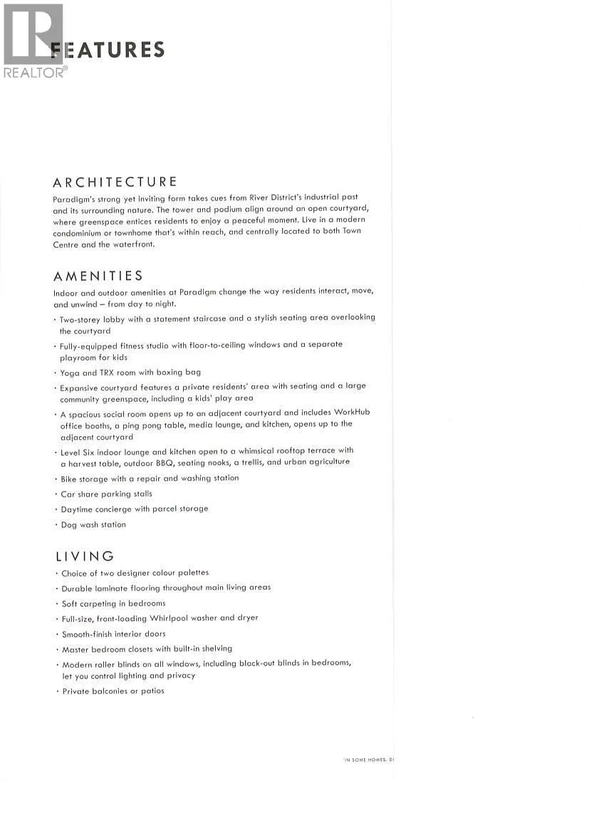 Welcome to Paradigm! This charming 1BR, 1 Bath & Den is well located in the popular River District. The kitchen is adorned with a full suite of KitchenAid stainless steel appliances & quartz counter top. This unit comes with 1 parking and 1 full size storage. Steps to shopping, restaurants, banking and recreation. Enjoy the tranquility and serene views while you take a stroll, jog or walk your dog along the River Front Park Walkway. Amenities include fully equipped gym, Yoga & TRX room with boxing bag, WorkHub office booths, ping pong, & media lounge. The Social Lounge with a kitchen that opens to a rooftop terrace & BBQ area, bike storage with repair & washing station, daytime concierge & dog washing station. (id:27476)