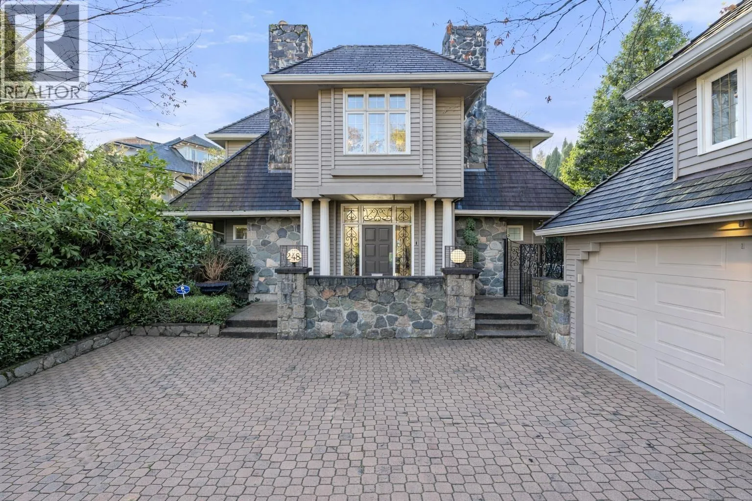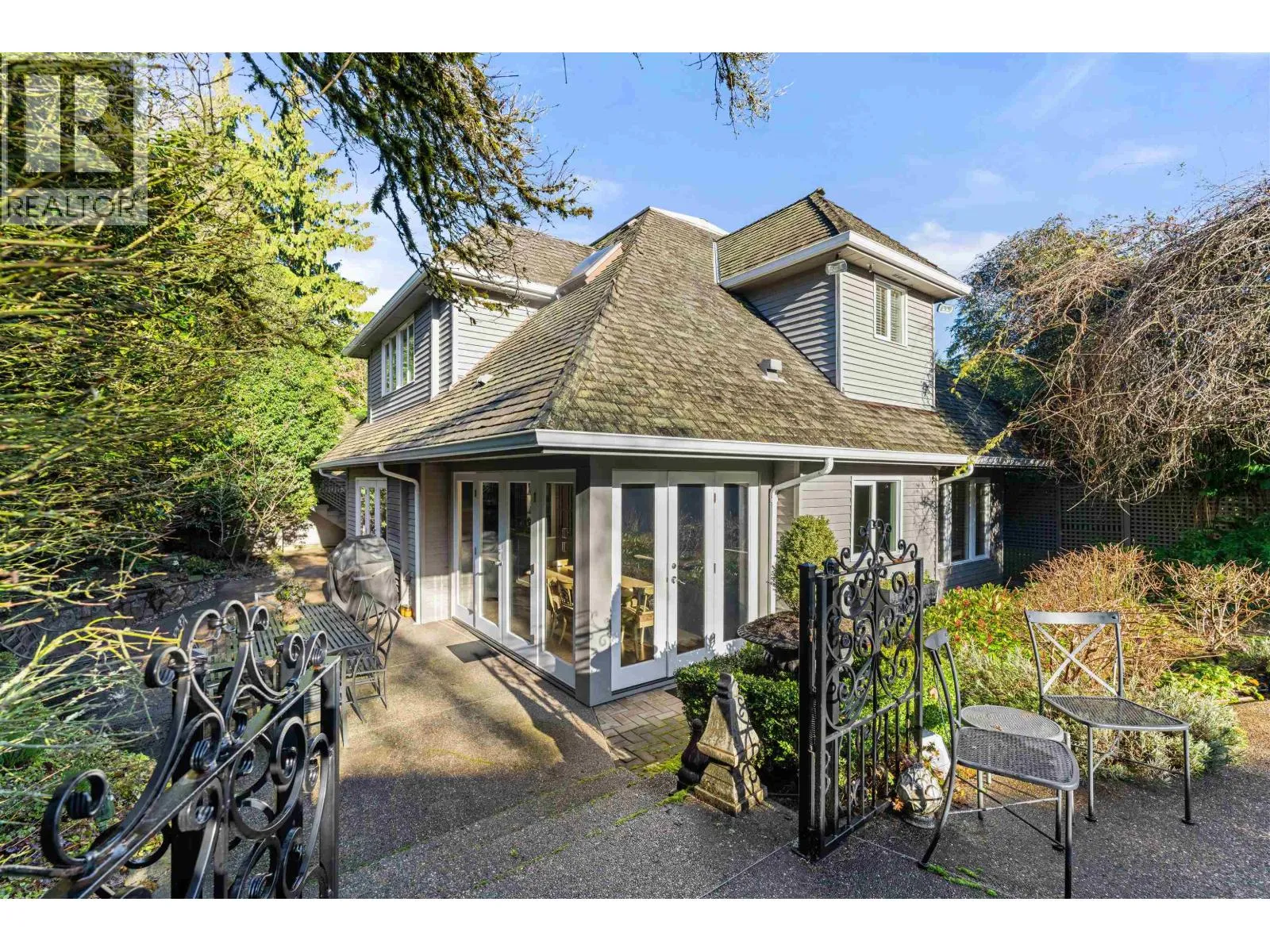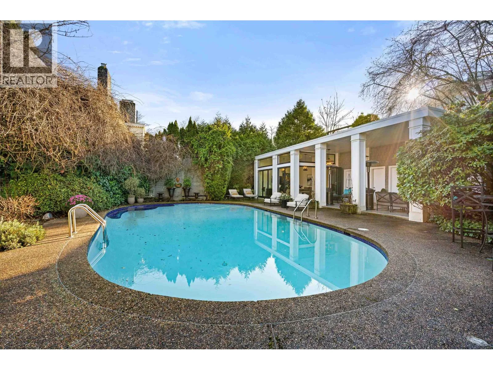 A rare offering in prestigious First Shaughnessy. This elegant coach house provides exceptional living space combined with extraordinary outdoor entertaining areas. Gracious principal rooms feature hardwood floors, crown mouldings, and garden outlooks, while the well-appointed kitchen opens directly to outdoor entertaining areas. Three generous bedrooms up include a sumptuous primary suite with marble ensuite and walk-in closet, plus a finished lower level with rec-room, office, and wine room. Private grounds feature a swimming pool, covered cabana, and fully equipped glass enclosed gym, three piece pool bathroom, and storage. A detached garage with artist studio above, secure gated entry, and ample parking complete this exceptional offering. (id:27476)