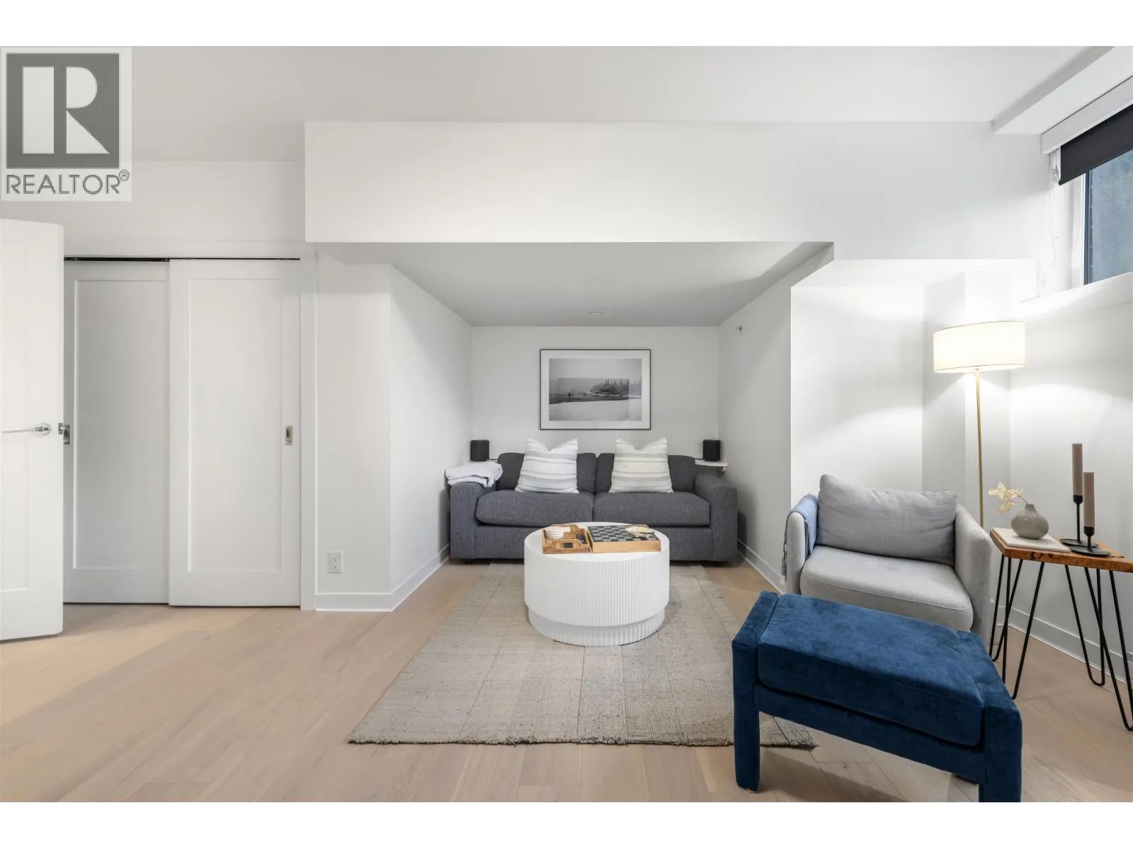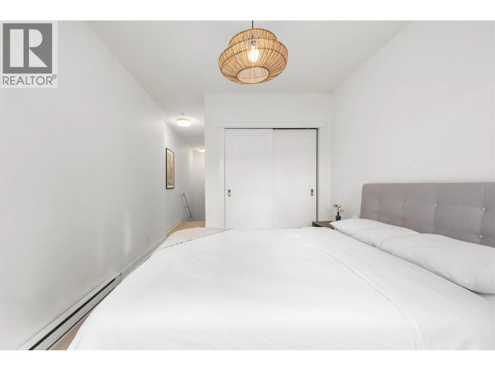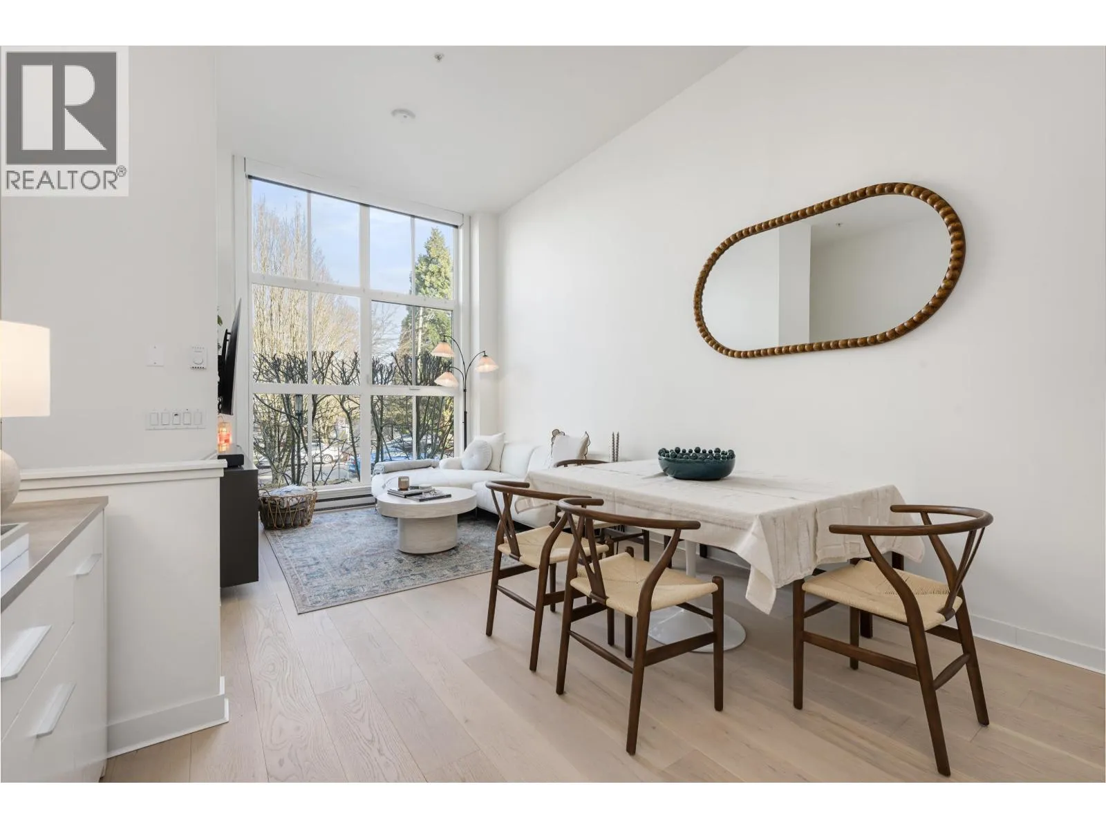 Welcome to Mason by Boffo, a boutique collection of modern townhomes located across from Trout Lake Park. This bright, stylish home features private street entry, soaring 12-foot ceilings, oversized windows, and open-concept living. The sleek kitchen includes quartz counters, marble tile backsplash, matte lacquer cabinets, and premium appliances. Enjoy a sun-soaked west-facing patio off the primary suite and a second bedroom with space for a home office. Updates include new hardwood floors throughout, custom built-in closets, and a new hot water tank. Includes one secure parking stall, storage locker, and bike storage. Steps to Trout Lake, trails, Commercial Drive, and SkyTrain. A must-see! (id:27476)