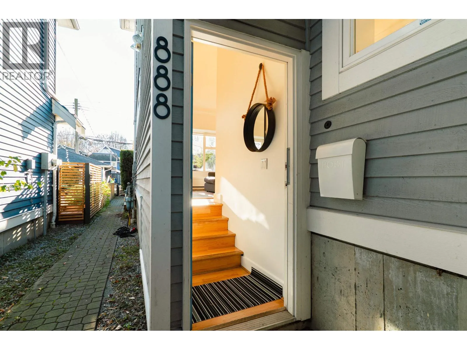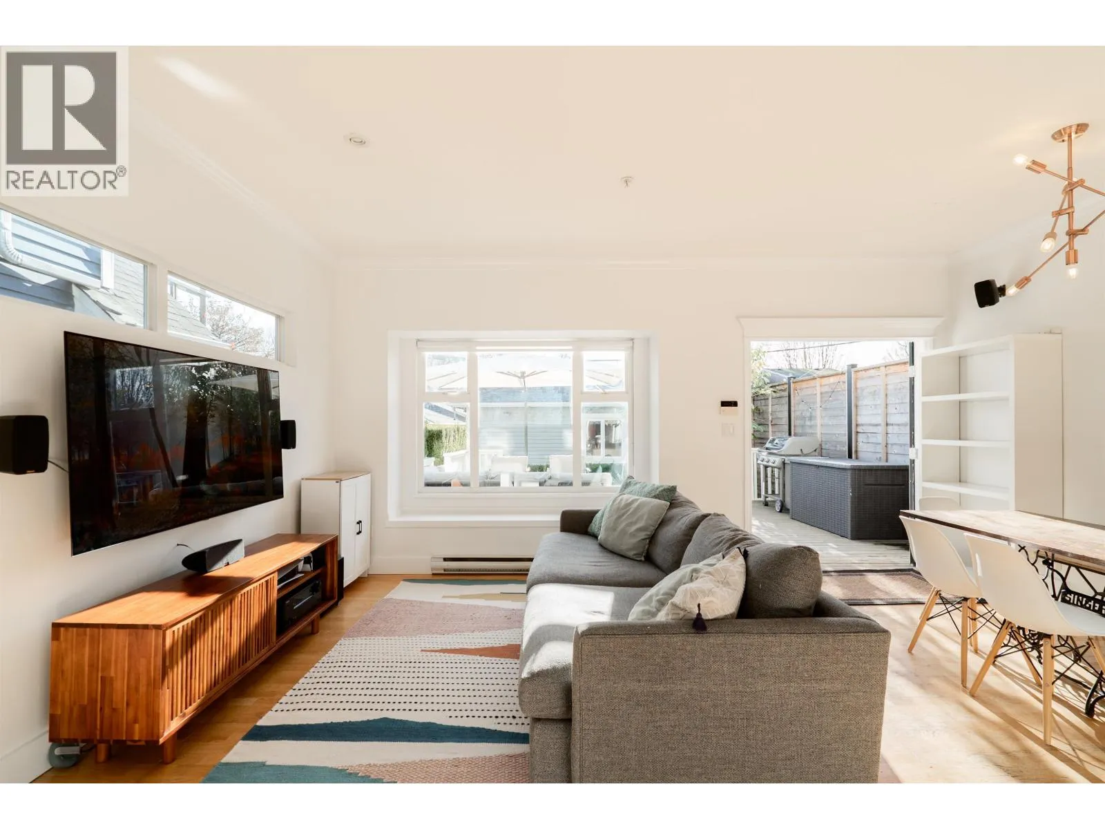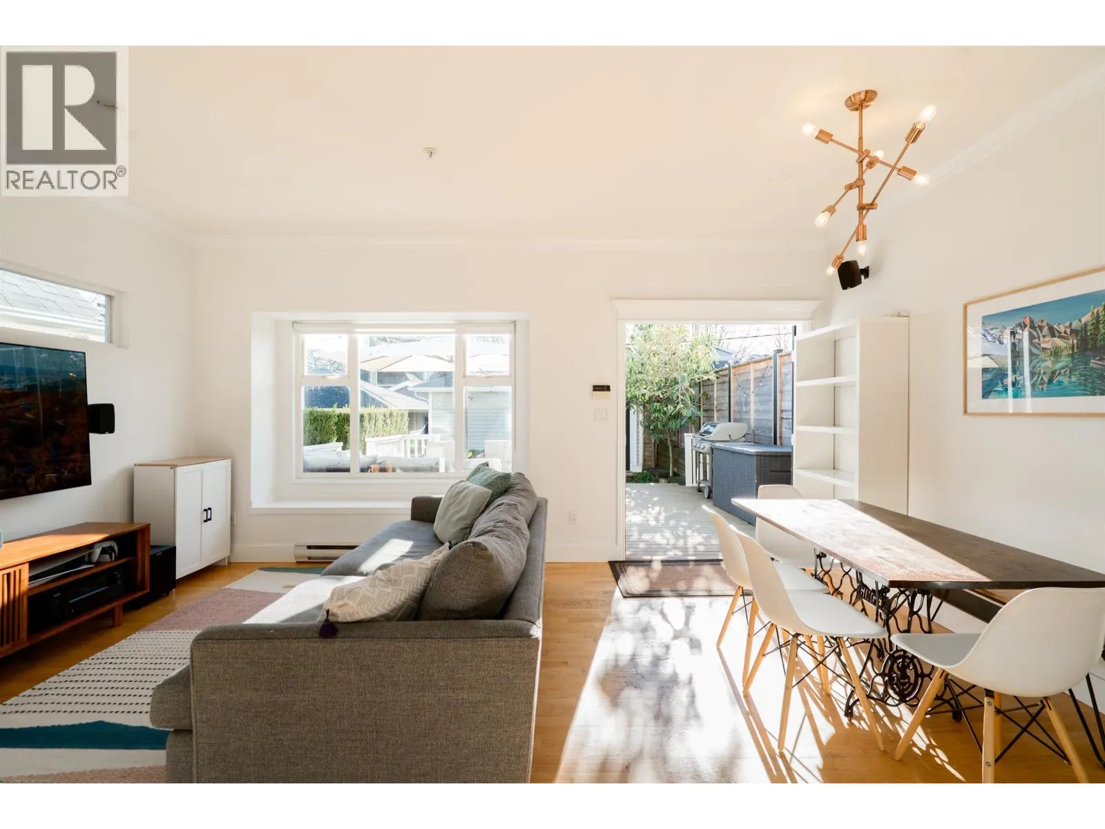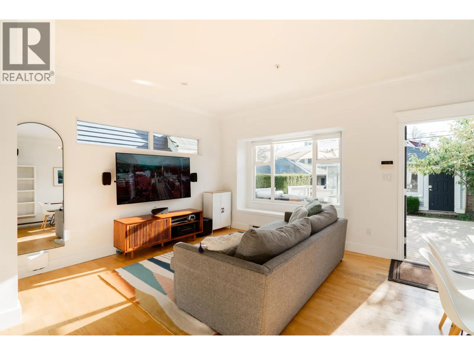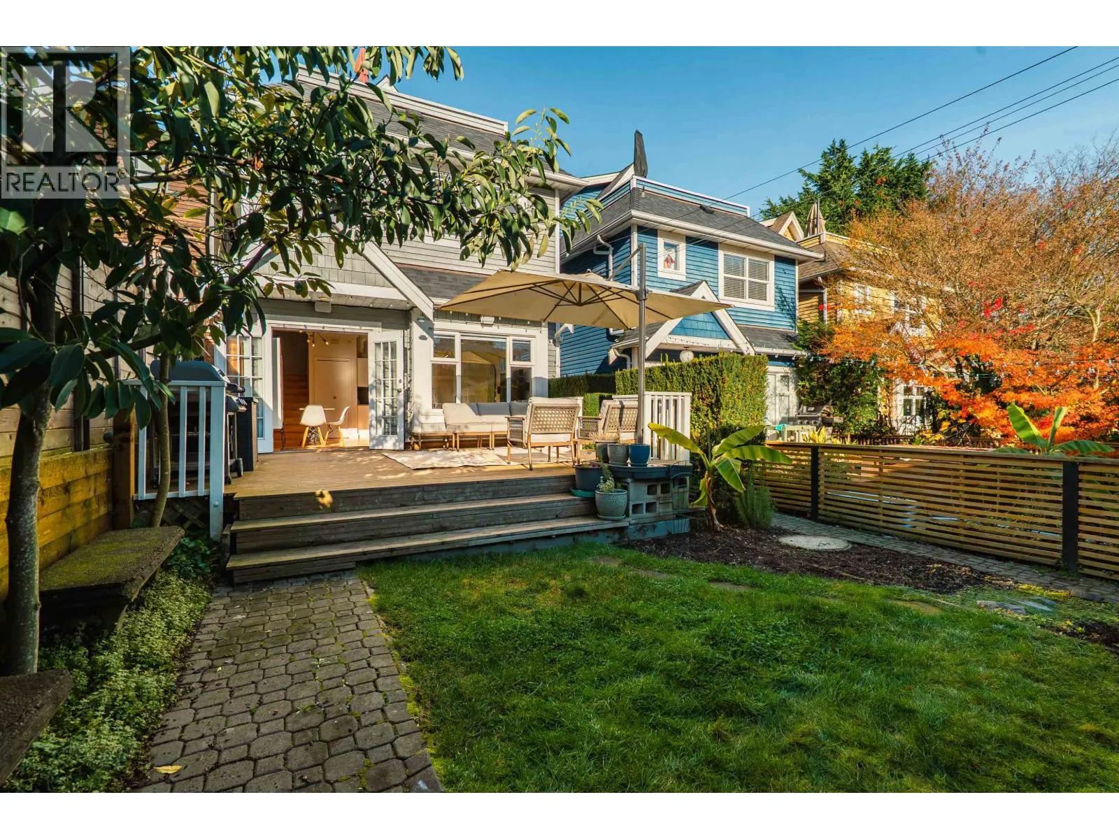 Lucky 8s! Sun-drenched back half duplex offers a peaceful oasis in the heart of the city. The main level is thoughtfully designed for effortless entertaining, with an open kitchen, dining, living flowing to a sunny south-facing deck & fenced yard. Upstairs a primary with ensuite & walk-in closet plus a second bedroom & bath. Top floor offers flexible space for a 3rd bedroom or office complete with a large patio. Detached garage serves as a finished office/gym & can easily revert to parking. Upgrades include new roof, fence, retaining wall, hot water tank, 2 decks, & indoor-outdoor sound system. On a quiet bike path, walk or ride to the seawall, DT, East Van shops & dining in minutes. Surrounded by parks, cozy cafe on the corner & French immersion elementary school. (id:27476)