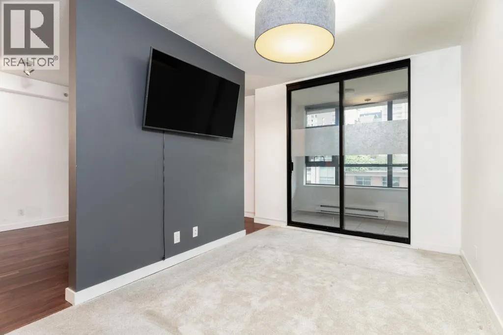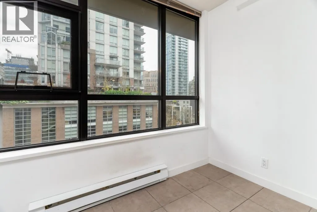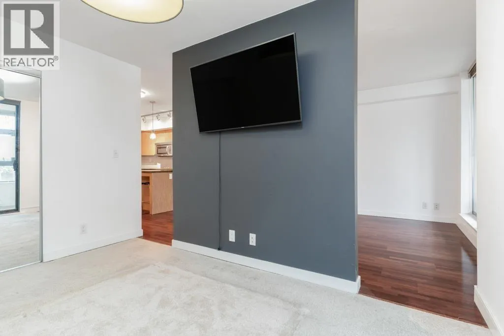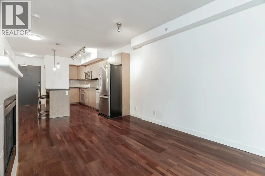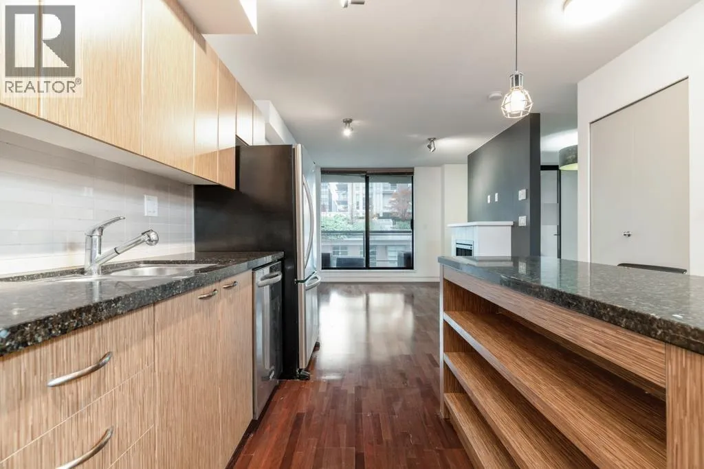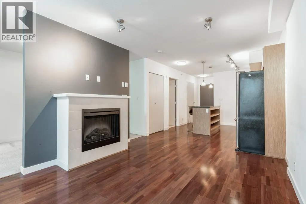 This 635sf 1 bedroom + den + flex + balcony condo has a unique and functional layout and engineered wood floors in living areas. The foyer takes you straight into the open rectangular living dining room with a fireplace, track lights and access to the covered balcony. The open kitchen features stainless steel appliances, a long row of veneer cabinets, granite countertops, tiled backsplash, and a center island with breakfast bar and pendant lights. Next to the living room is the unique semi-open bedroom with mirrored closet doors, ceiling chandelier, and a sliding glass door access to the den. The 4 pcs bathroom comes with end to end mirror, granite countertop, above counter sink, veneer cabinets and separate tub and shower stall. Rent includes 1 locker and 1 parking stall. (id:27476)