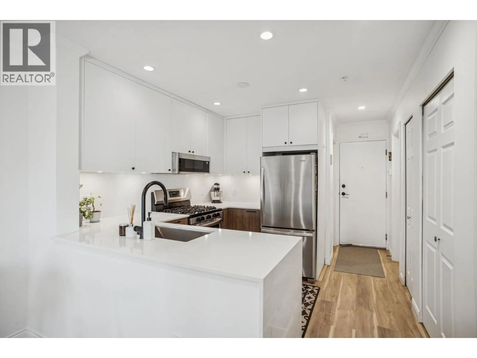 Welcome to Vintage Eastside in the heart of Fraser. This beautifully renovated north-facing home offers a quiet, light-filled interior. The kitchen features custom wood cabinetry with soft-close hardware, waterfall quartz countertops, stainless steel appliances with a gas range, and a honeycomb backsplash. Wide-plank vinyl flooring, smooth ceilings, and recessed lighting complete the modern feel. The smart layout offers separated bedrooms, a cozy gas fireplace, bright living space, and generous in-suite storage. Enjoy a private balcony ideal for summer BBQs. Well-maintained, fully rainscreened building with EV charging, bike storage, and a shared garden. Pet-friendly with 1parking stall. Steps to transit and walkable to Mount Pleasant's "Golden Trainagle"(Savio Volpe, Matchstick & more). (id:27476)