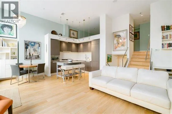 Rarely available townhouse in James! The perfect pied a terre. NW exposure with City, False Creek and mountain views.from 12 ft floor to ceiling windows. Walk-able Olympic Village area is steps to the Seawall, eateries, breweries, farmers market, parks and transit. Freshly painted and squeaky clean its ready for your decorating ideas. Heat pump/air unit replaced in 2025. Main floor has spacious open plan kitchen, dining and living room, bedroom and walk-in closet half level up with bathroom, storage, laundry and flex room half level down. 2 parking, 1 locker. Plus the bonus of full amenities such as; guest room, rooftop garden and lounge, fitness centre and concierge. Pet friendly building. Cityhome with the convenience of ground floor sidewalk access. Perfect for walking Fido without the hassle of an elevator. Come and check it out Sunday February 15th from 2 to 4. (id:27476)