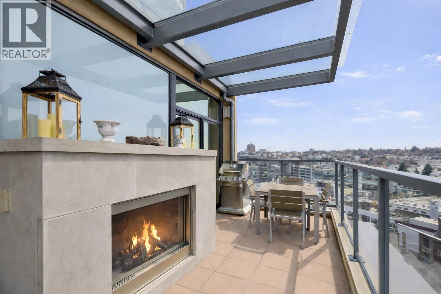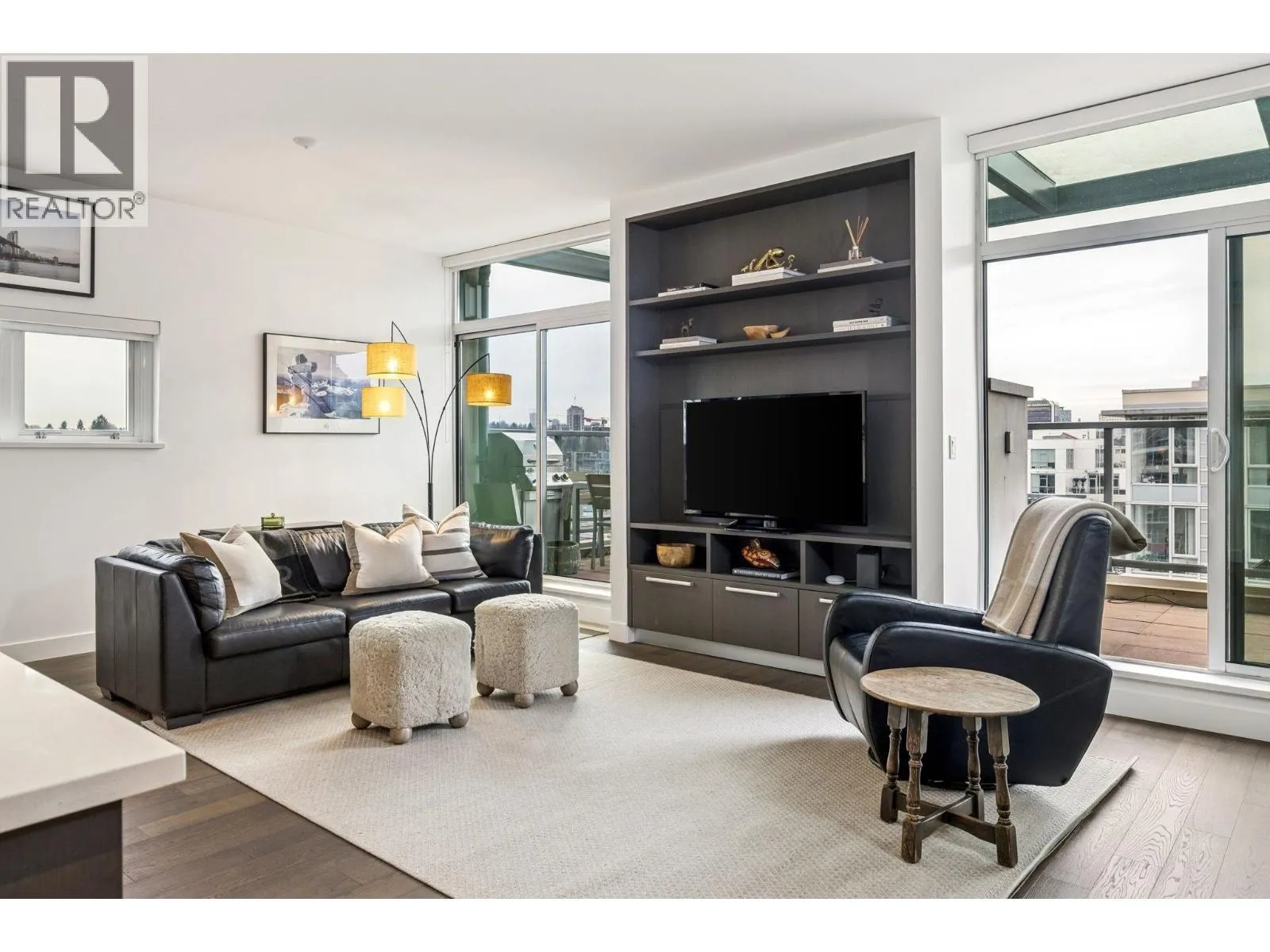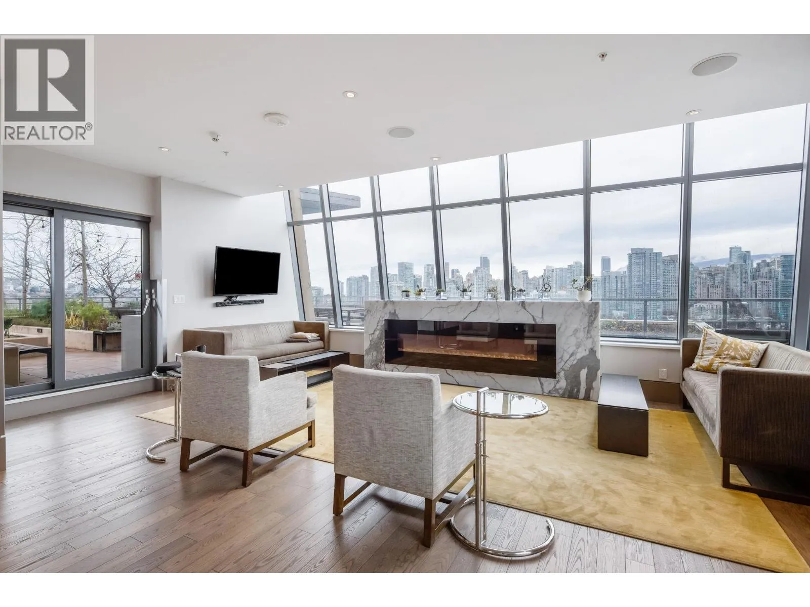 Luxurious 2 BED, 2 BATH + DEN with WATER VIEWS at 'The James' by Cressey offers over 1,200 sqft of thoughtfully designed, expansive interior living. Feat. incl, sleek hardwood flooring, high-end S/S & Miele appliances, A/C, radiant in-floor heating, 2 integrated beverage fridges, custom millwork, extensive in-suite storage & primary walk-in closet, & a dedicated pantry. Floor-to-ceiling windows provide western exposure with open views of Downtown, False Creek, and Mount Pleasant. A massive private terrace with a gas fireplace creates an exceptional extension of the living space, ideal for entertaining. Includes two parking stalls with EV capability, concierge, gym, and rooftop terrace & lounge with BBQ area. Impeccably maintained, steps to the seawall & endless restaurants + cafes. A true gem. OPEN HOUSES SAT/SUN FEB 7/8, 2-4PM. (id:27476)